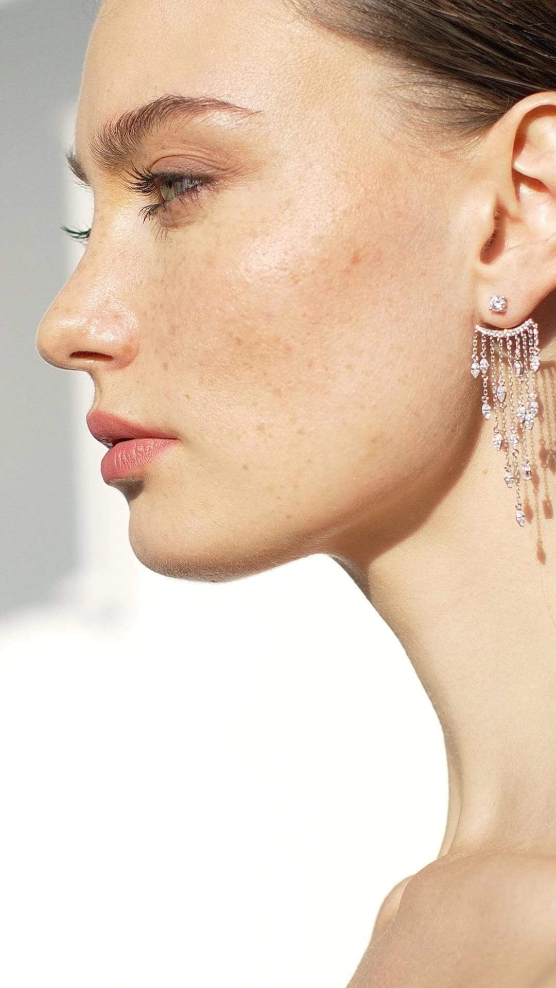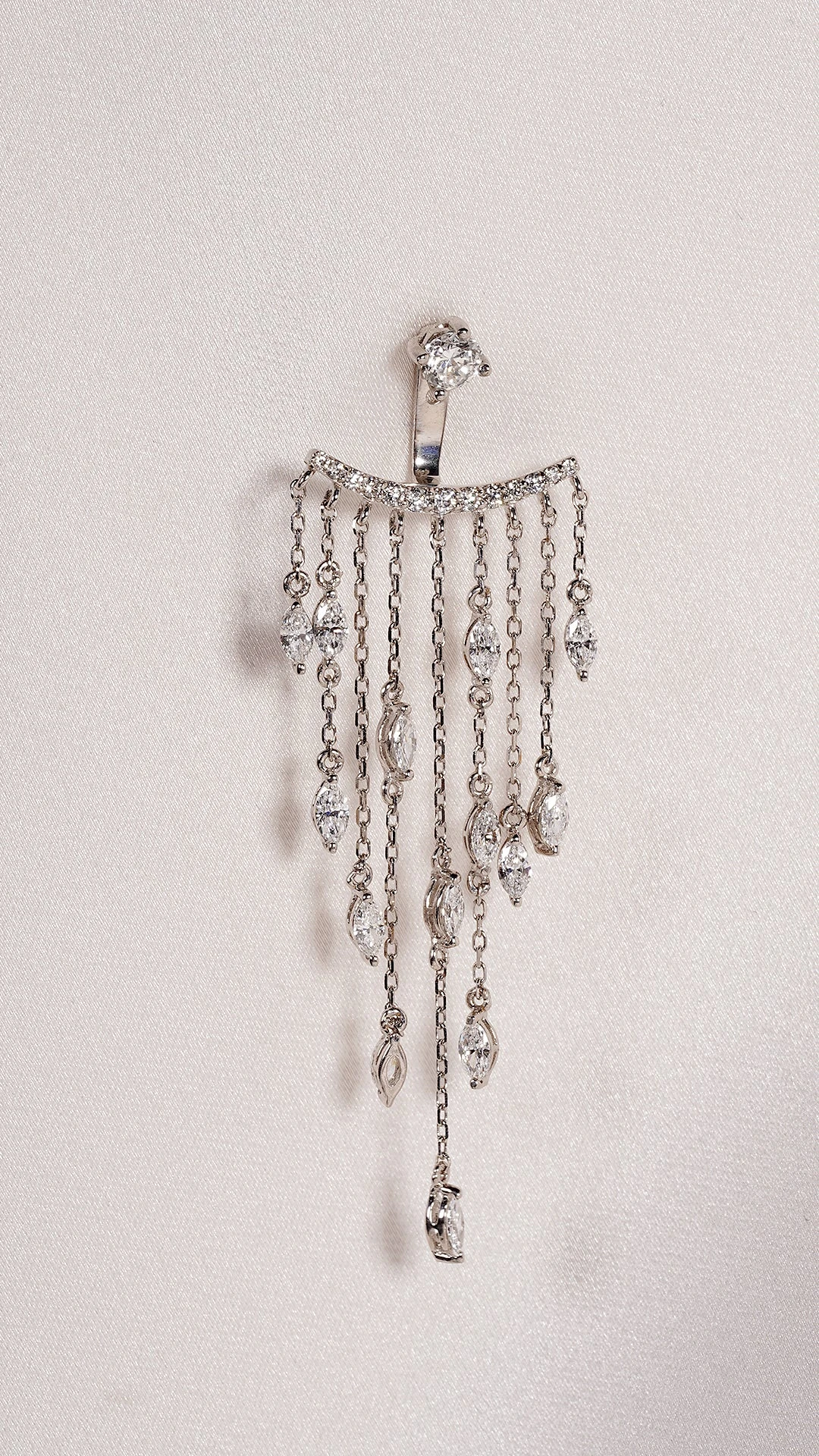Tiny scintillating Marquise diamonds are suspended from delicate chains, catching the light from every angle. We love wearing this piece in the asymmetrical style balanced with a single stud earring from our Chelsea Collection in the other ear.