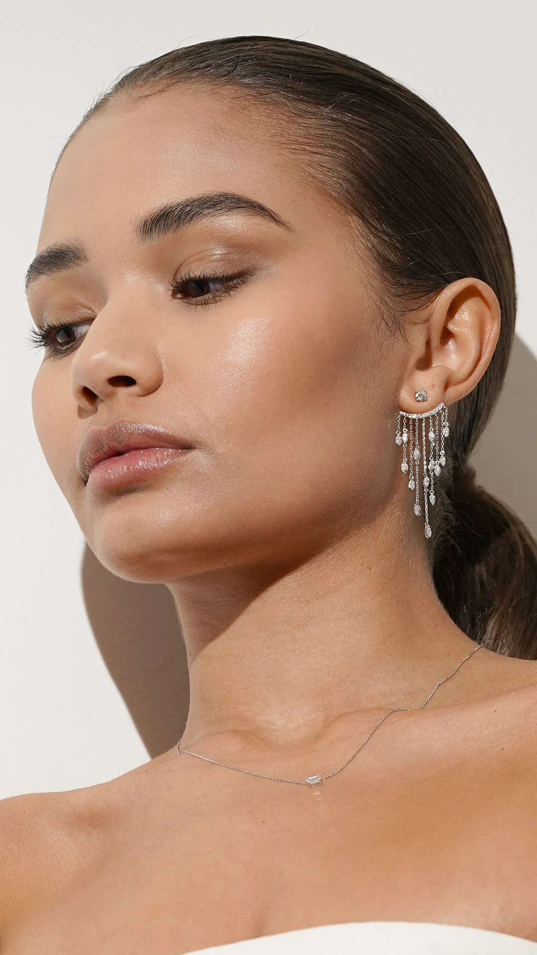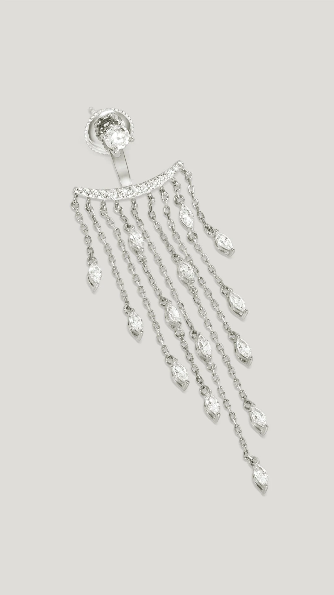 Inspired by glamorous socialite parties, the A-Lister Ear Jacket is a cascading chandelier earring crafted from Sterling silver and features a detachable jacket. Tiny scintillating Marquise stones are suspended from delicate chains, catching the light from every angle. We love wearing this piece in the asymmetrical style balanced with a single stud earring from our Chelsea Collection in the other ear.