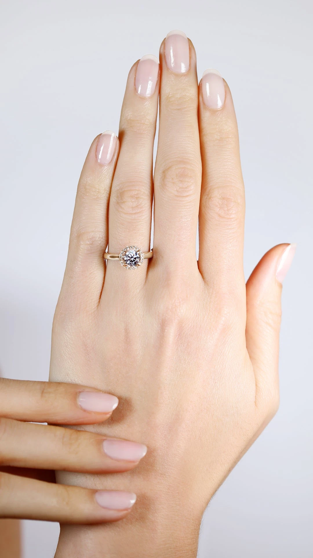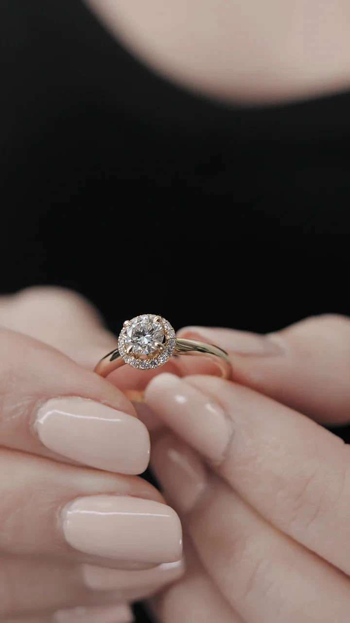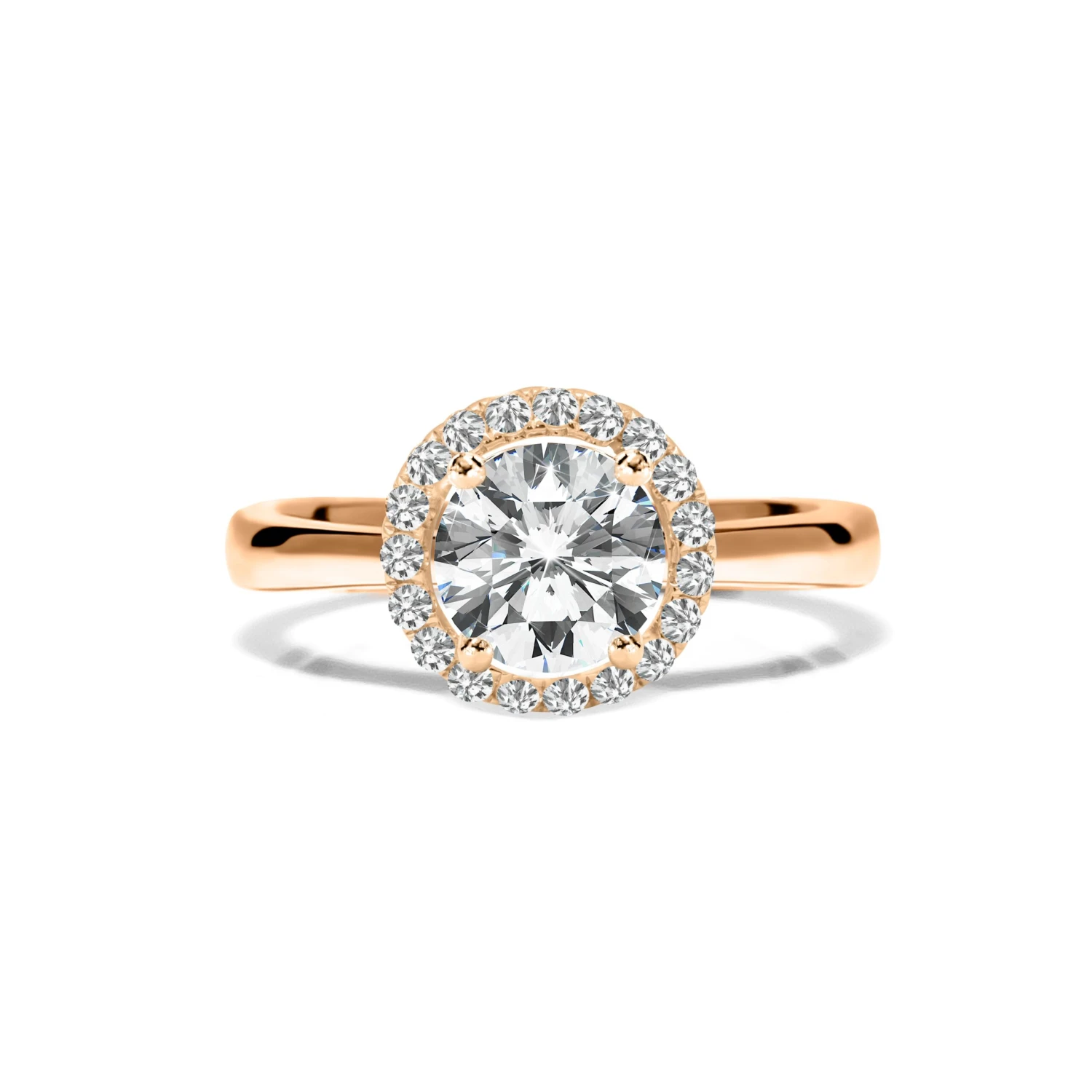 This exquisite ring is comprised of a beautiful round brilliant diamond that sparkles from every angle surrounded by a halo of smaller diamonds. Handcrafted with an elevated setting in 18K rose gold. Make this ring the one she will cherish for a lifetime.