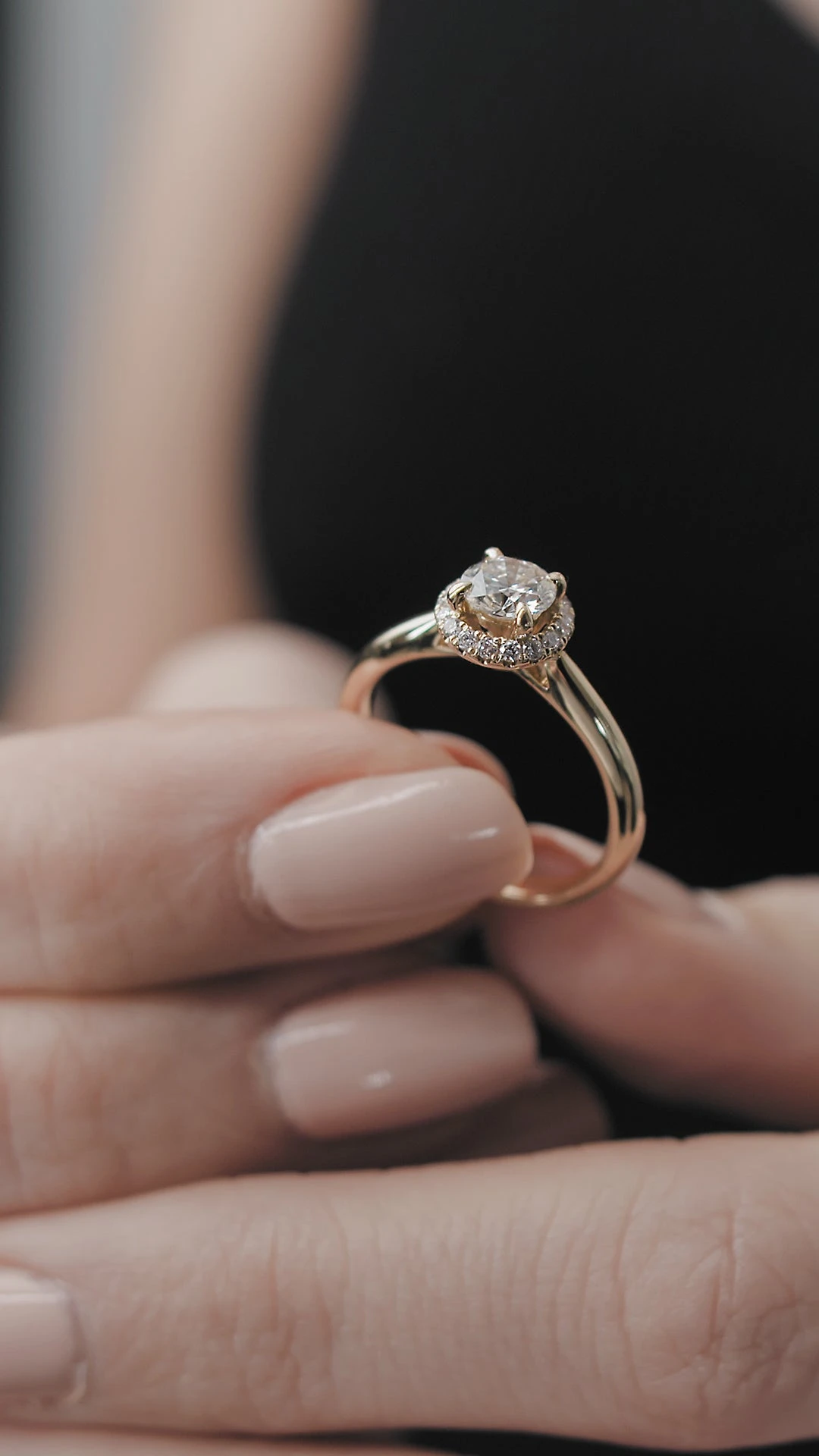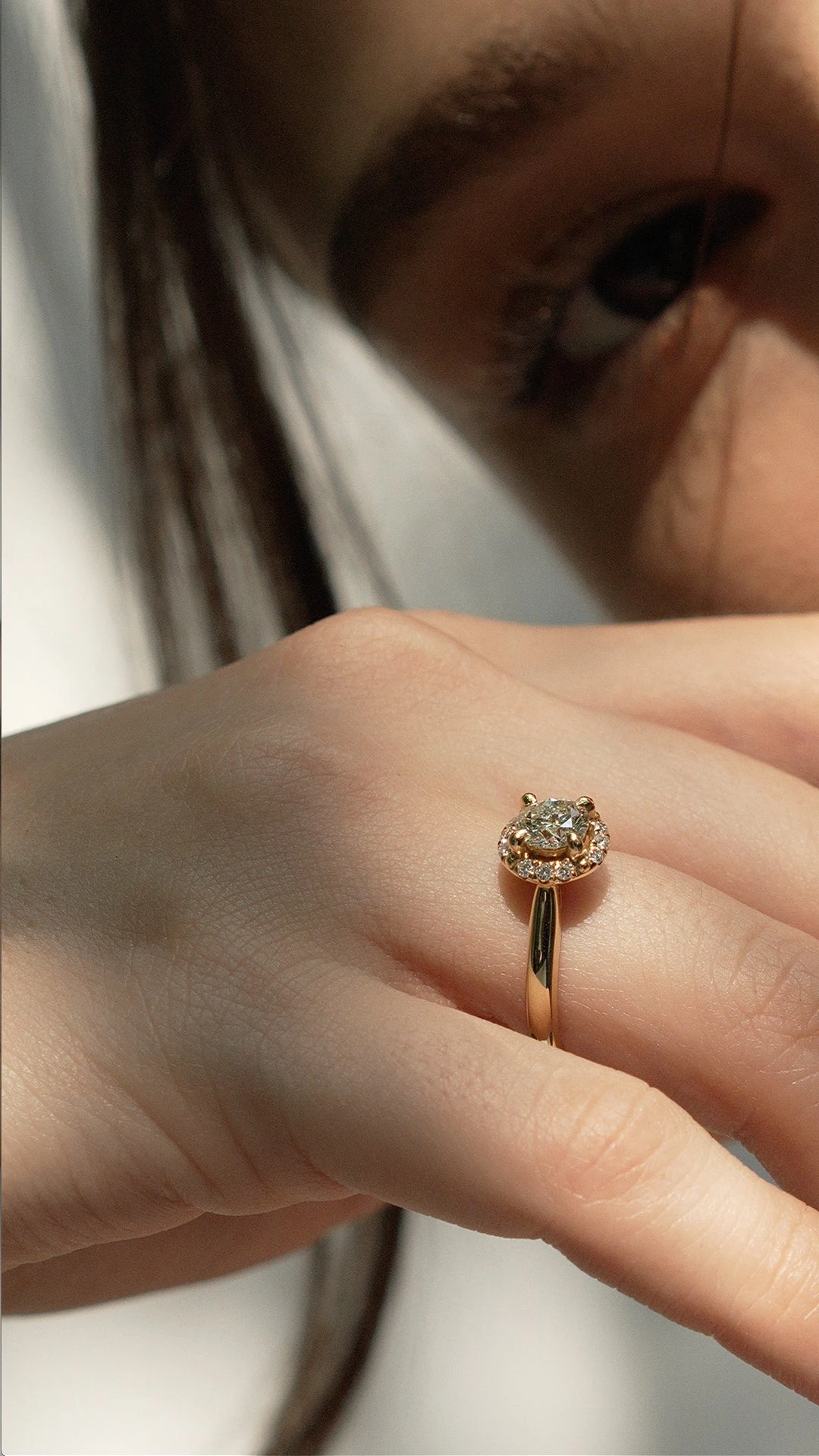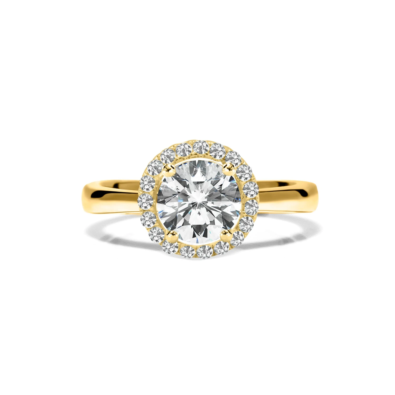 This exquisite ring is comprised of a beautiful round brilliant diamond that sparkles from every angle surrounded by a halo of smaller diamonds. Handcrafted with an elevated setting in 18K yellow gold. Make this ring the one she will cherish for a lifetime.