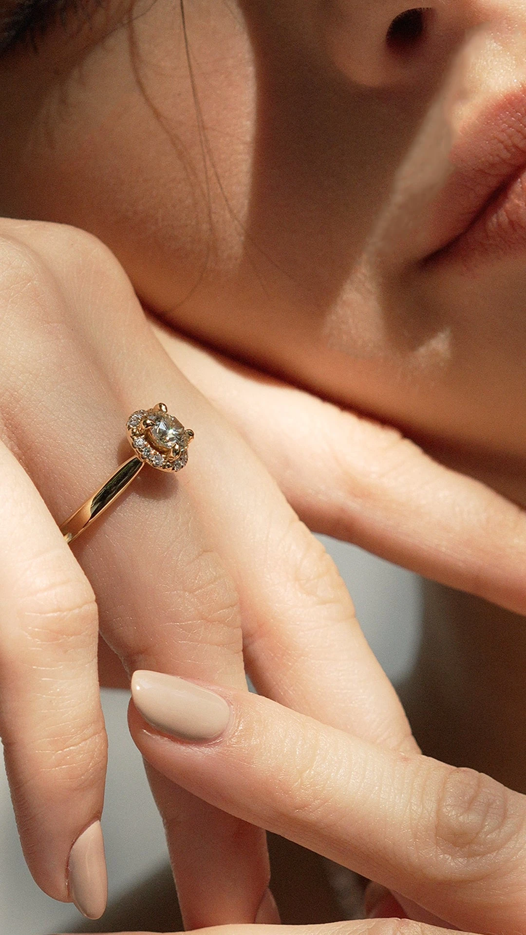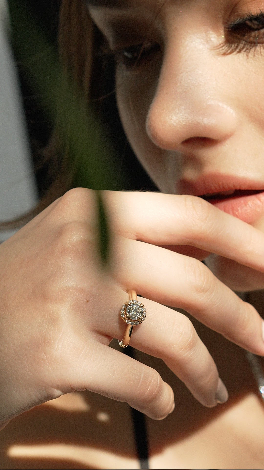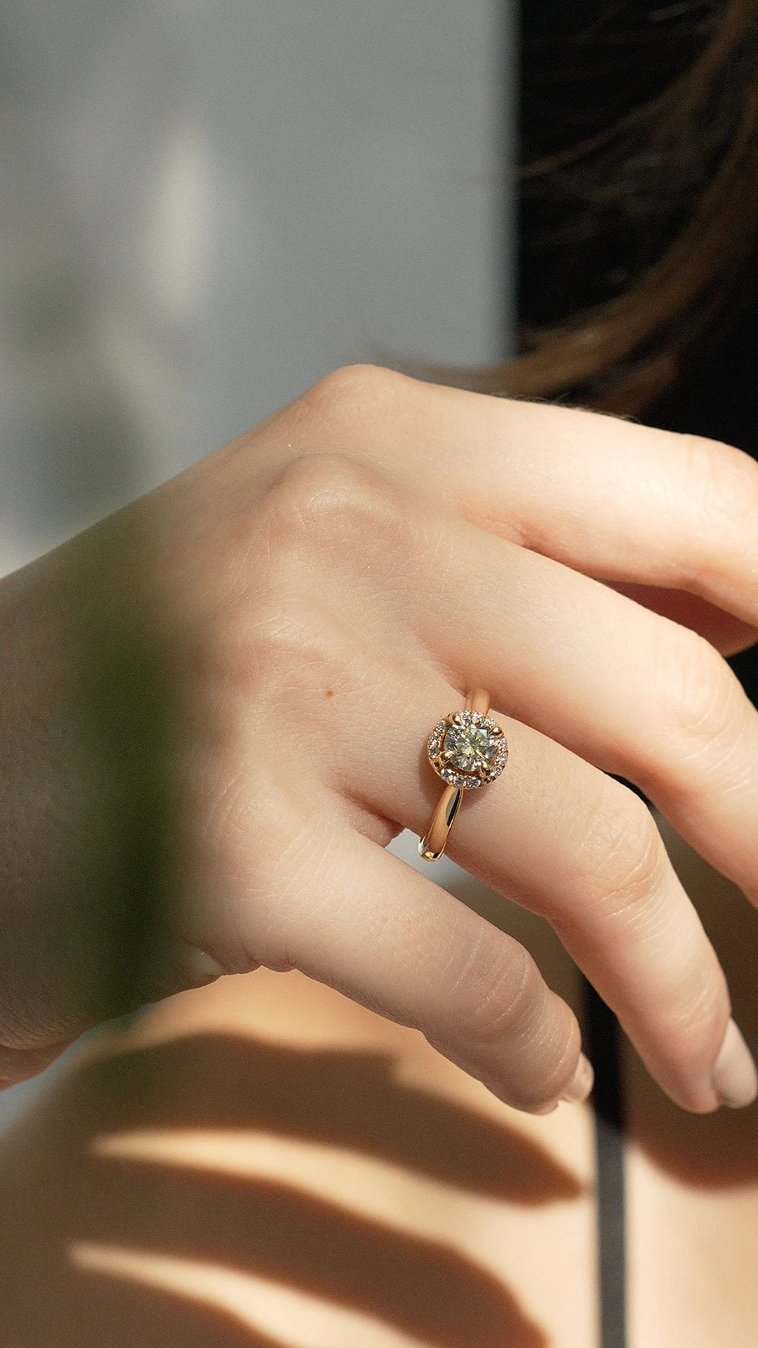 This exquisite ring is comprised of a beautiful round brilliant diamond that sparkles from every angle surrounded by a halo of smaller diamonds. Handcrafted with an elevated setting in 18K yellow gold. Make this ring the one she will cherish for a lifetime.