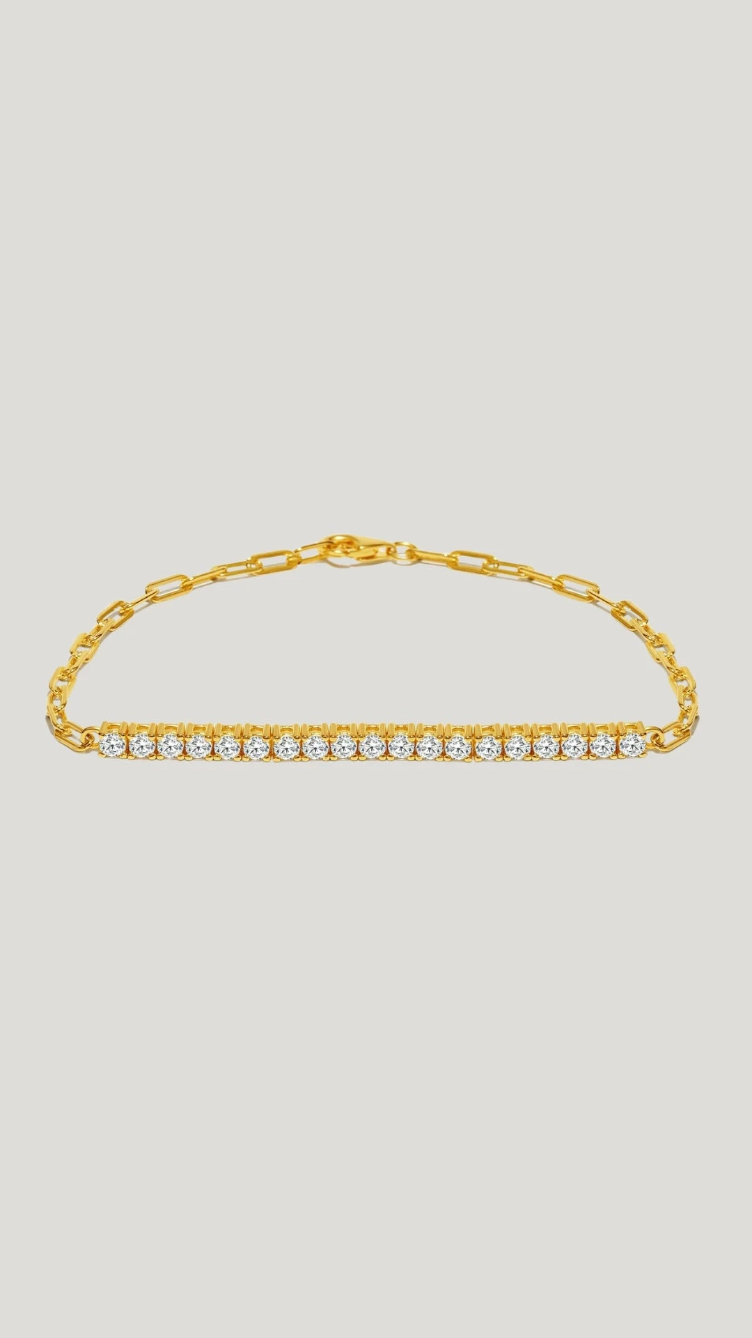 The classic tennis bracelet with a twist. This everyday bracelet features an eye-catching row of round brilliants complemented by a polished paperclip chain.