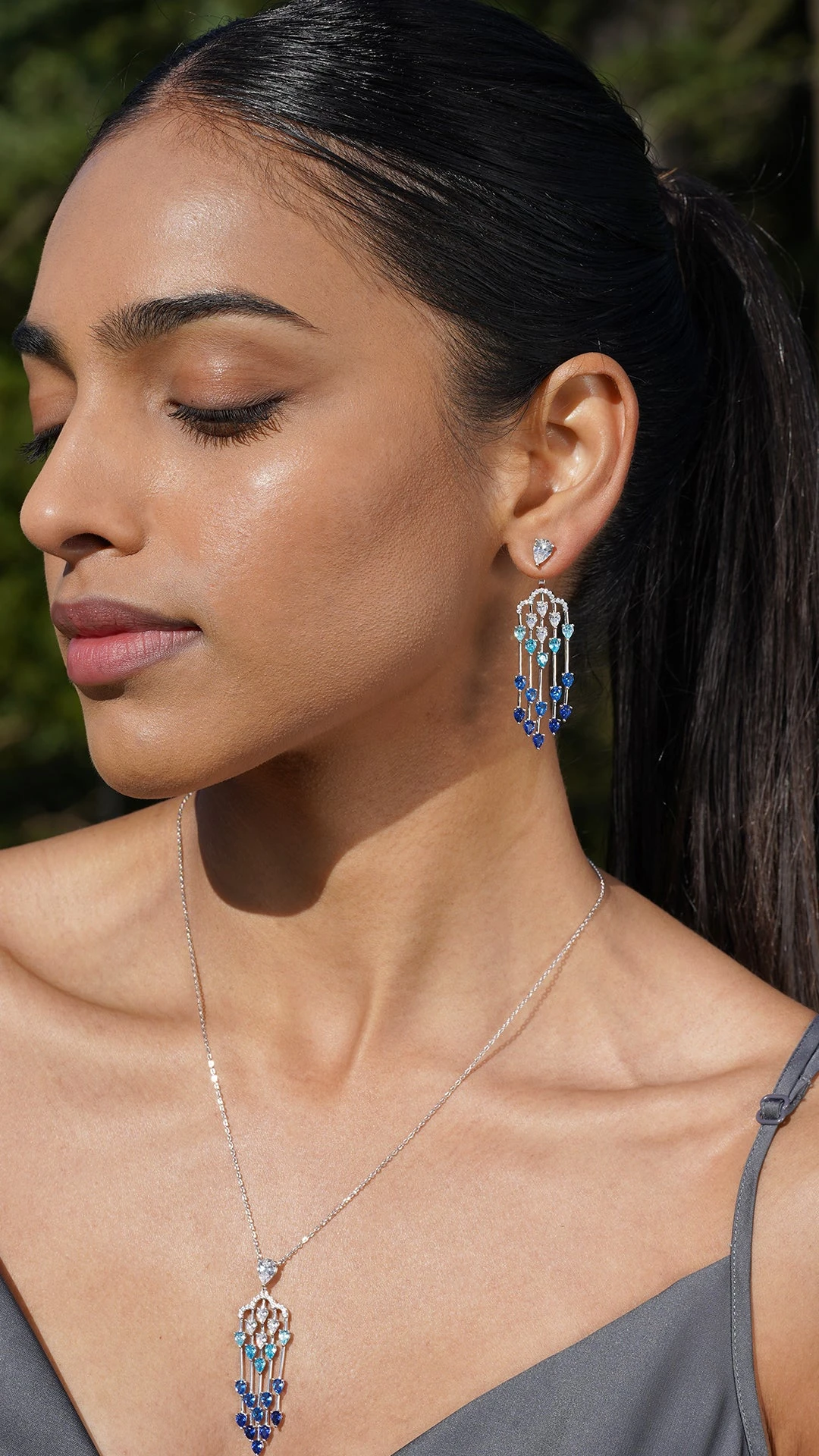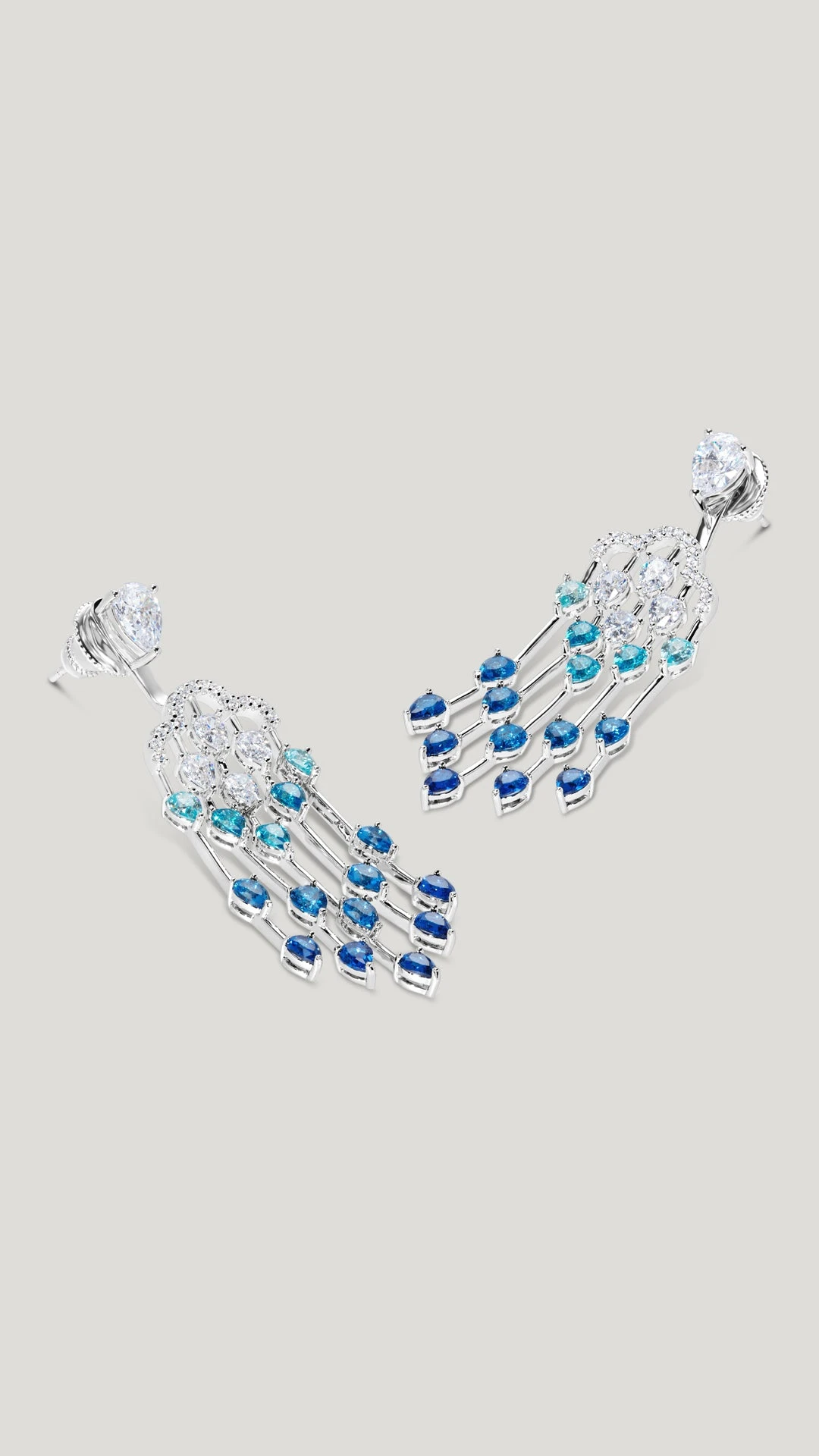 A mesmerising pair of chandelier earrings composed of gradient white and blue Pear cut stones set with articulated joinery, allowing free movement and ultimate sparkle.