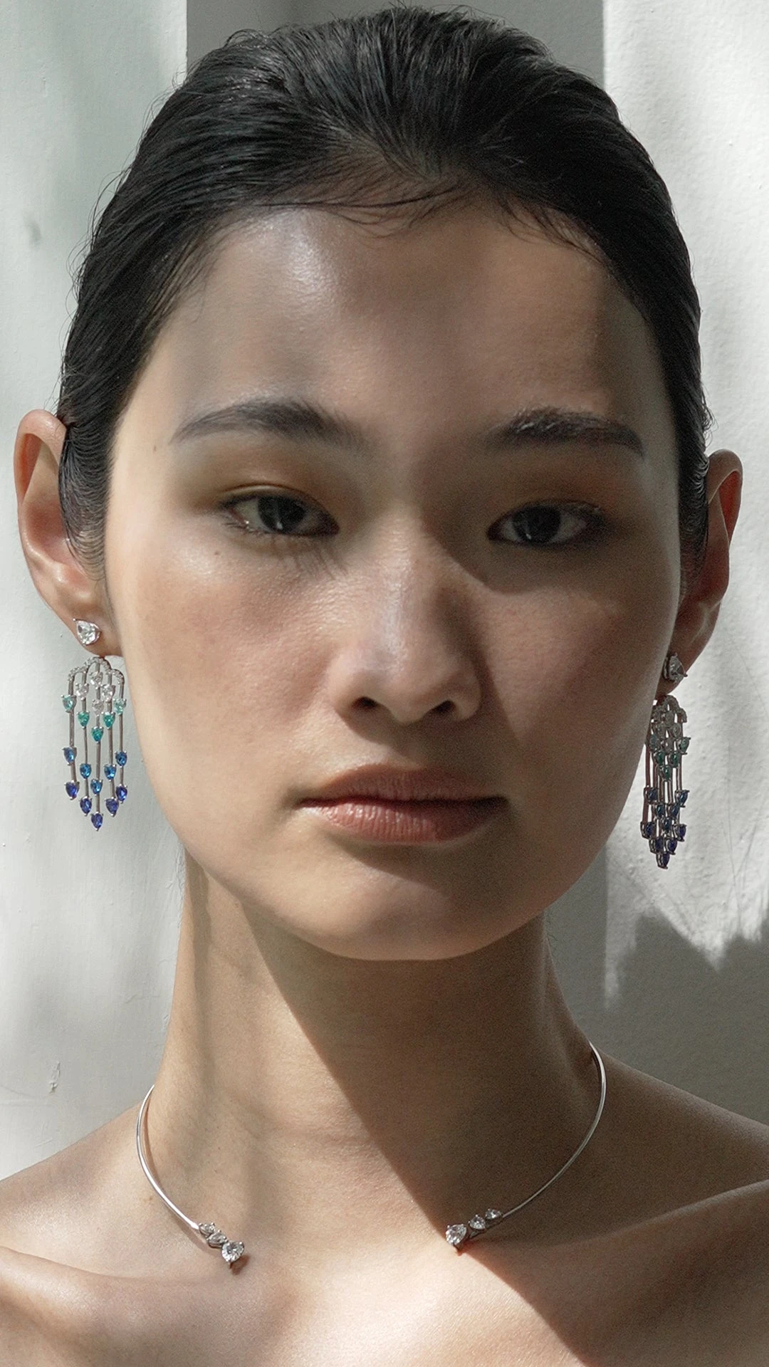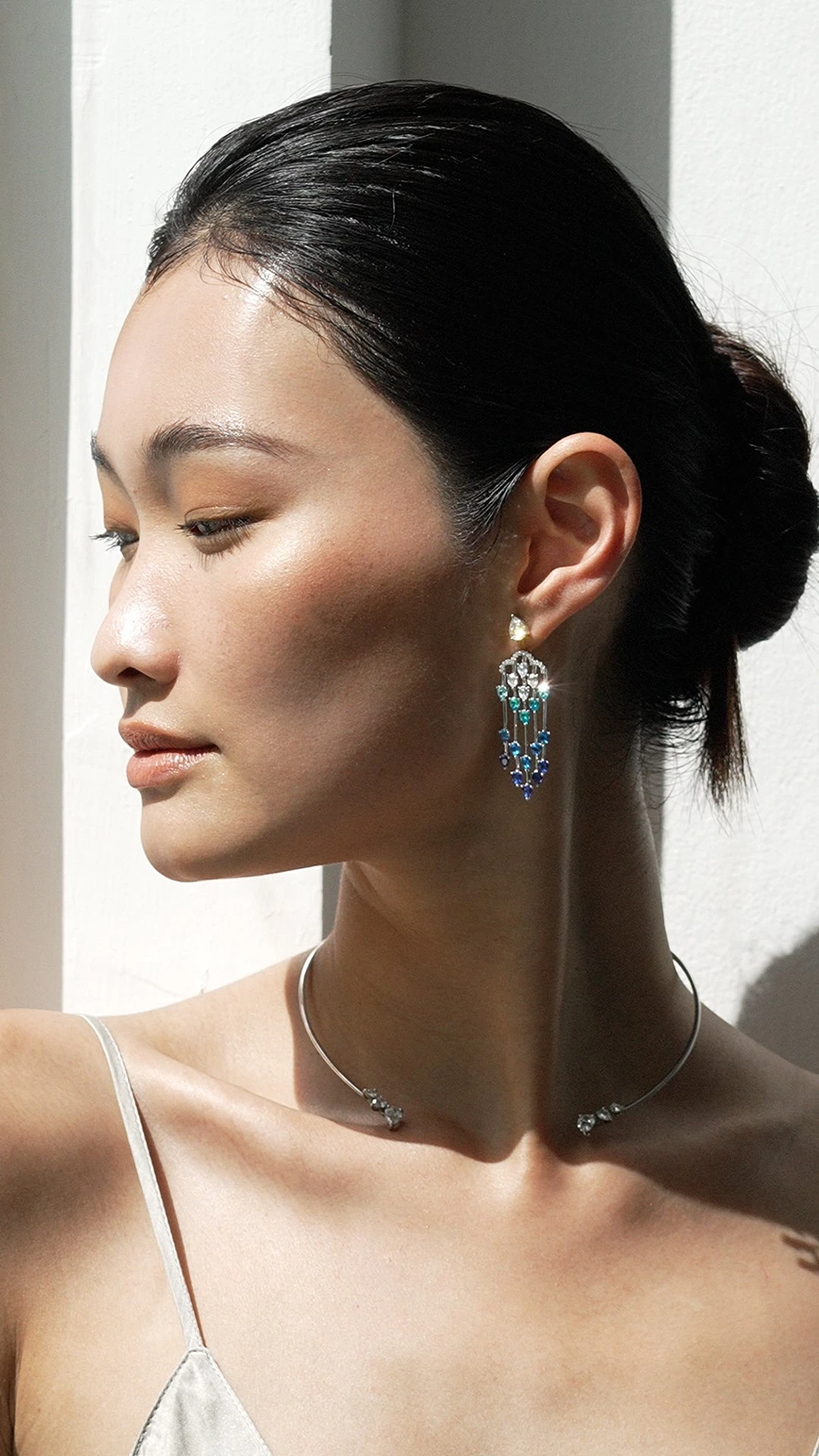 Inspired by falling rain, these earrings are designed in a modern ear jacket style so that you can wear studs by day and add the chandelier jackets for a chic after-hours look.