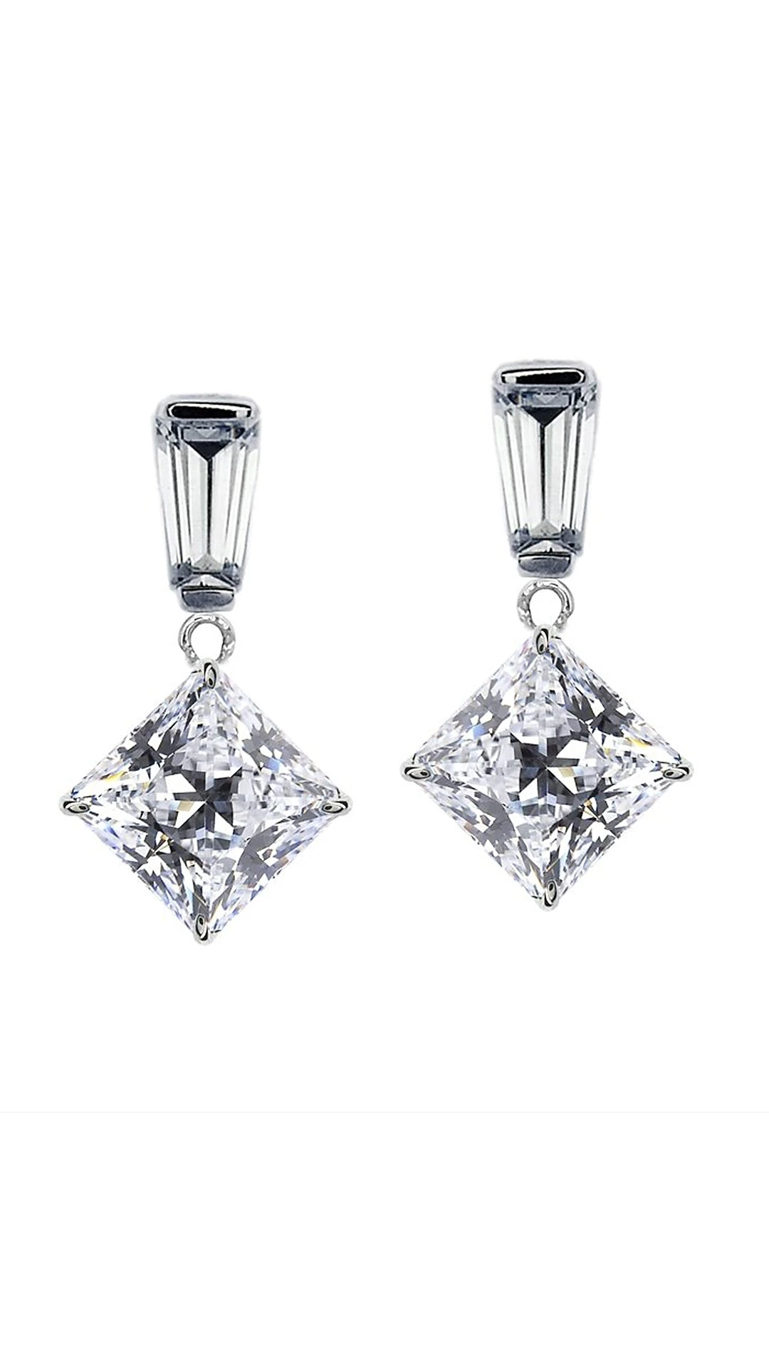 This delicate pair of Princess drops features a baguette linkage, allowing the brilliantly cut princess-cut stones to sparkle below. Adding just a touch of drama to any outfit, daytime or nighttime.