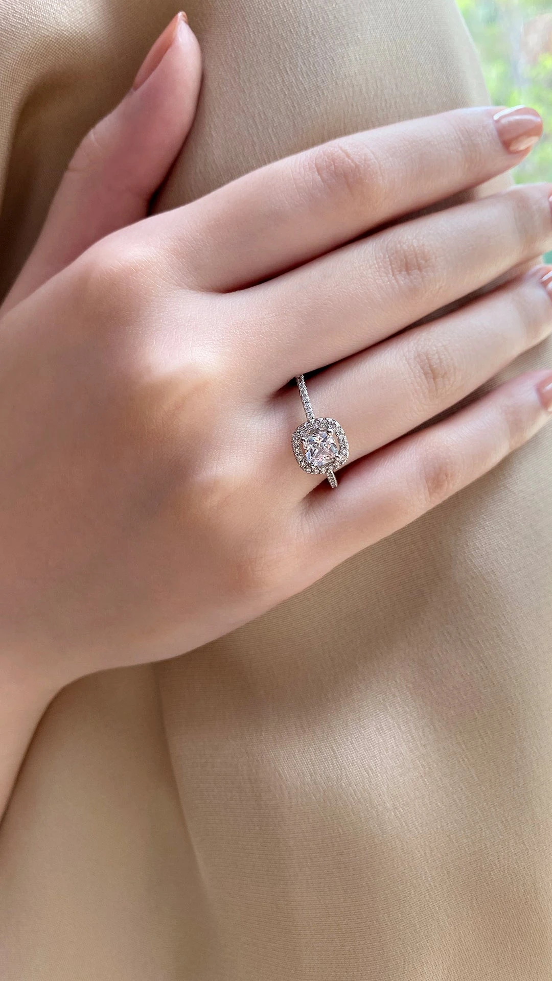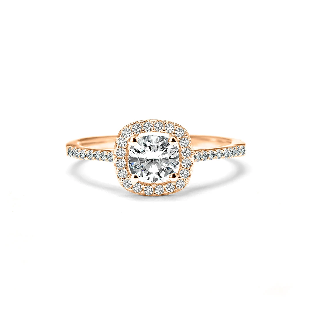 The Anouk ring is a solitaire ring featuring a round cut diamond surrounded by a square halo of diamonds. Set in 18K gold, the band is dotted with beautiful microset diamonds for added allure. Let this be the ring to win her heart.