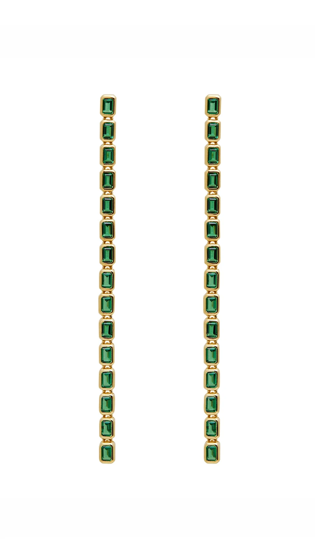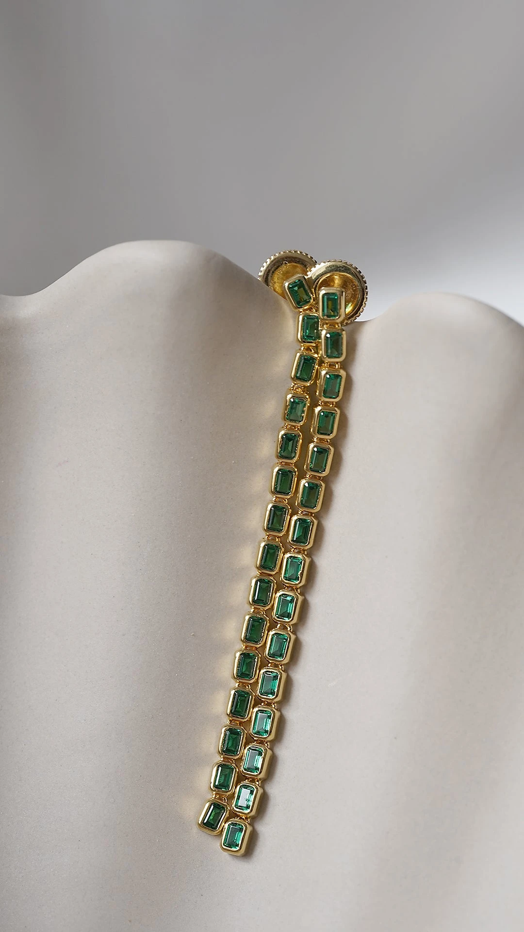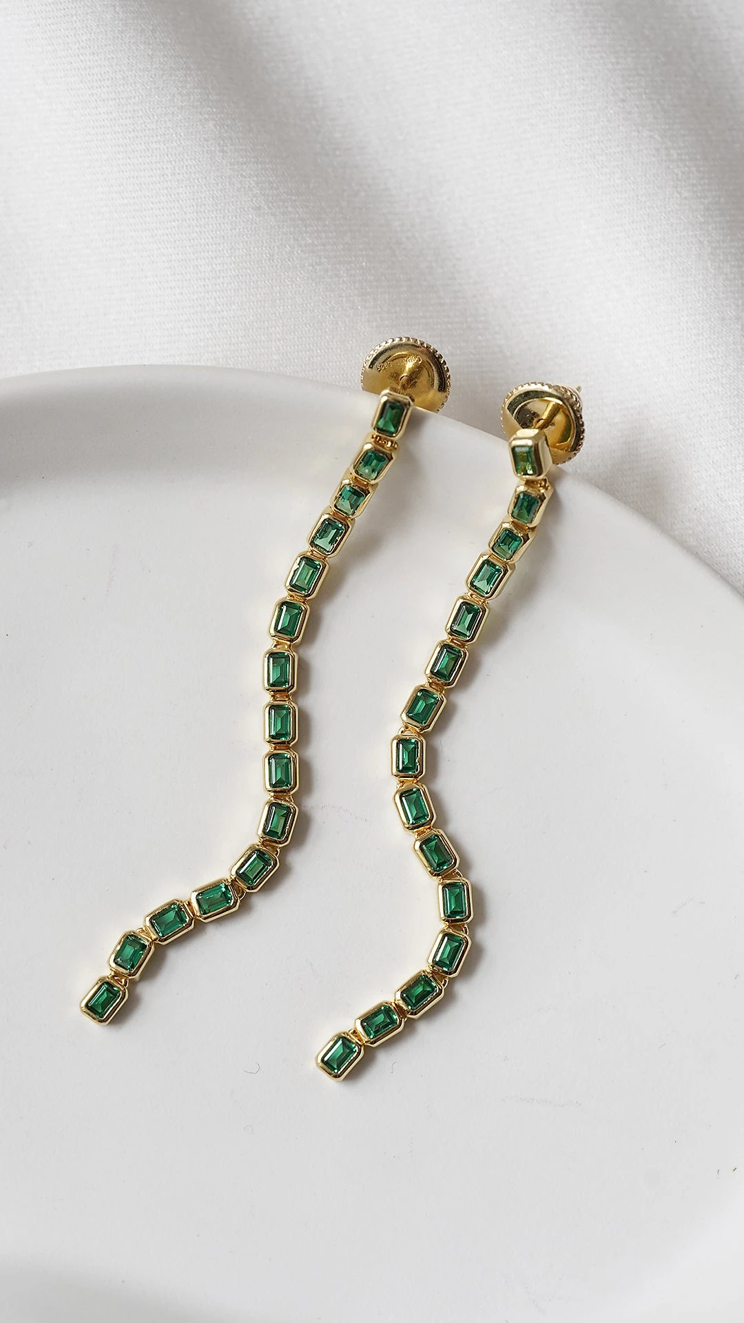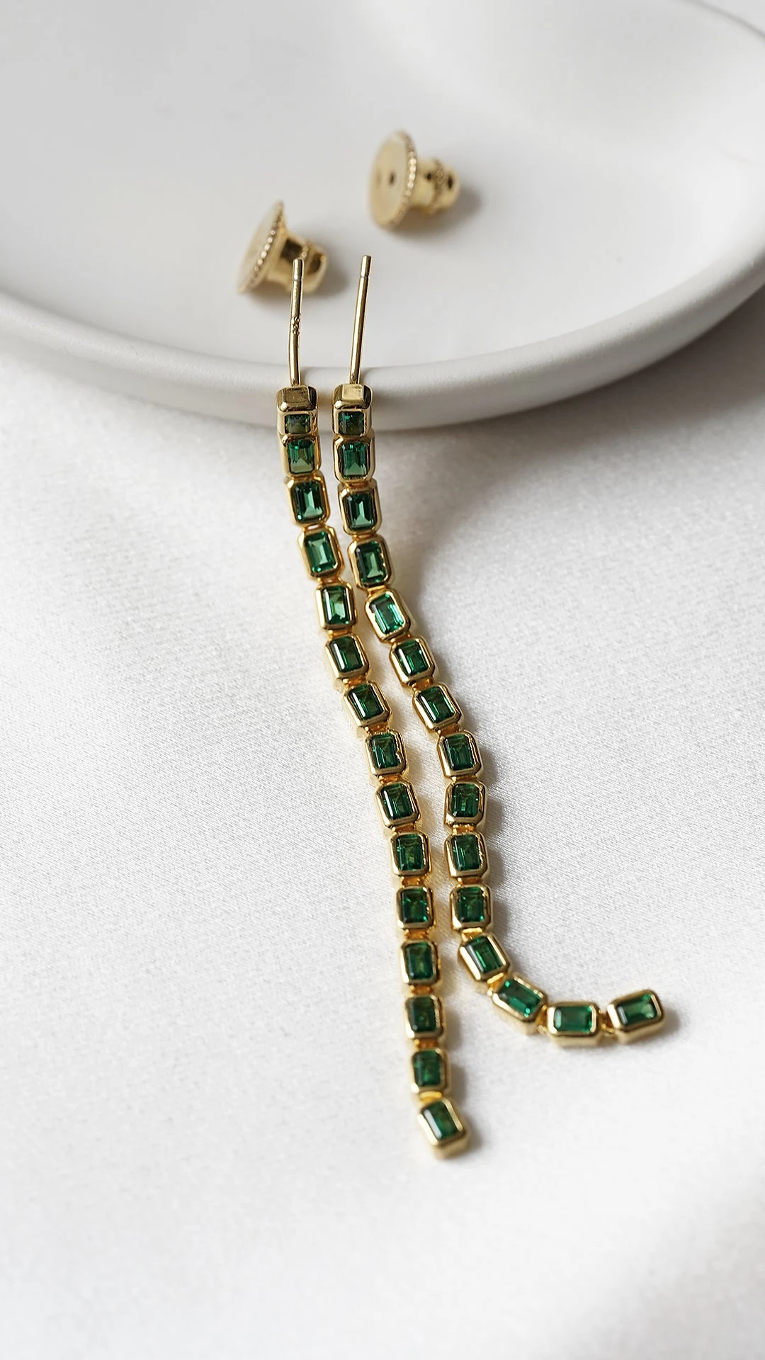 These emerald drop earrings are a light version of our original Cassidy earrings. Elegant bezel-set emerald cuts in rich emerald green sway with every movement.
