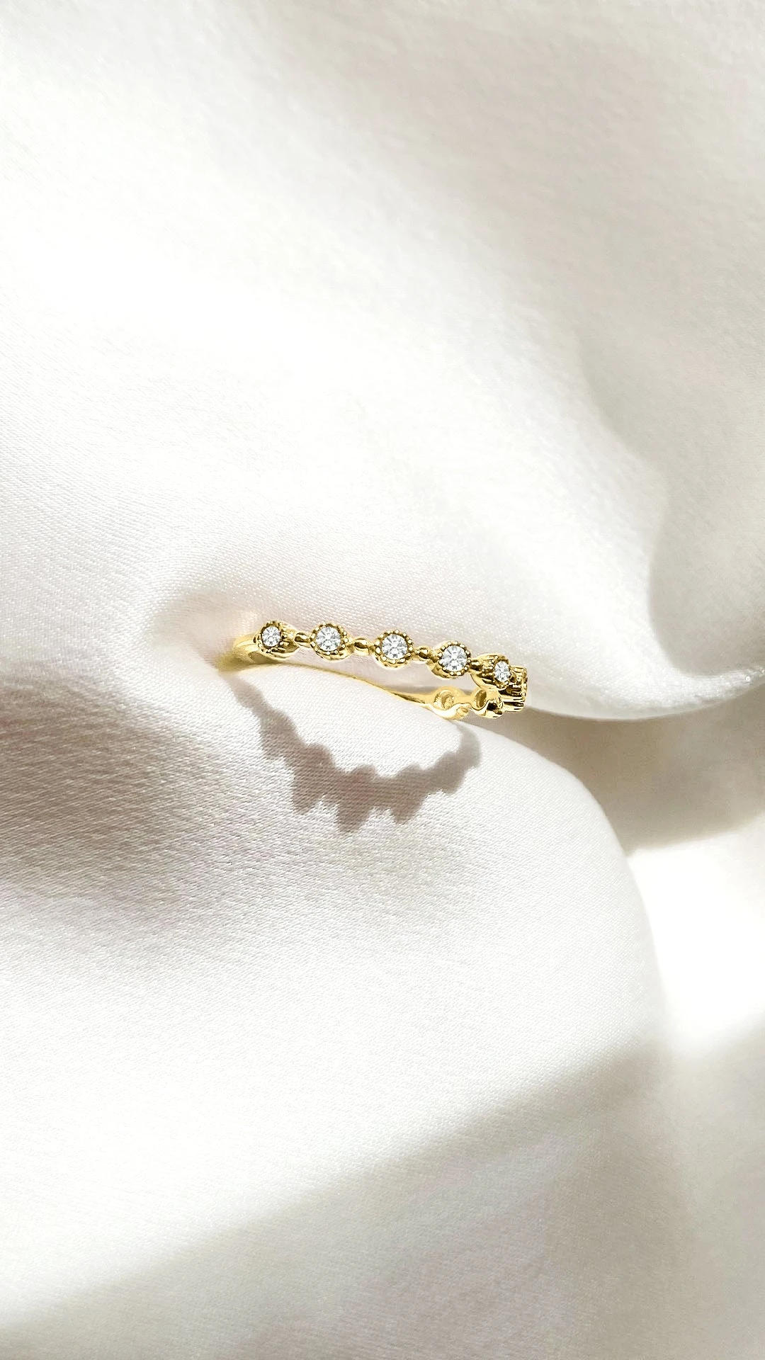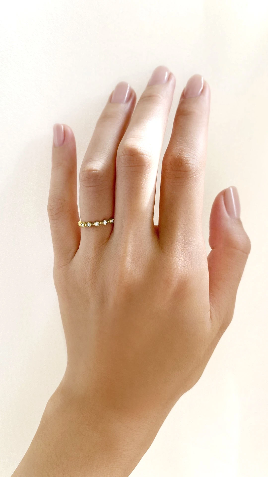 A perfect everyday ring studded with tiny bezel set round diamonds to give you the lift you need. Delicate and small, the Betsy ring is ideal for layering and stacking.