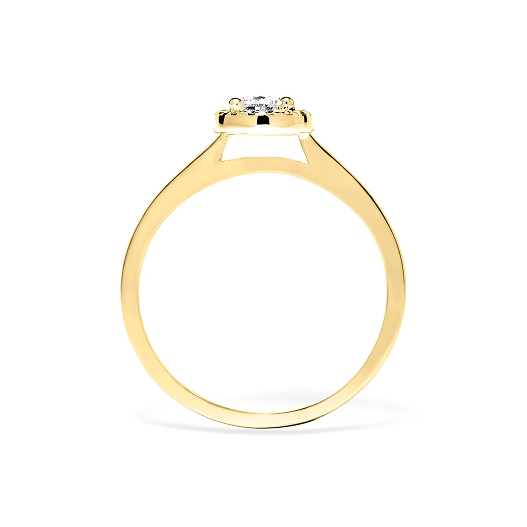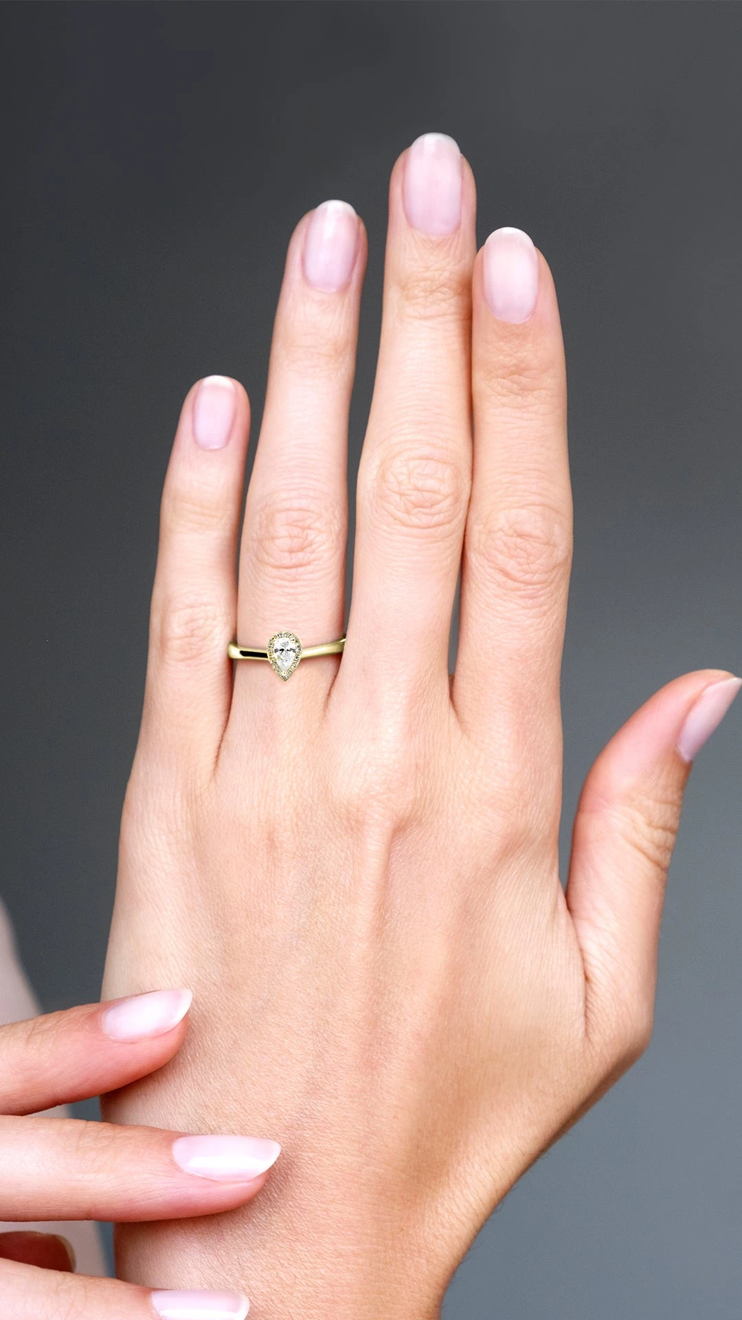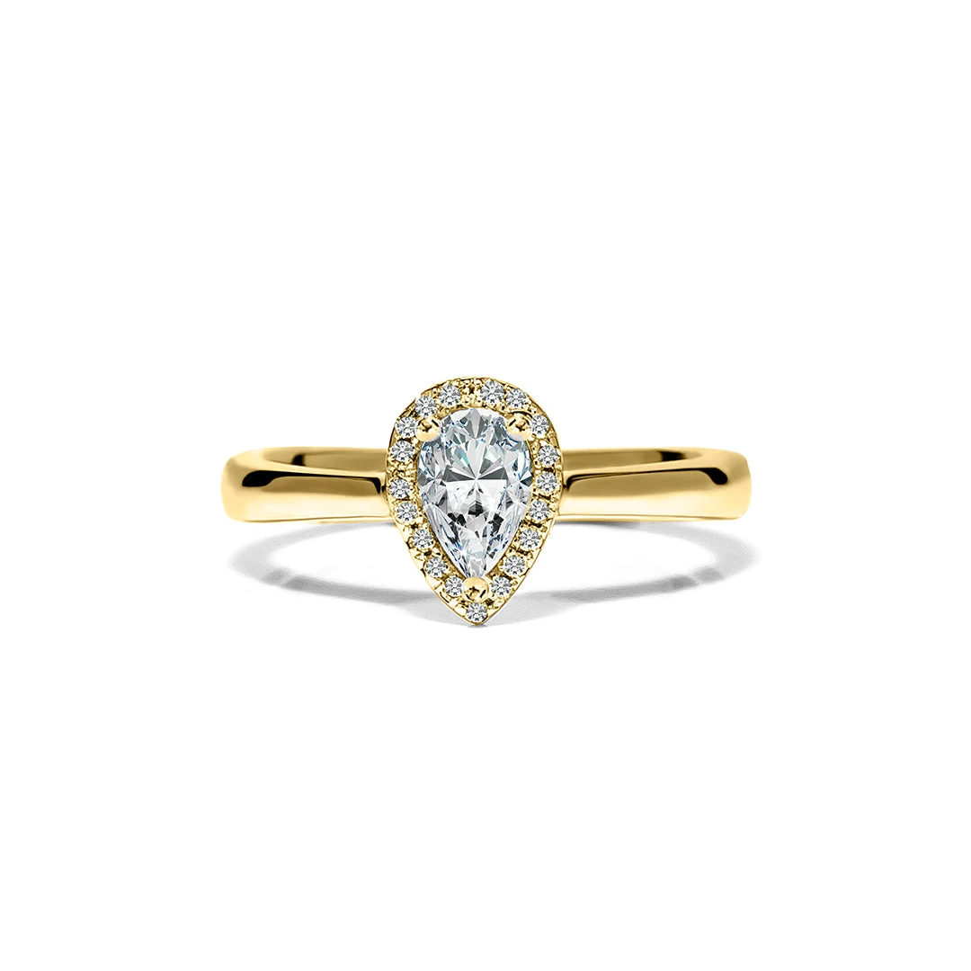This glittering pear shaped diamond engagement ring is filled with sparkle and fire. The ring is presented in a traditional 18K gold setting, with a stunning pear shape surrounded by tiny borderset stones. This gives the overall appearance of a much larger diamond glowing on your engagement finger. Allow her to be swept away with this ring to commemorate your love.