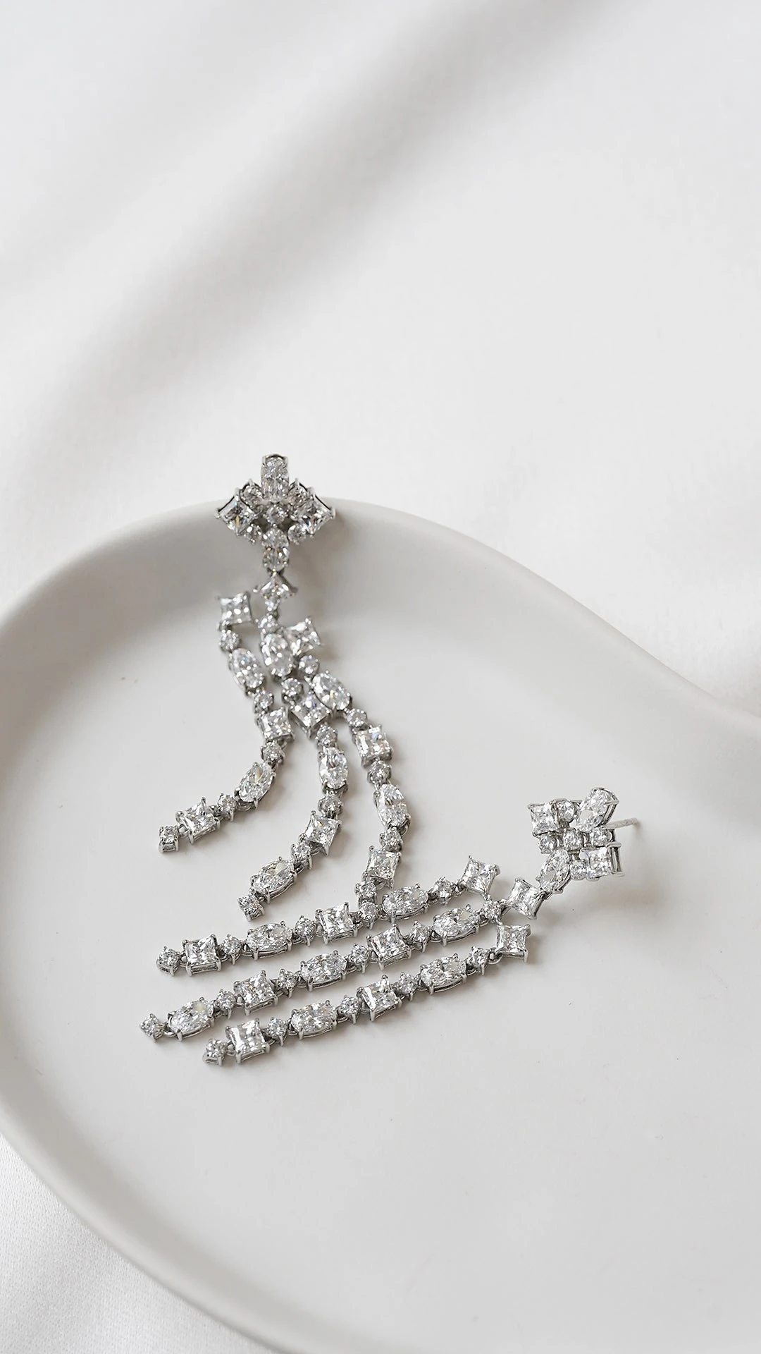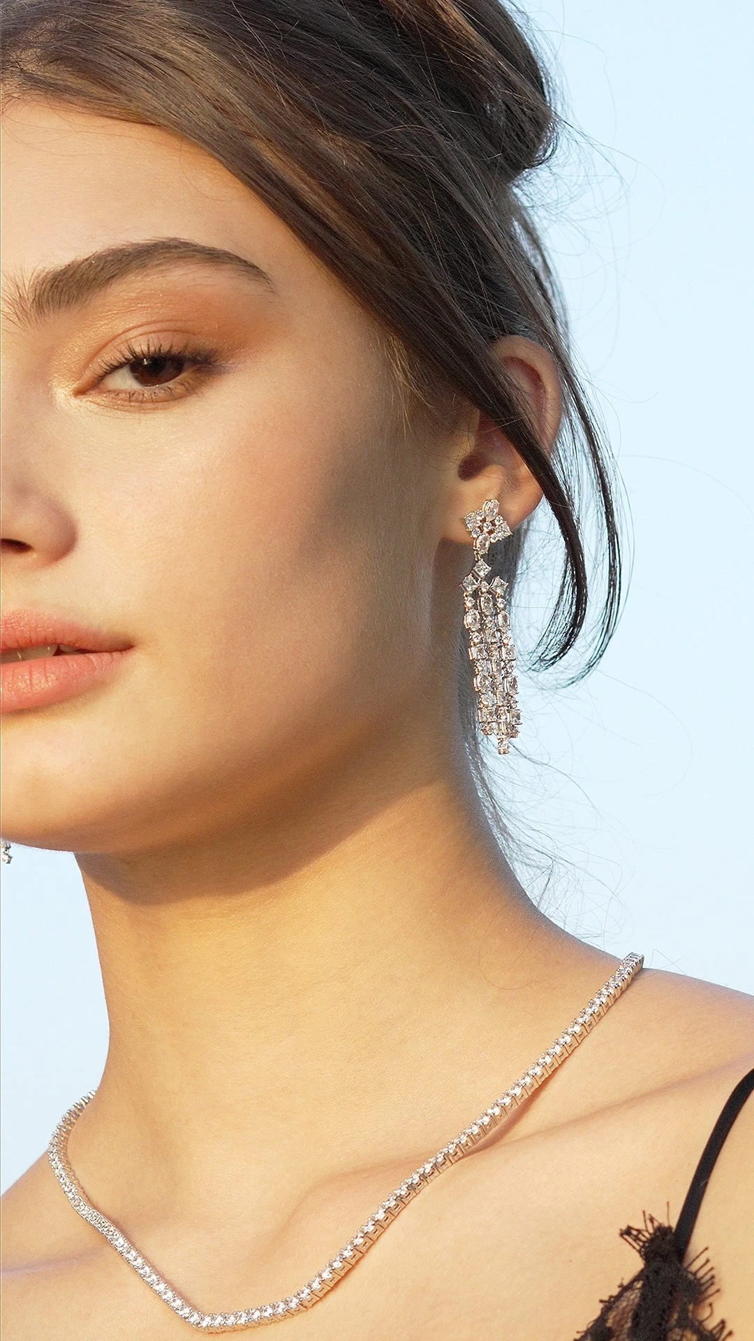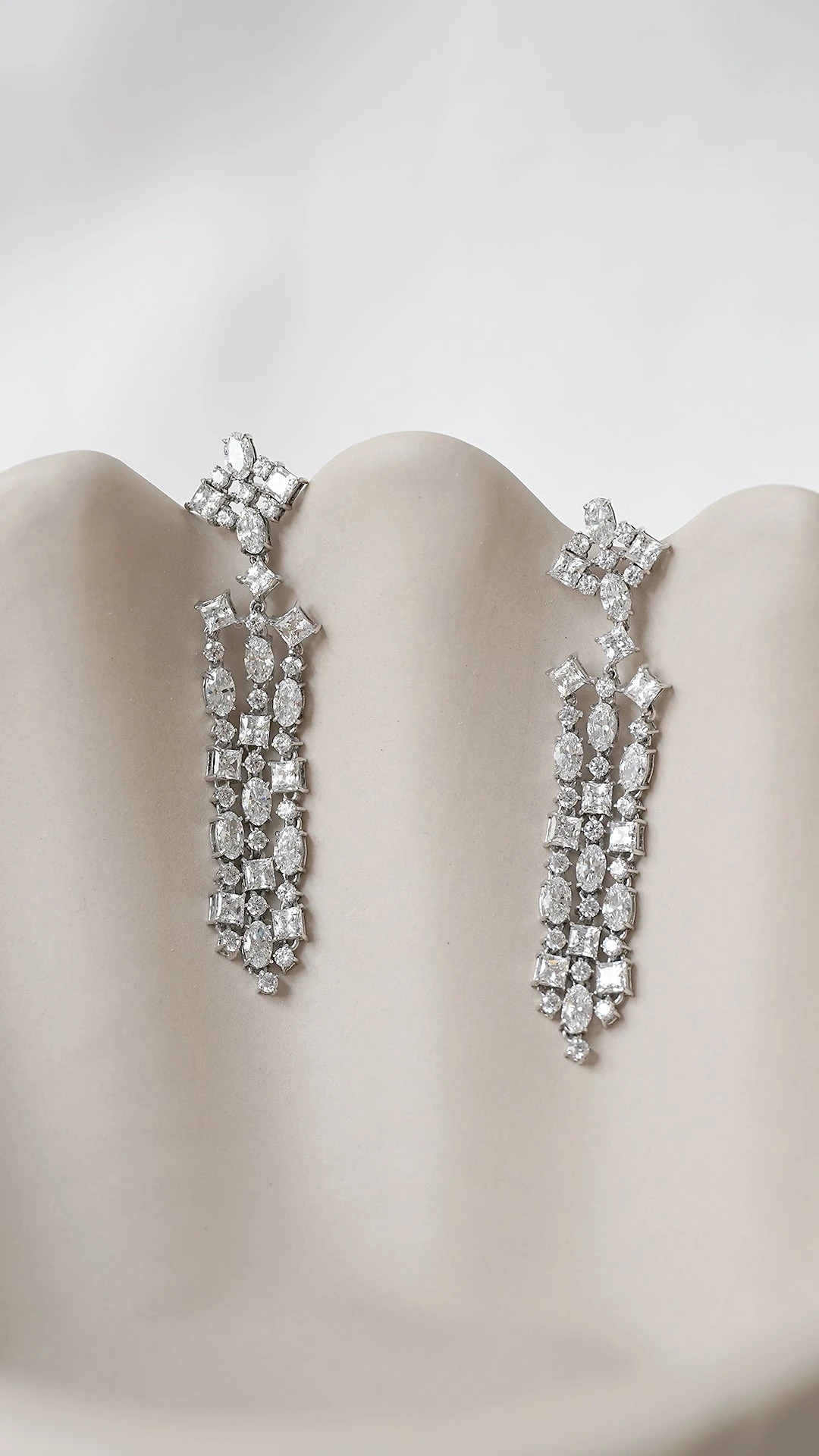 These drops feature a gentle cascade of princess, round and oval cut stones. Our master craftsman’s keen attention to detail shines through on each earring, with a total drop of 3.2 cm when worn.