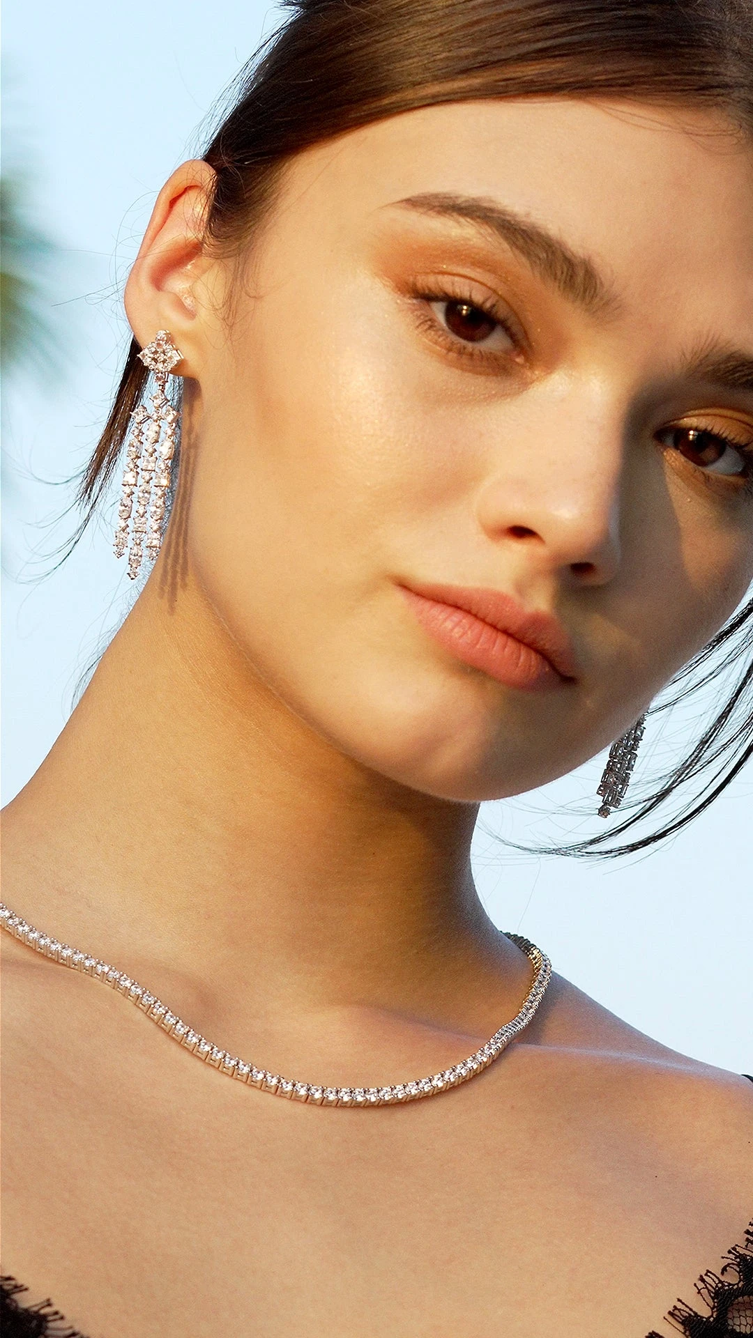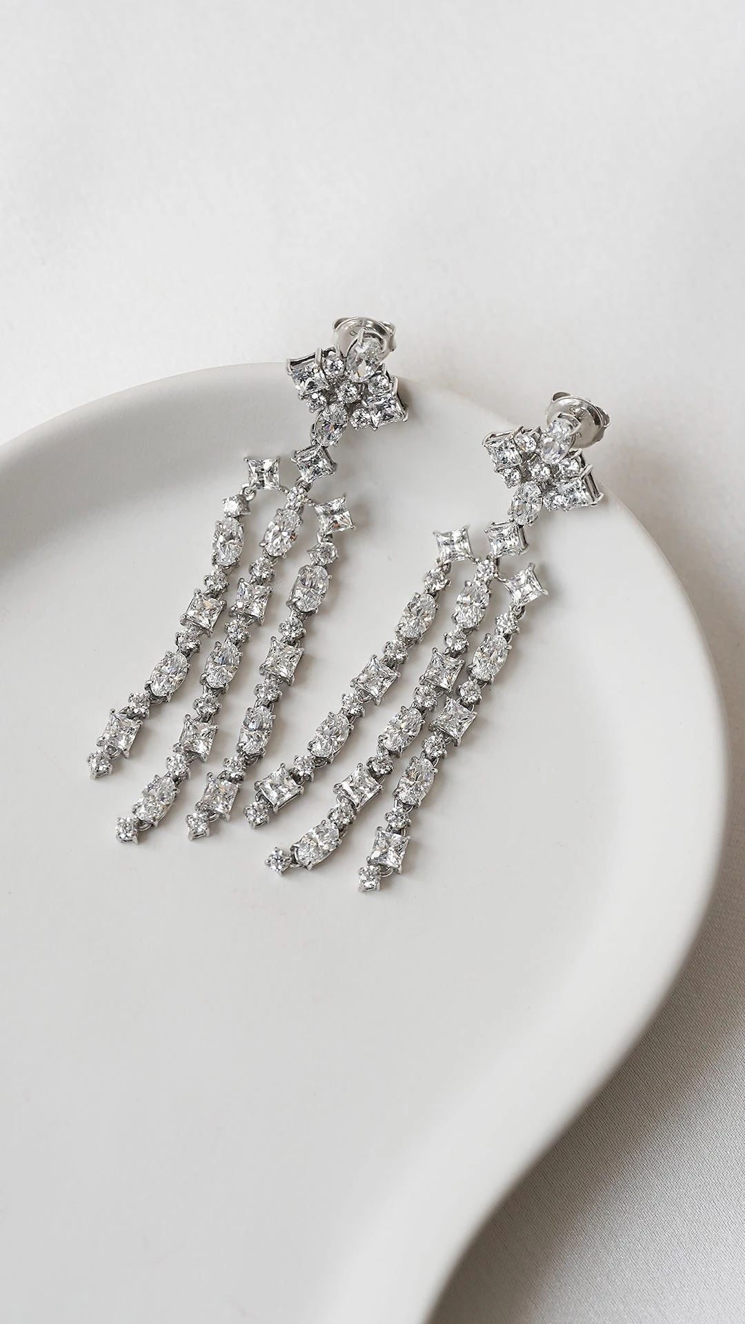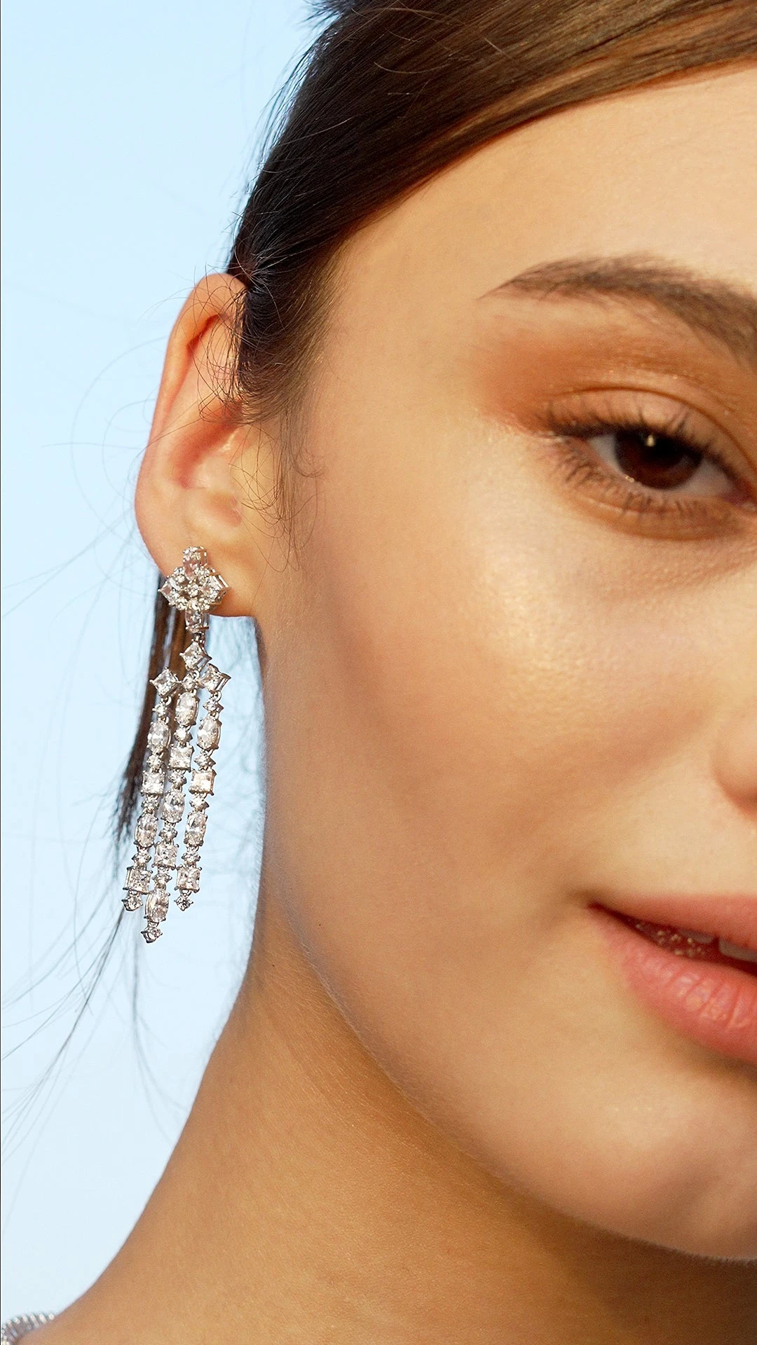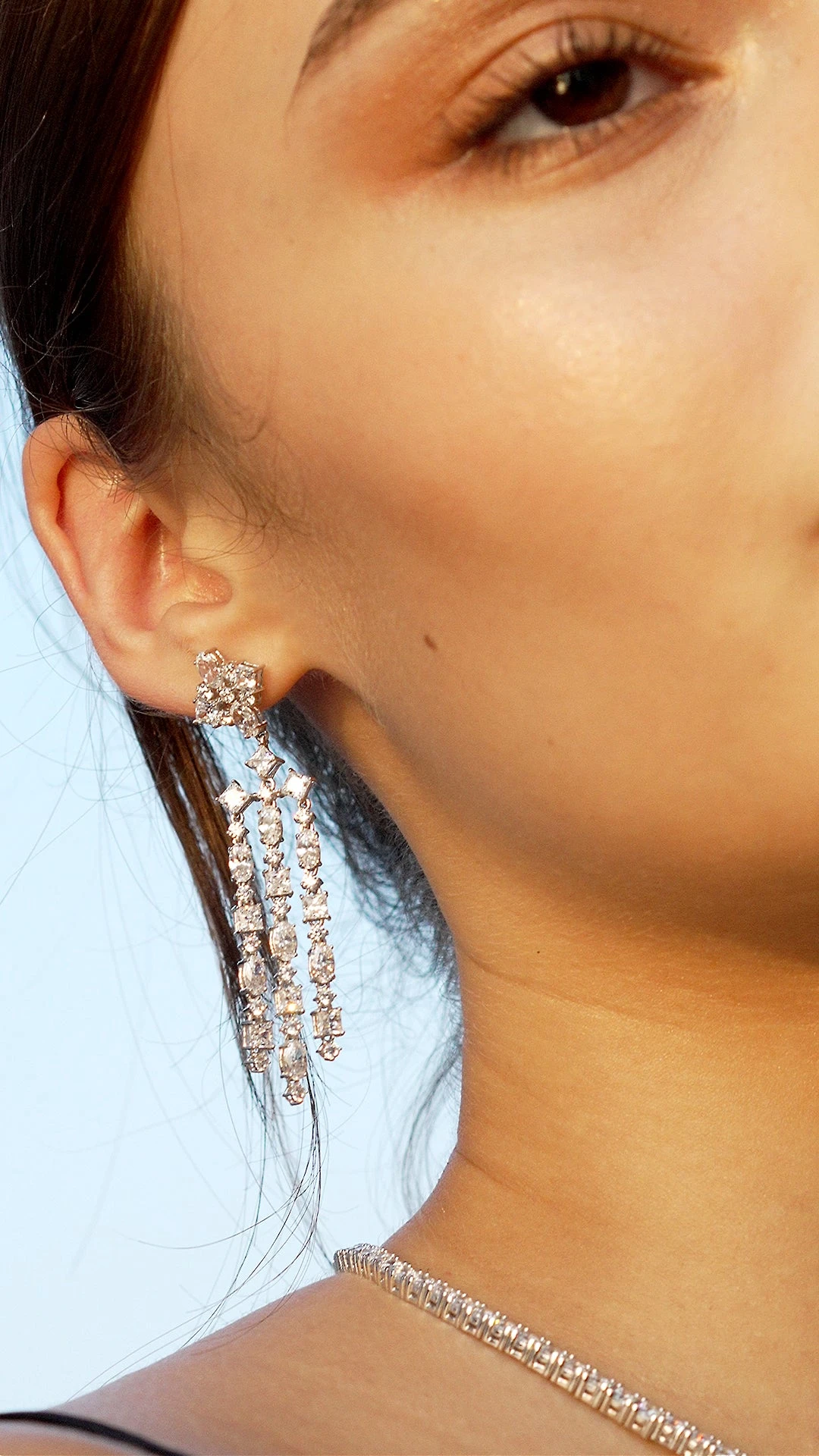 These drops feature a gentle cascade of princess, round and oval cut stones. Our master craftsman’s keen attention to detail shines through on each earring, with a total drop of 3.2 cm when worn.