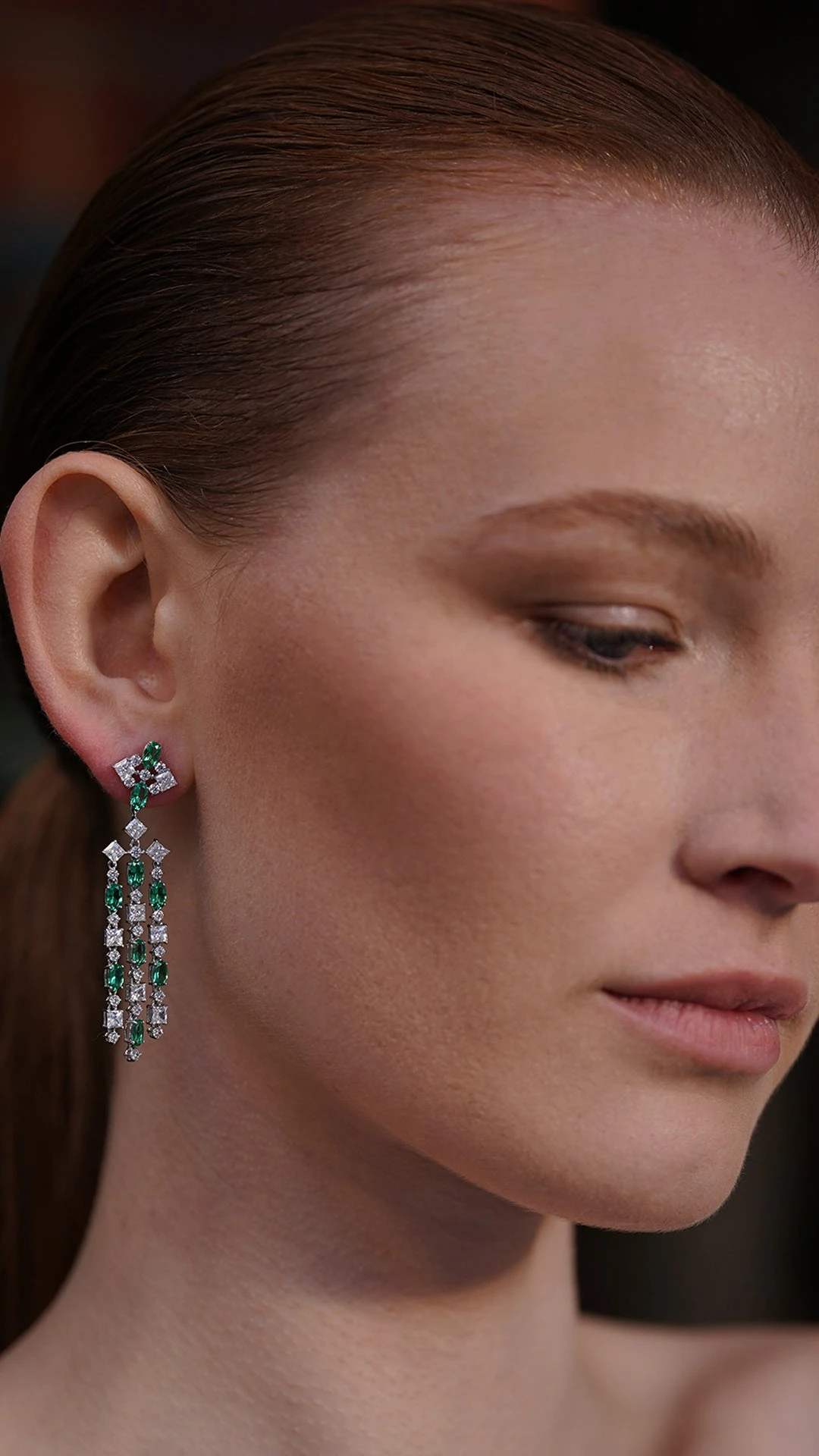 These drops feature a gentle cascade of princess, round and oval cut stones. Our master craftsman’s keen attention to detail shines through on each earring with total drop of 3.2 cm when worn.