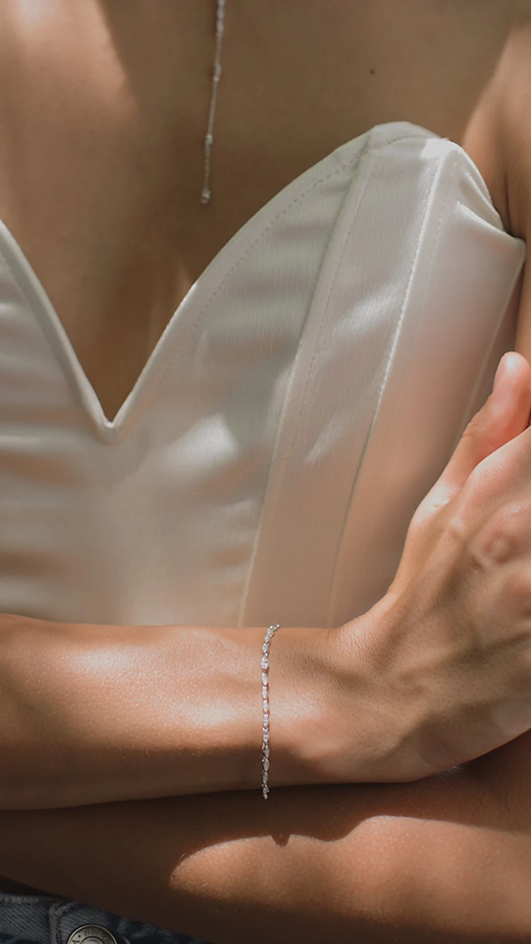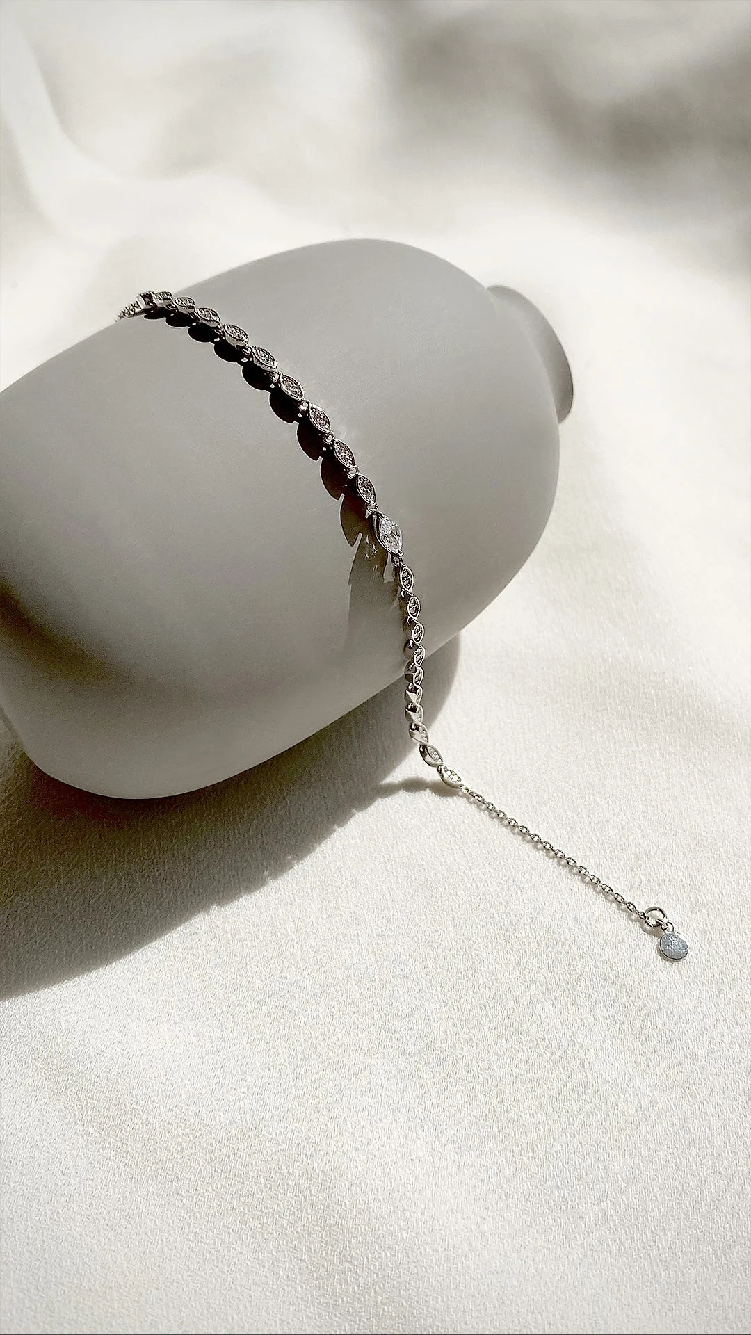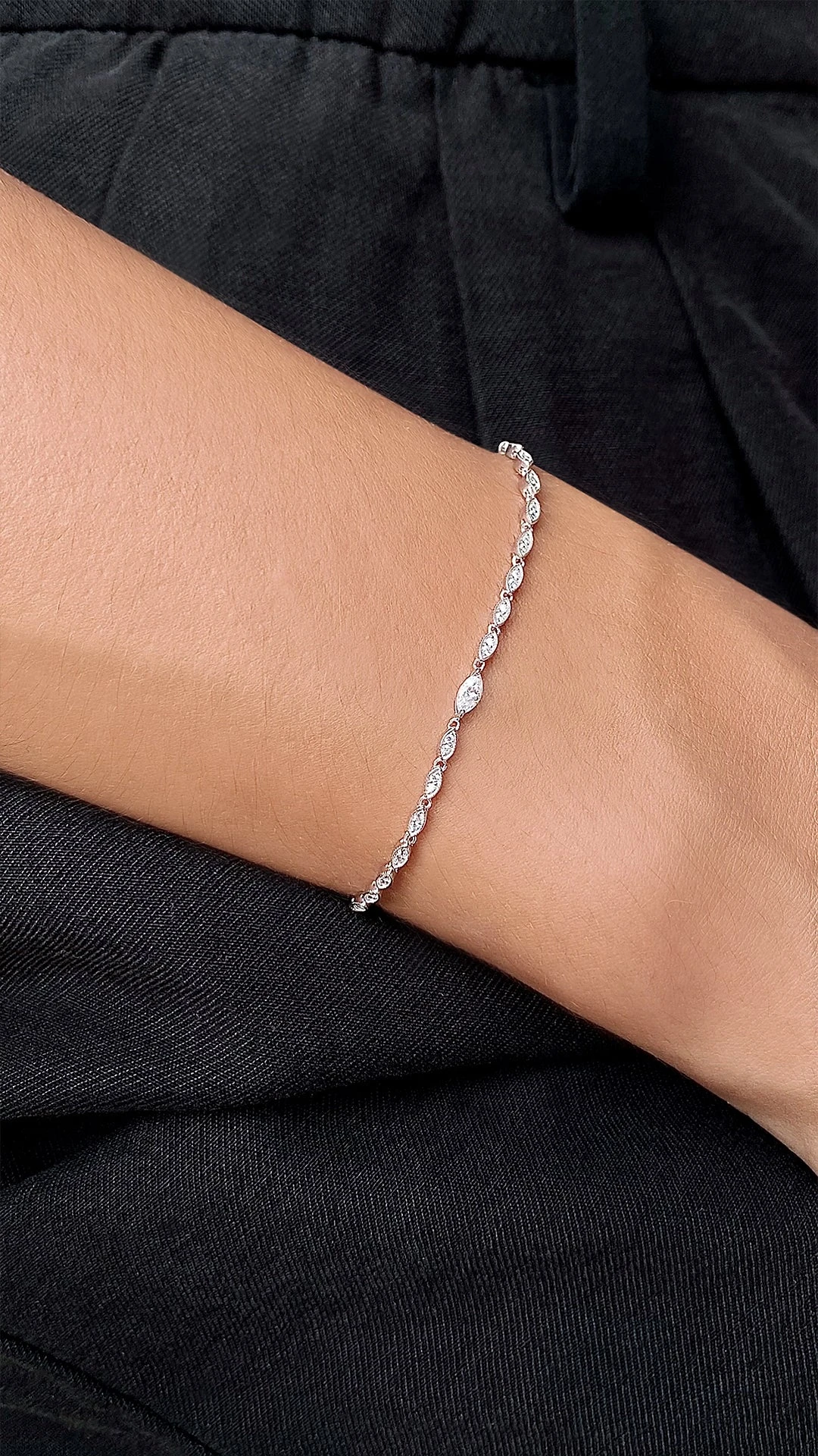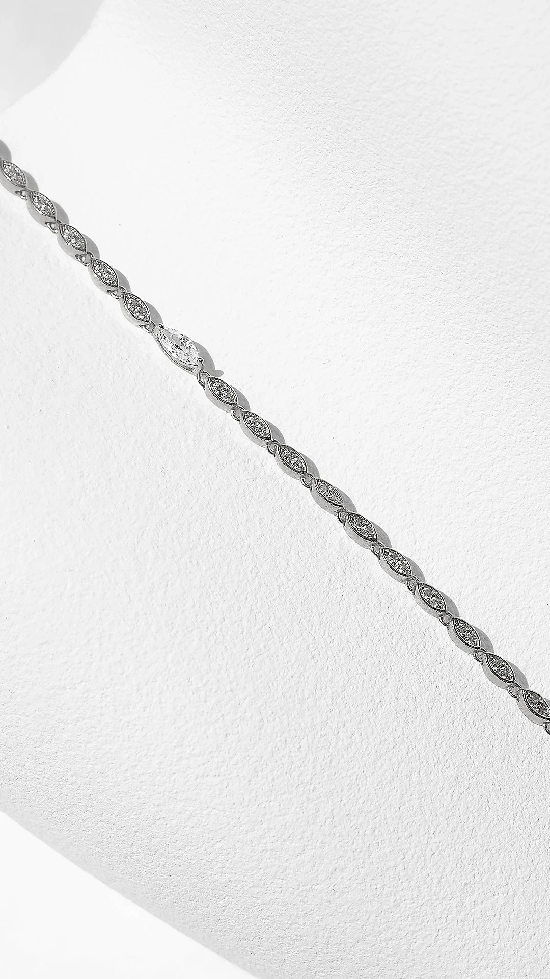 A beautiful everyday layering piece comprised of a row of dazzling marquise shapes. A single larger intricately-cut marquise stands out as the centre stone. Complete with slider closure for an adjustable fit. Pair with the matching Calluna necklace for a complete set.