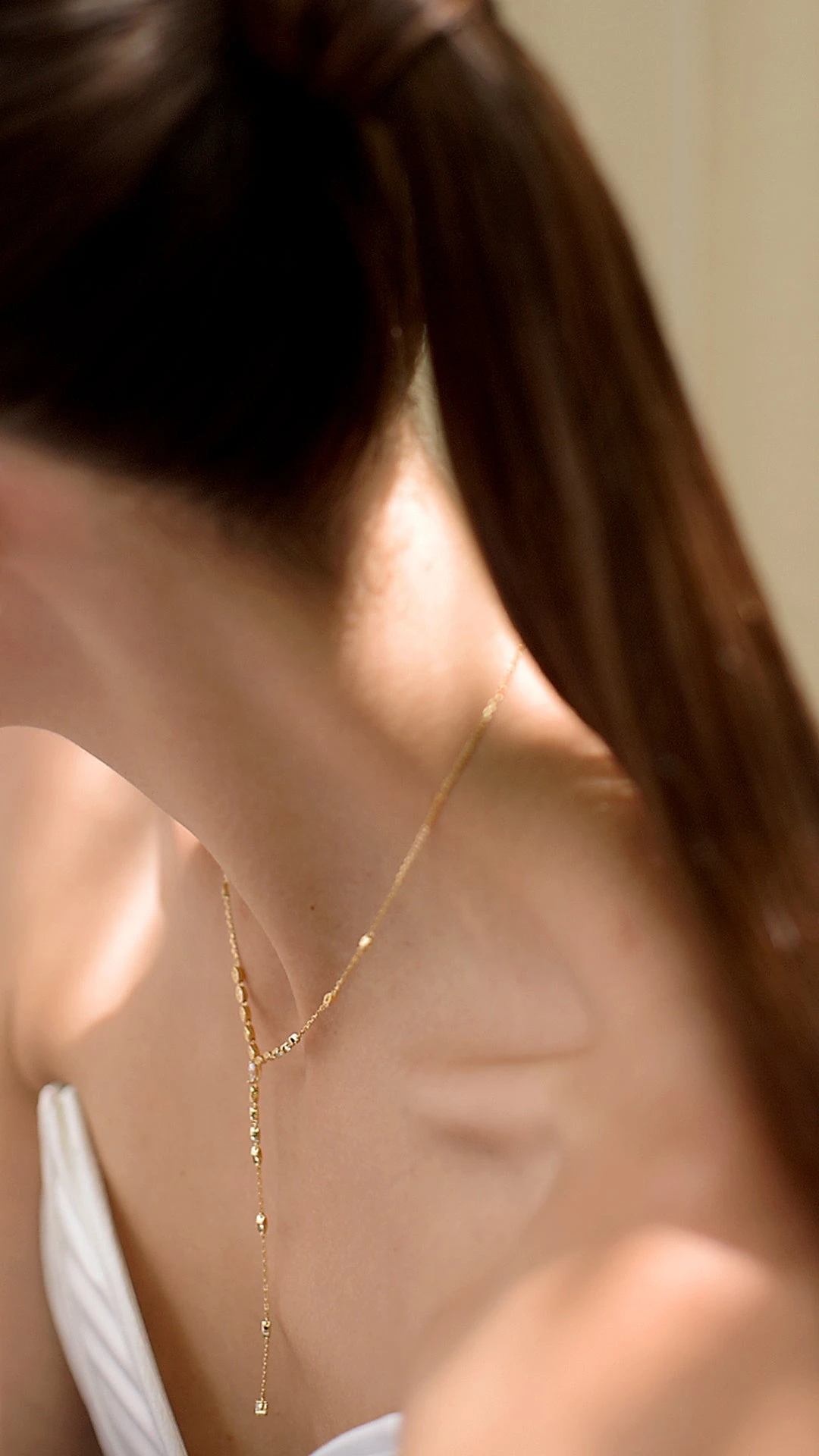 A captivating Y-shaped drop necklace comprised of intricate marquise shapes. Beautiful as a stand-out piece for a chic evening look or layered over a fine knit.