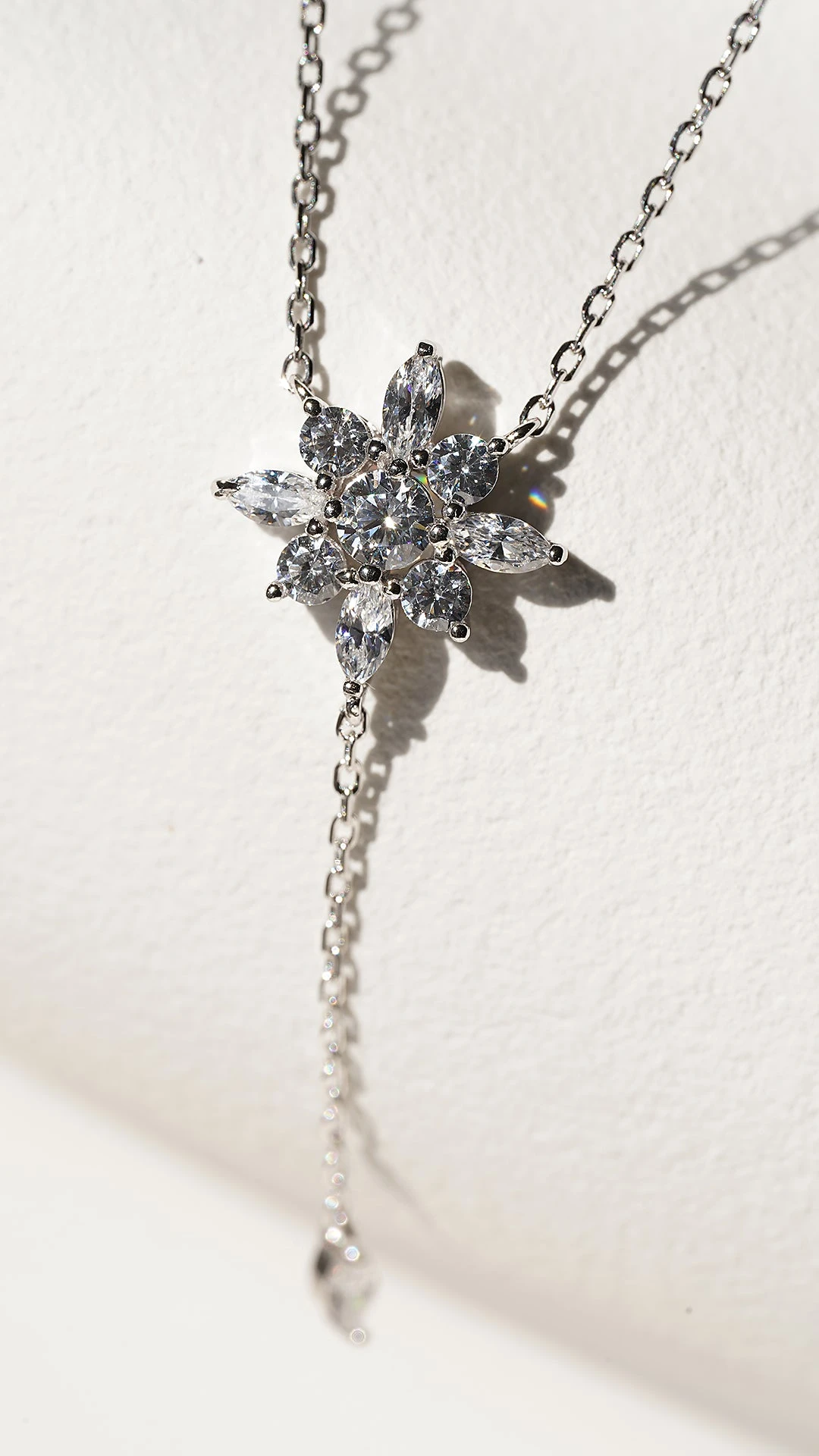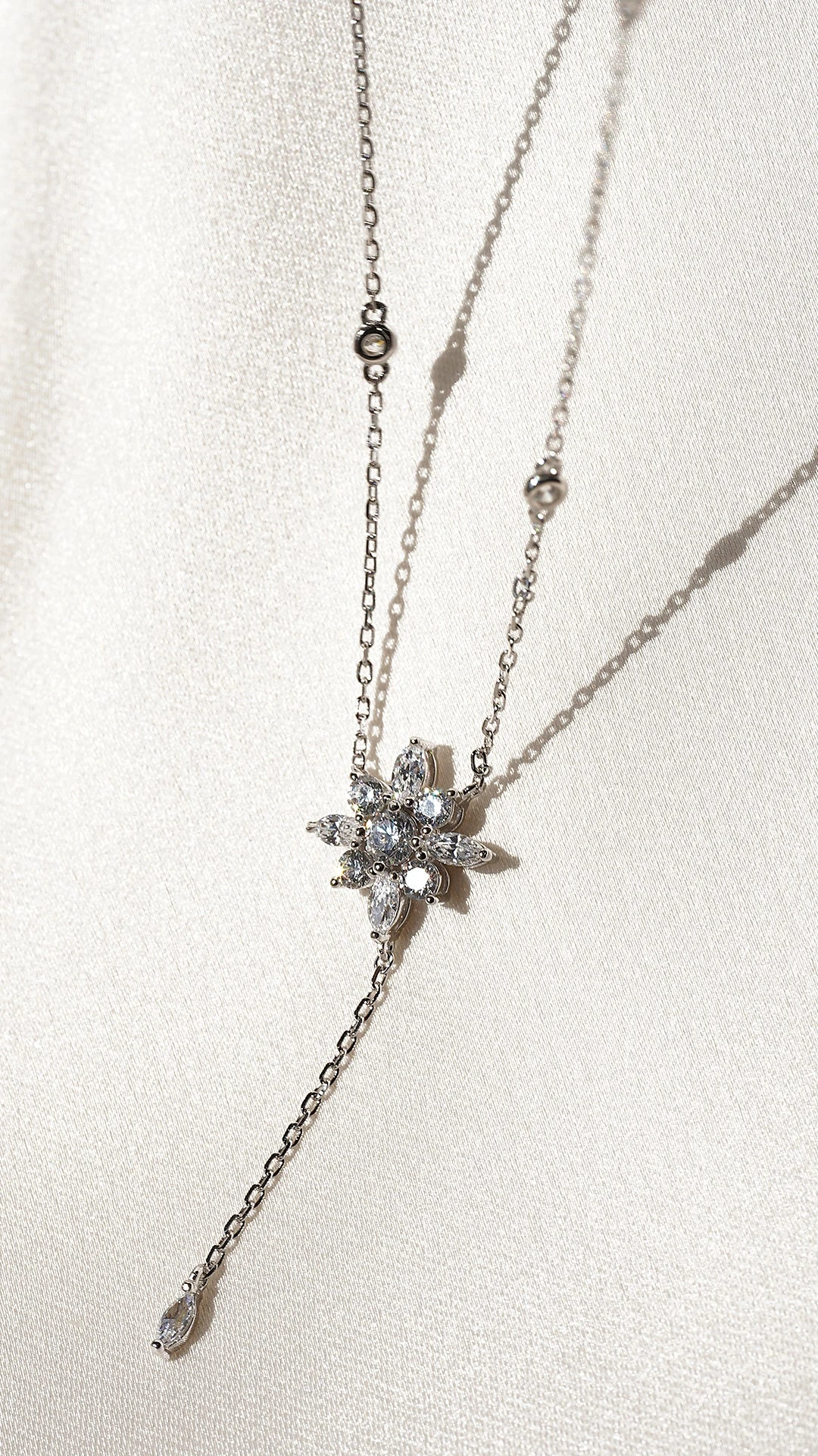 This delicately crafted lariat necklace comprises Round Brilliant and Marquise cut stones featuring an adjustable chain ball. This necklace will compliment a lower necklines. Complete with a slider closure for a fully adjustable length.