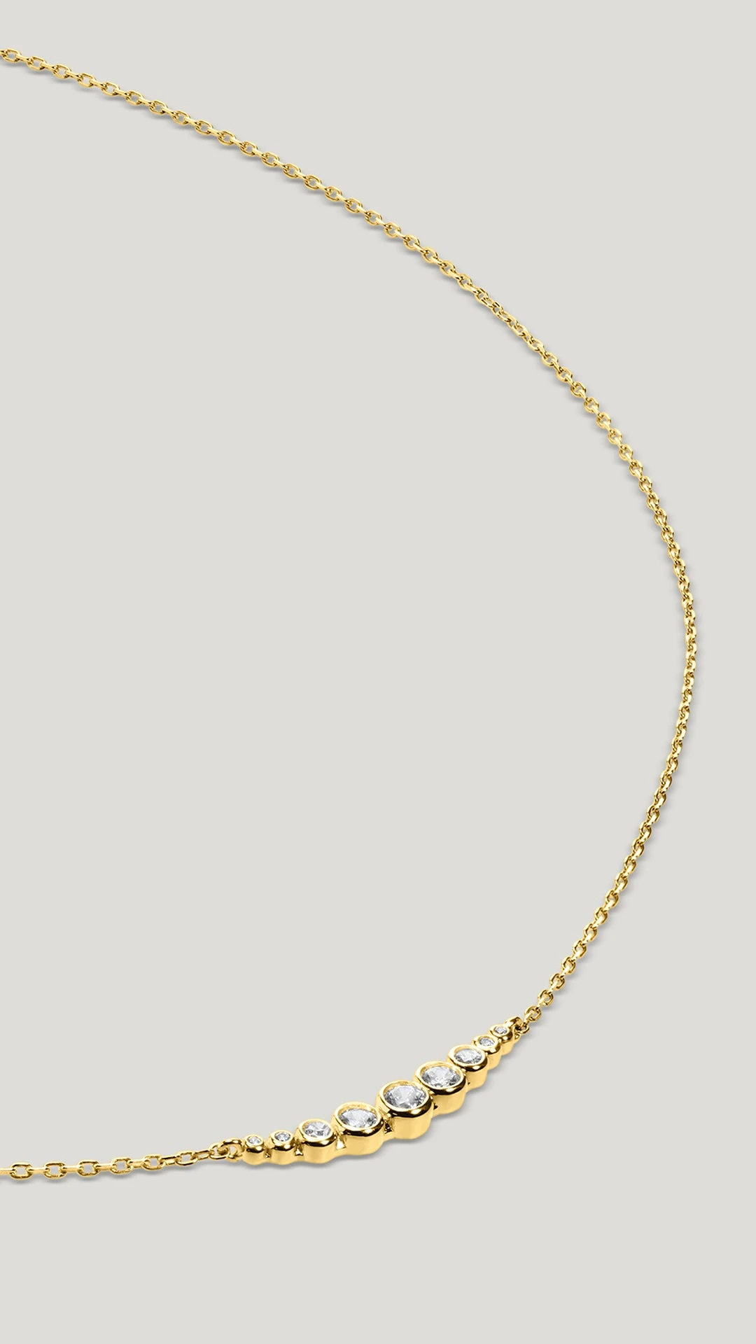 The Carissa necklace features an understated row of graduated round brilliant stones that shine beautifully. Complete with a slider closure, wear it at a length that suits you. Wear it solo with a lower neckline or stack with other pendants for a stylish, layered look.