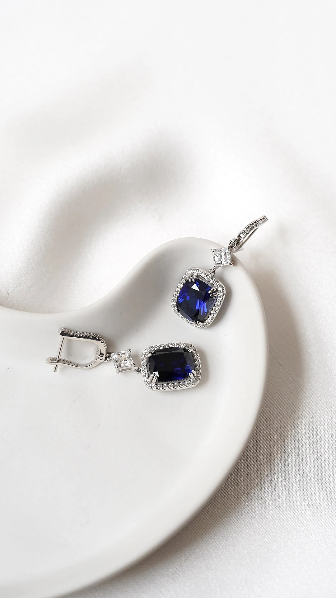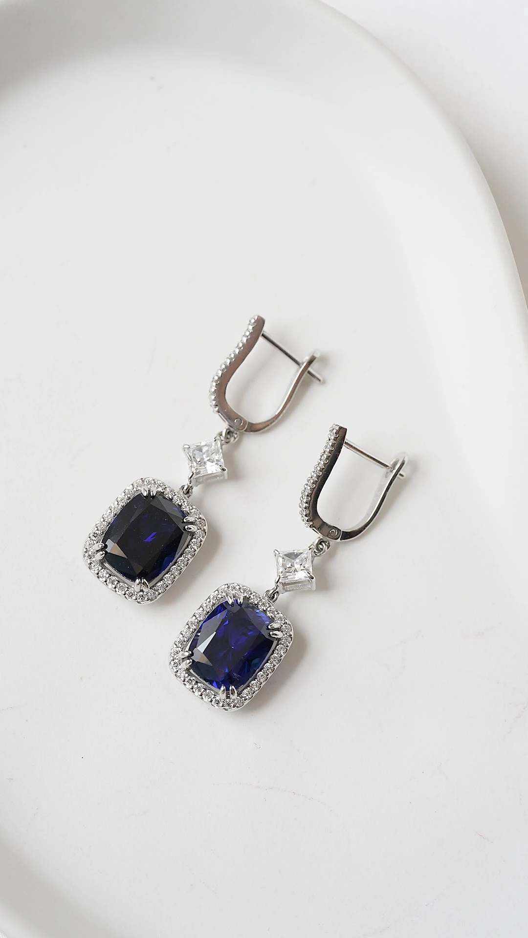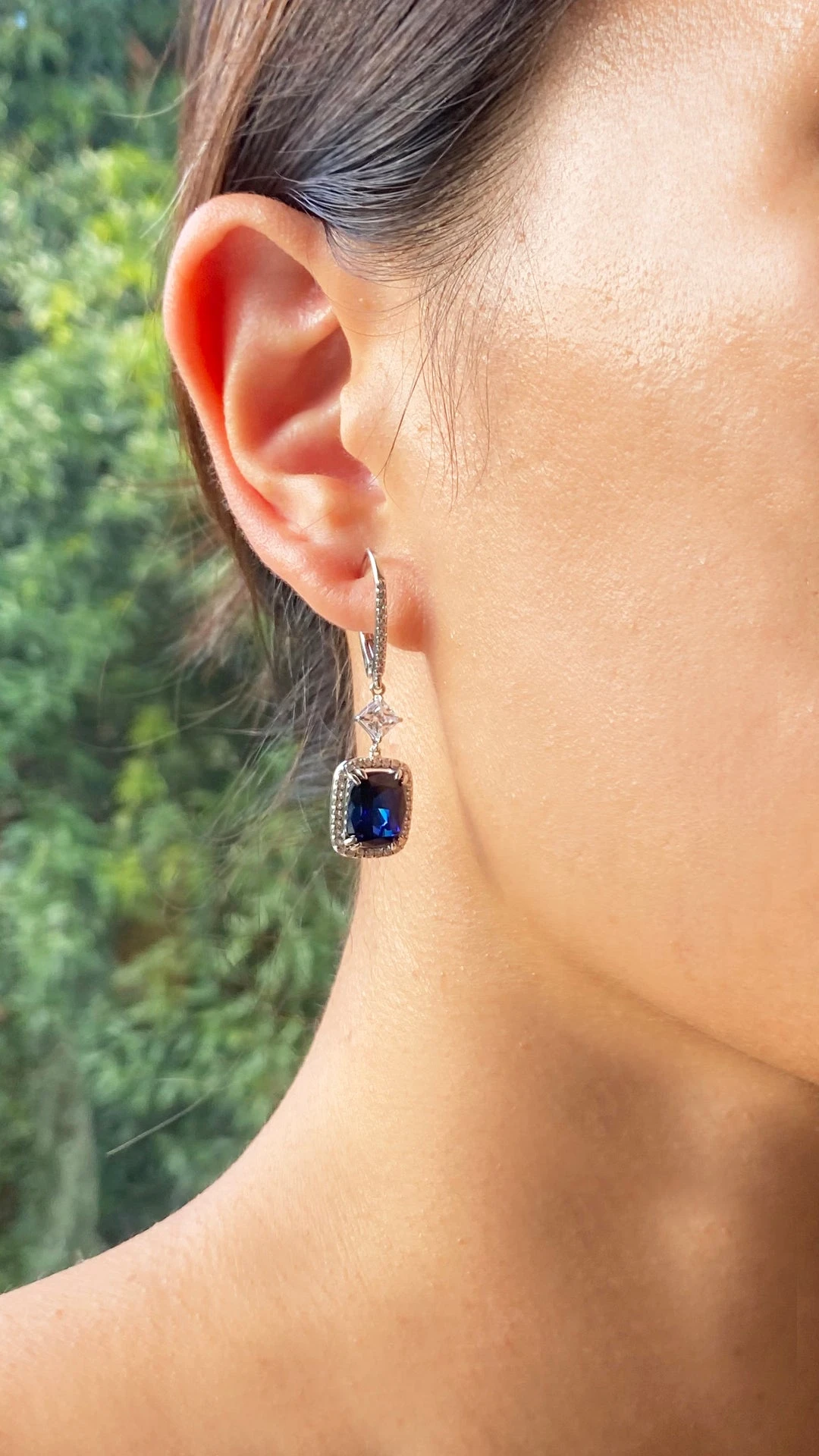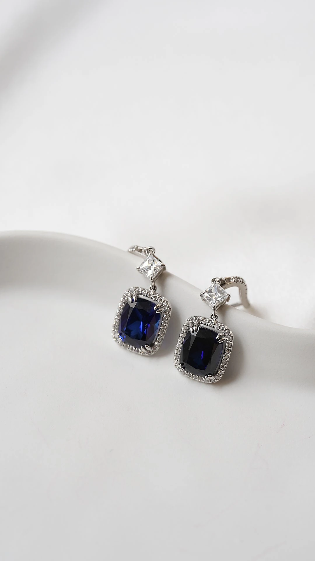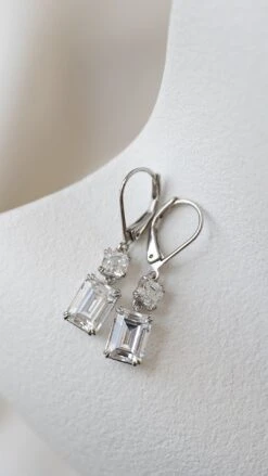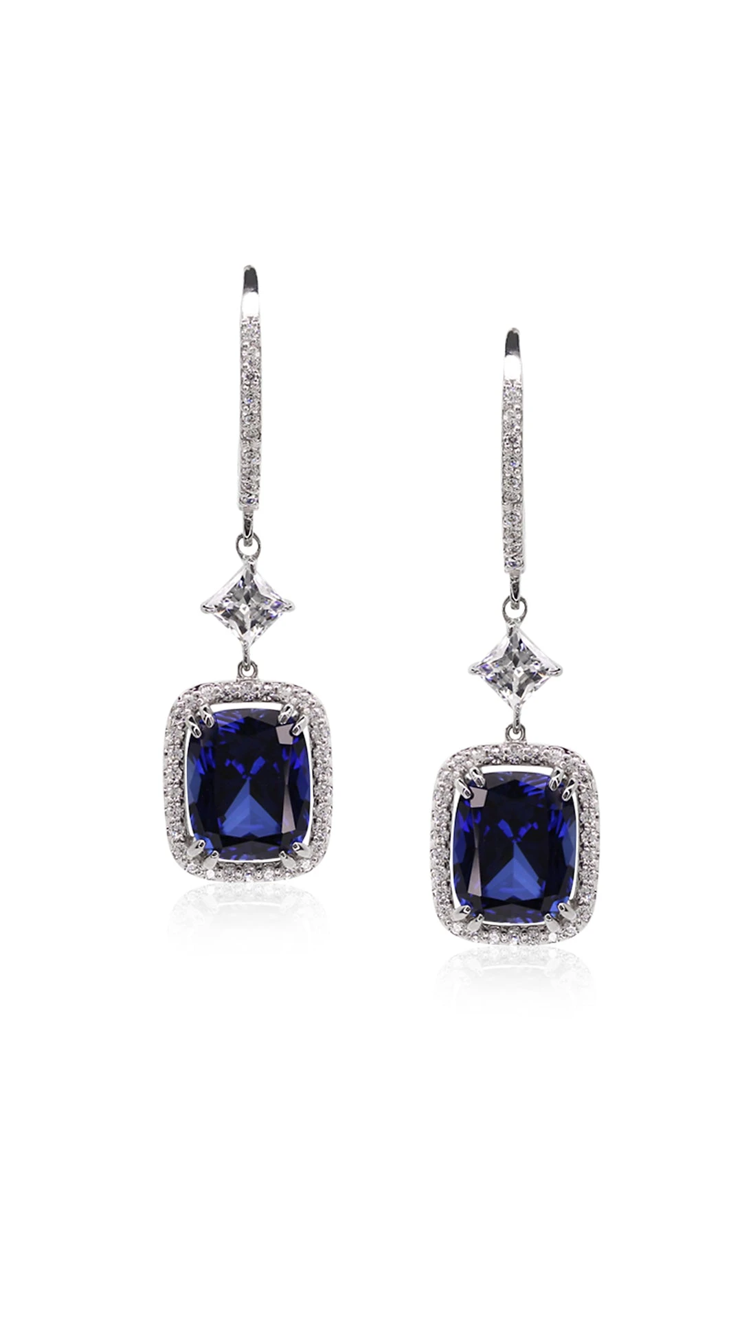 These drops feature a Cushion cut stone in created sapphire with a total drop of 4 cm when worn. A unique cocktail or party piece, wear yours to add instant impact to your little black dress.