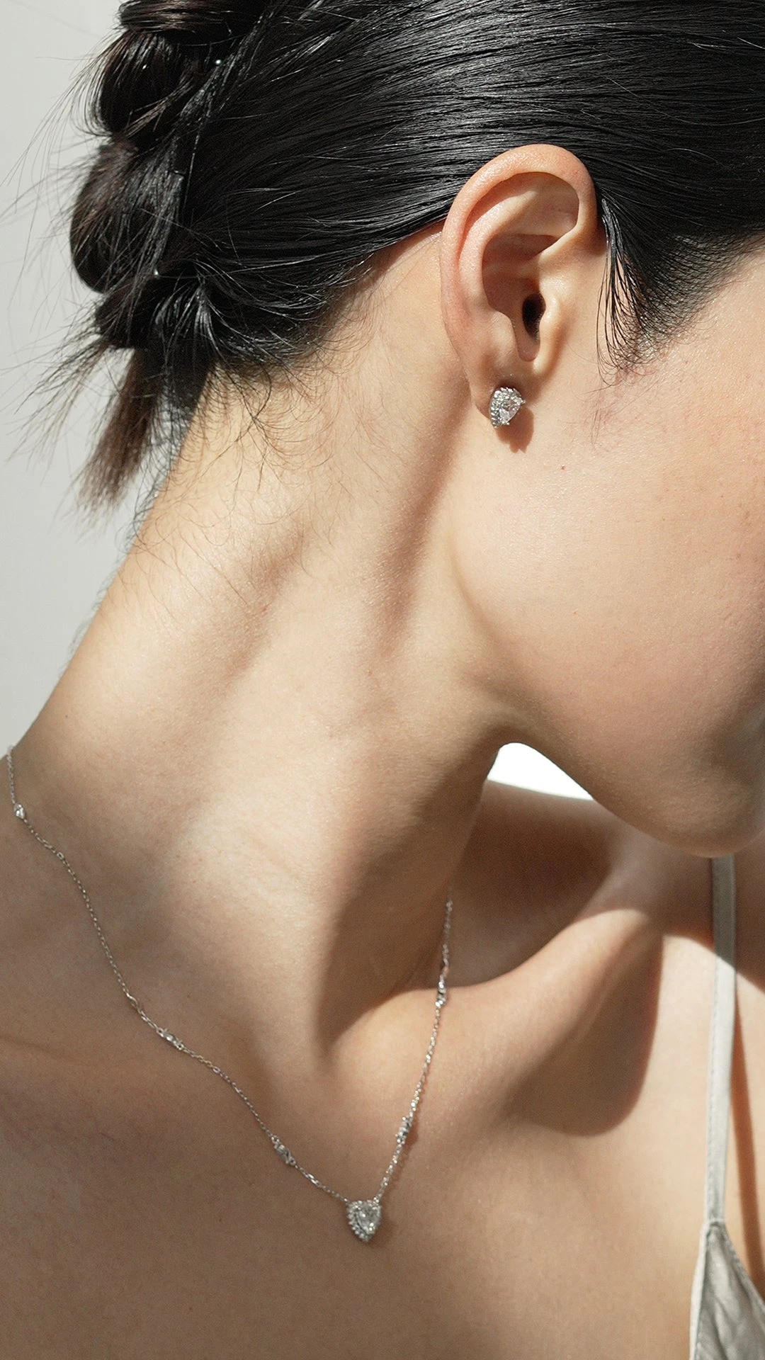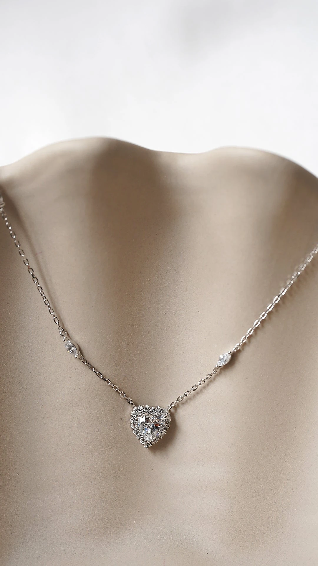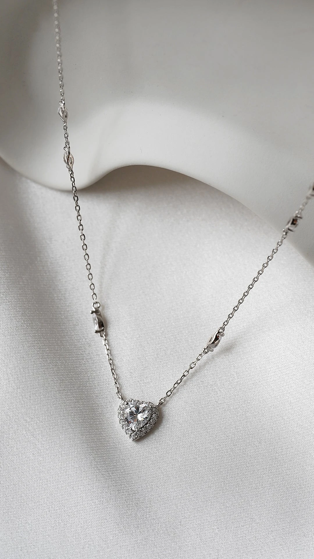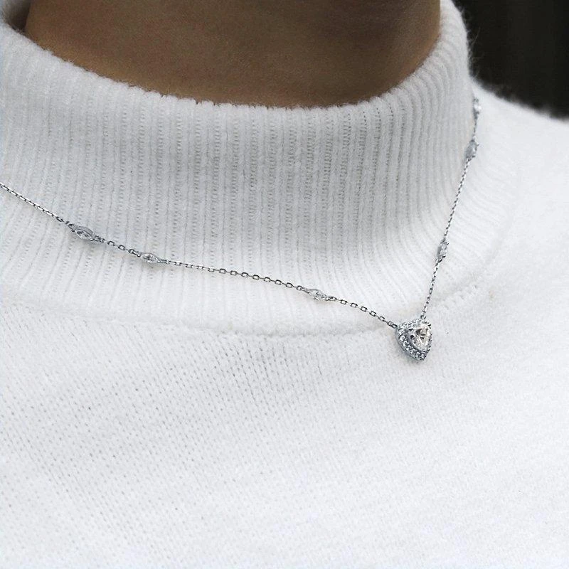 This feminine necklace is handcrafted in Sterling Silver with a White Gold finish. It features a halo border heart pendant on a delicate station chain embellished with marquise-cut stones and a secure and adjustable lobster clasp.