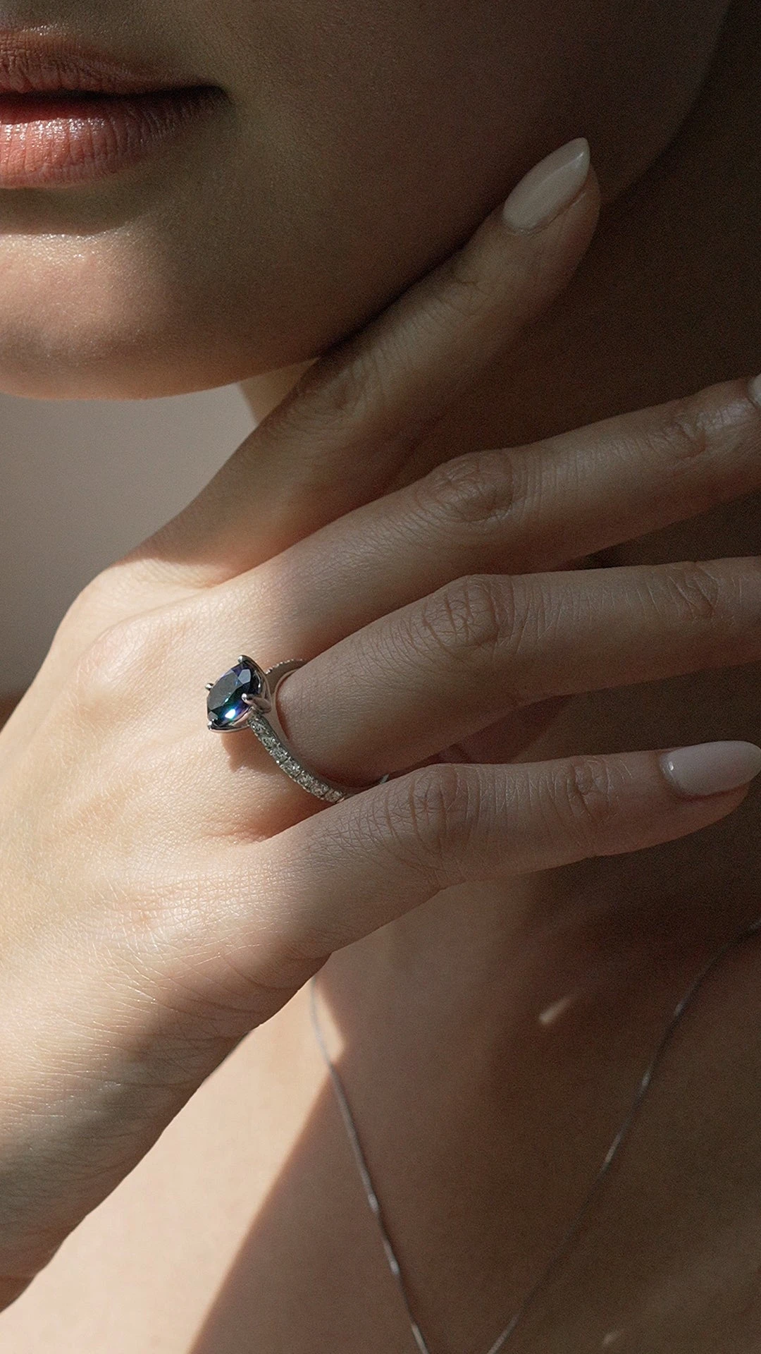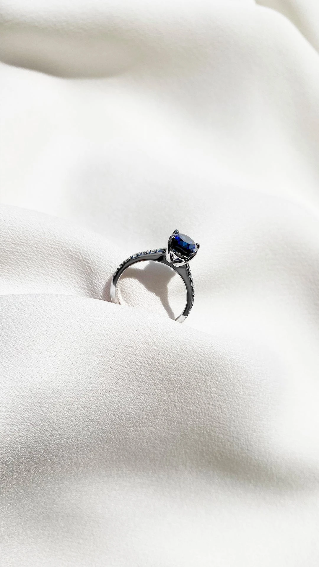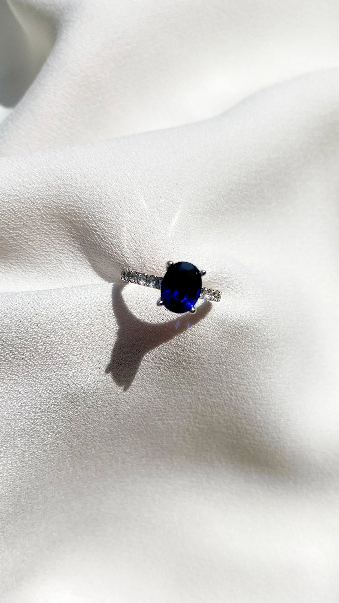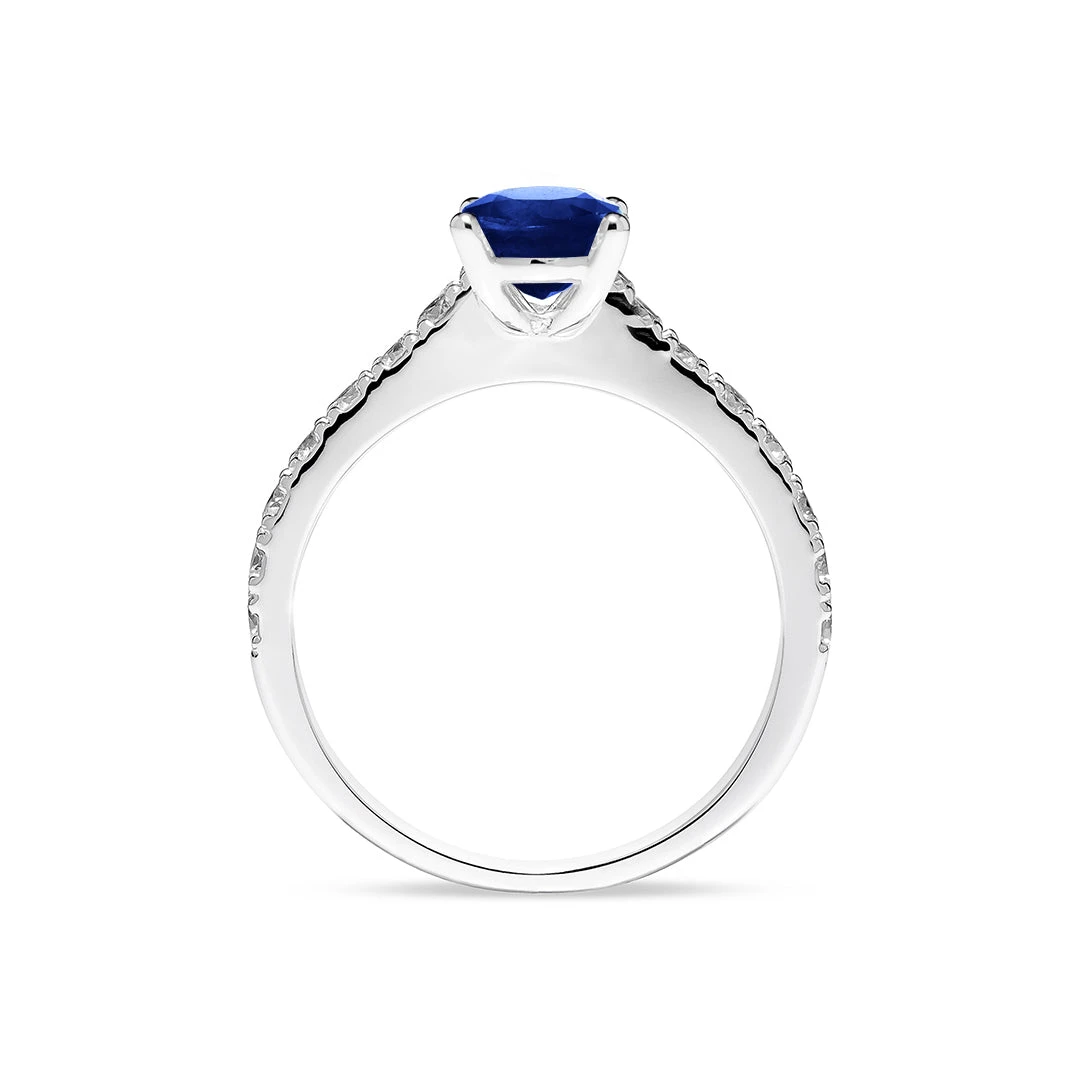 This stunning solitaire ring showcases an expertly cut oval sapphire centre stone. It is finished with an 18K white gold band with dazzling diamonds placed elegantly around the band. Simply breathtaking, this ring is a beautiful way to begin your next chapter together.