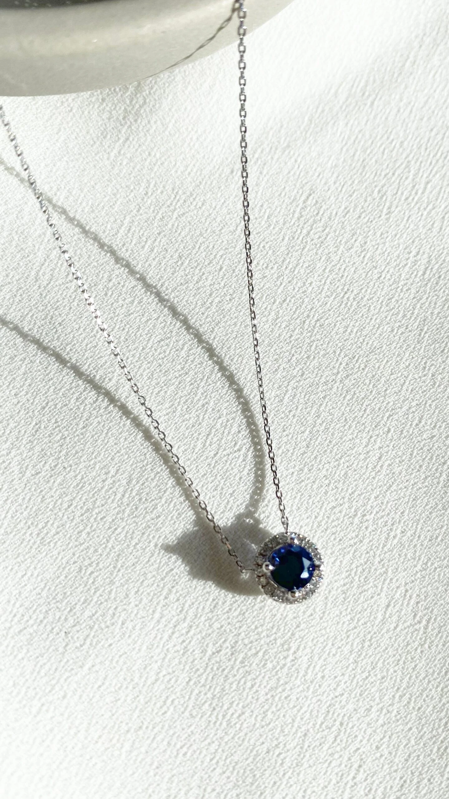 This beautiful 1.00ct round brilliant lab-created sapphire solitaire is showcased in a classic halo setting allowing for maximum light reflection. Featuring the signature GENTLE DIAMOND secret heart setting behind the gemstone, the pendant is strung from a delicate 18K gold chain with slider mechanism up to 45cm length. Wear it solo to add a touch of classic elegance to your look.