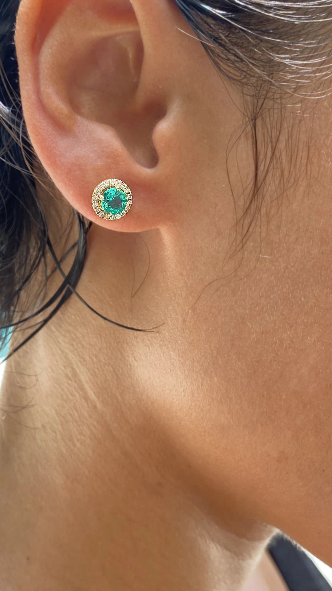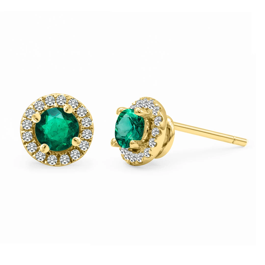 The Cory stud earrings showcase a captivating round emerald surrounded by a shimmering halo of diamonds, all beautifully set in 18K yellow gold. This timeless pair works day-to-night and is sure to be a favourite.