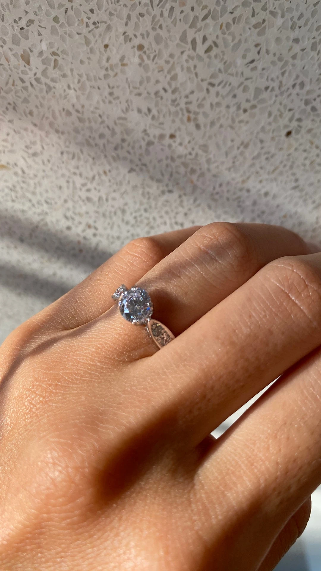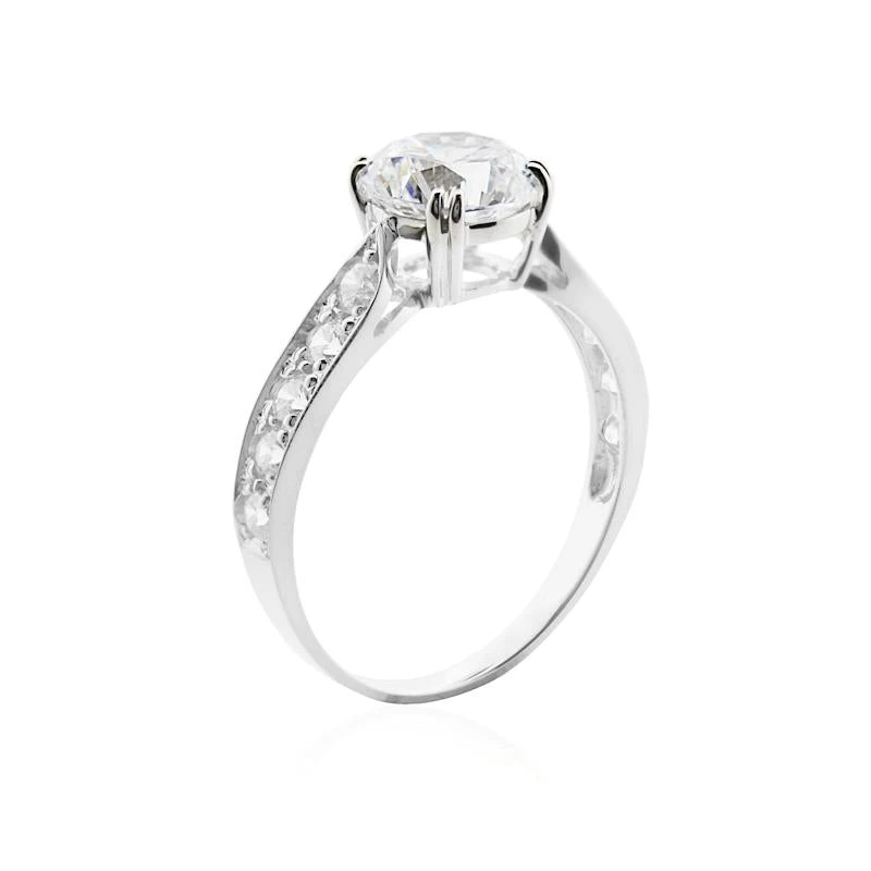 Round brilliant cut stone double prong set into a channel set eternity band in 9K white gold.