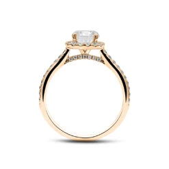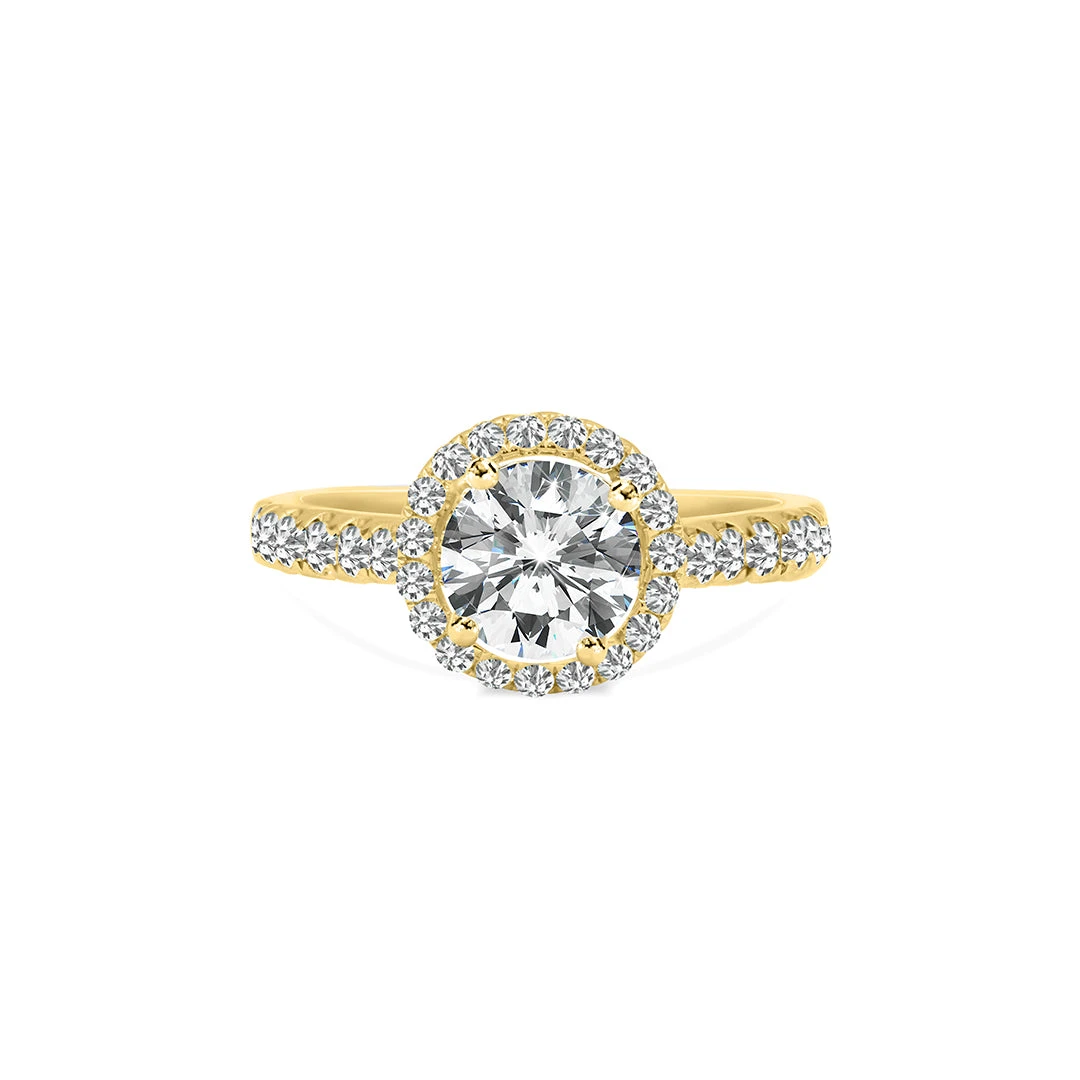 This ring is comprised of a stunning round brilliant diamond that sparkles from every angle surrounded by a halo of smaller diamonds. The ring is further enhanced by diamond microsettings placed halfway alongside the band. Handcrafted with an elevated setting in 18K yellow gold. Make this beautiful ring the one she will cherish for a lifetime.