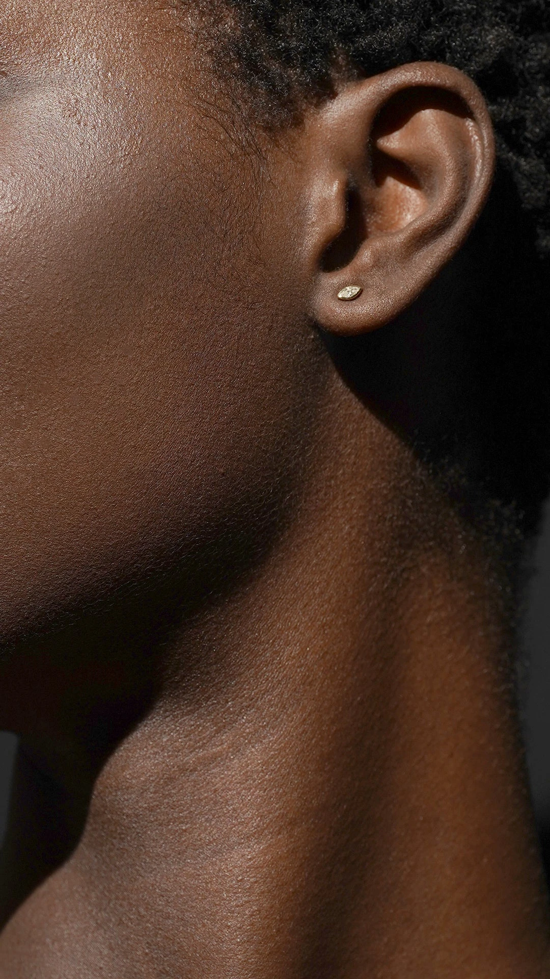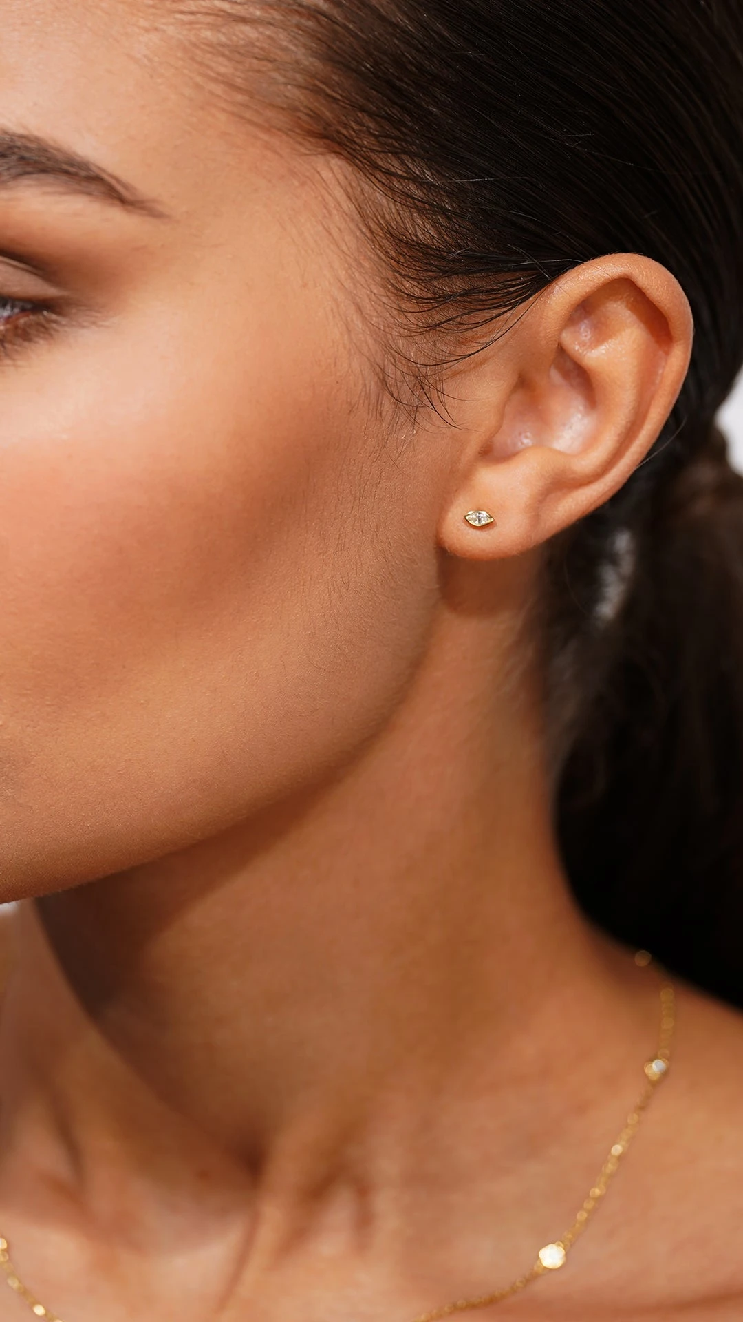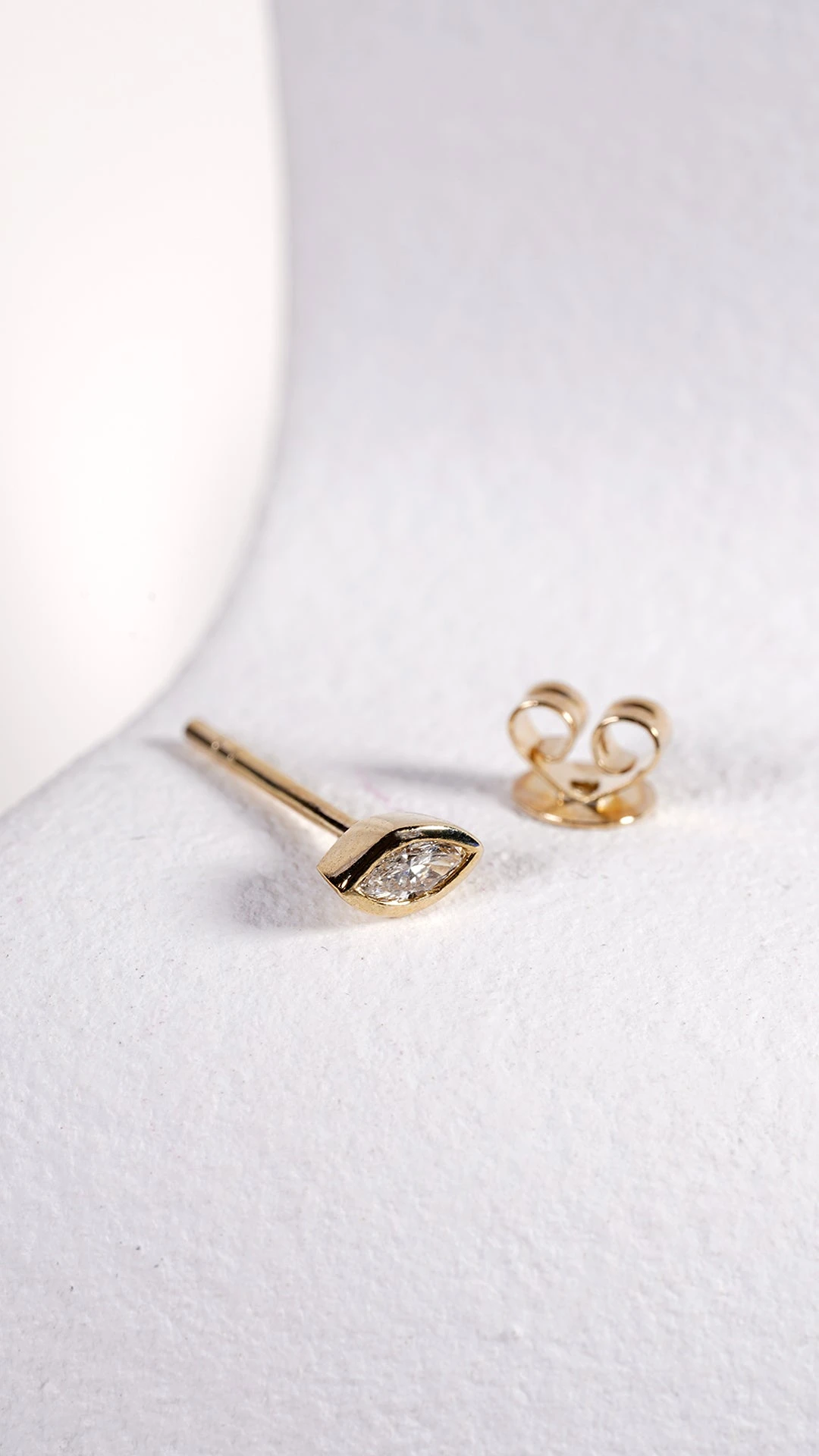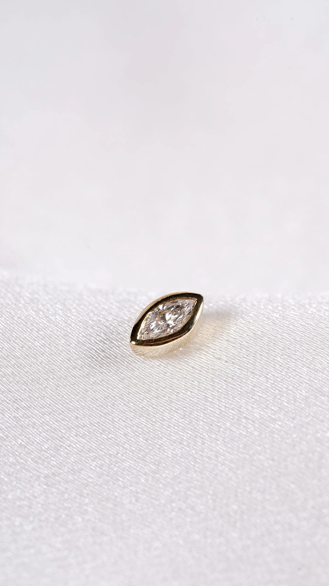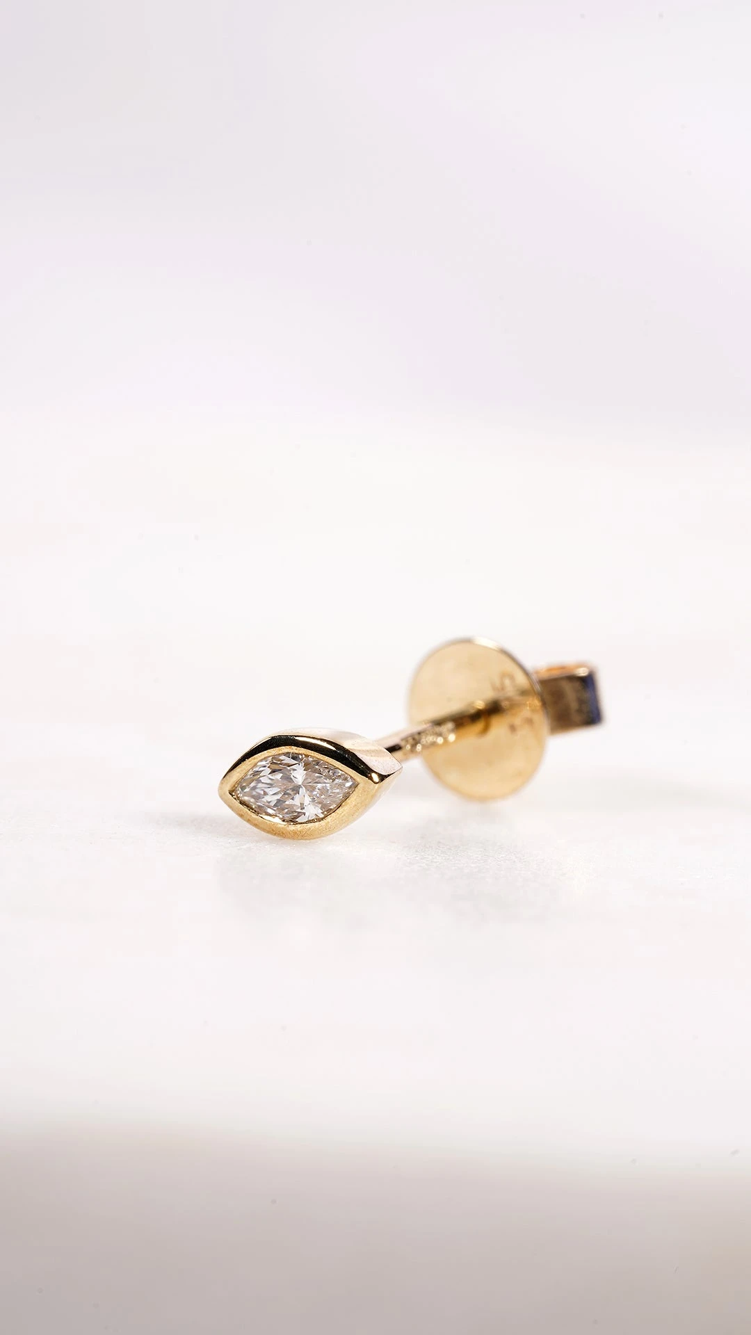 A single marquise cut diamond set in a polished 9K gold bezel setting. It is perfect to wear daily and works well for second or third piercings.