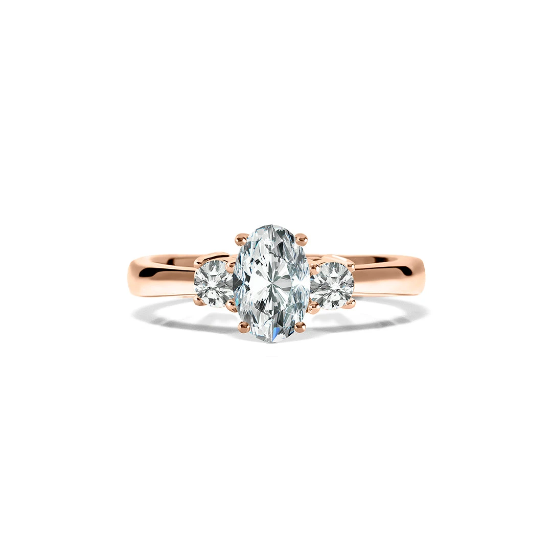 An elegant oval cut diamond is set between two smaller round brilliant side stones in this beautiful trilogy diamond ring. This elegant trilogy style showcases expertly cut diamonds mounted in a polished gold finish. Make the most special moment of your life truly unforgettable with this ring she will cherish for a lifetime ahead.