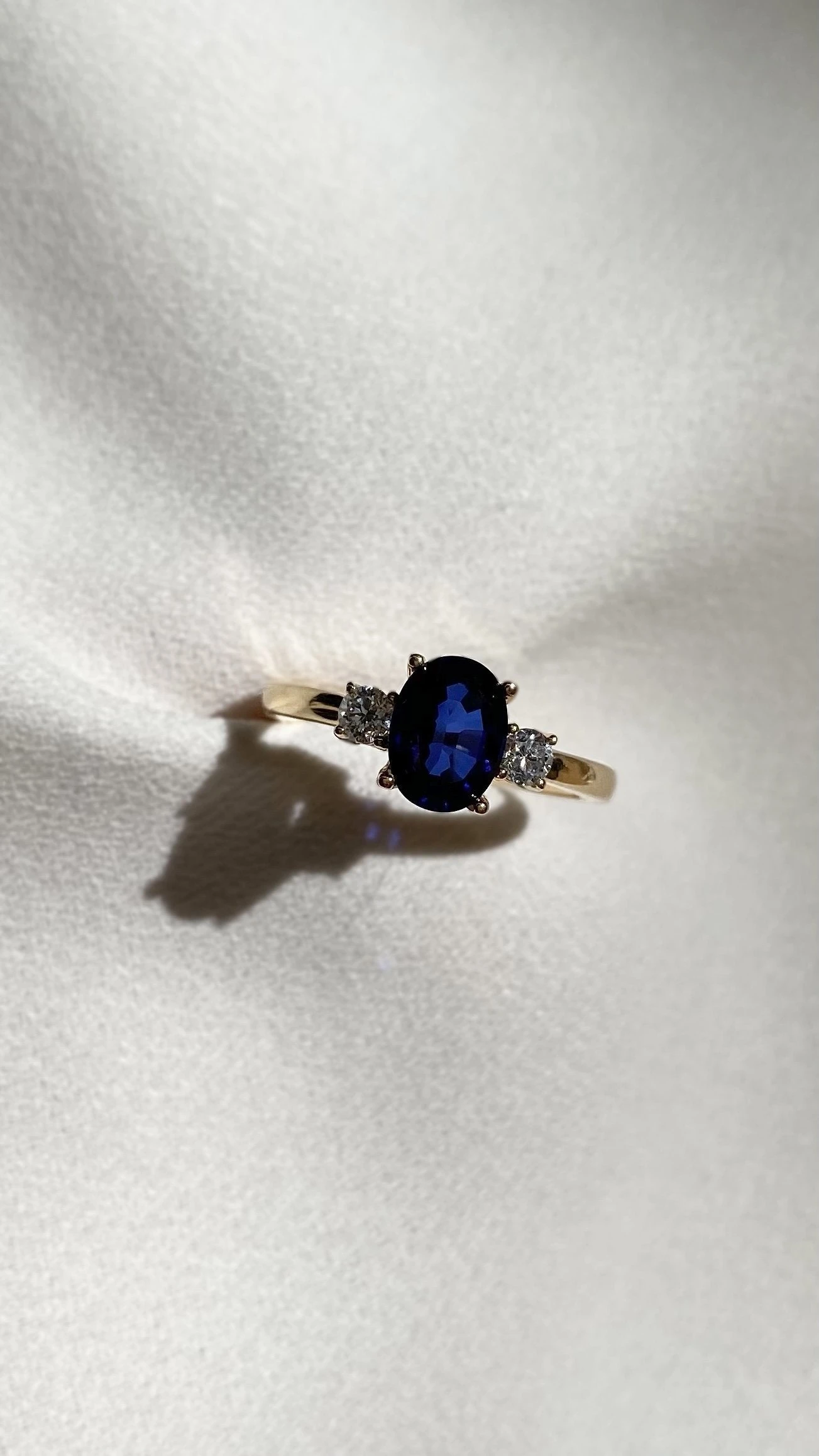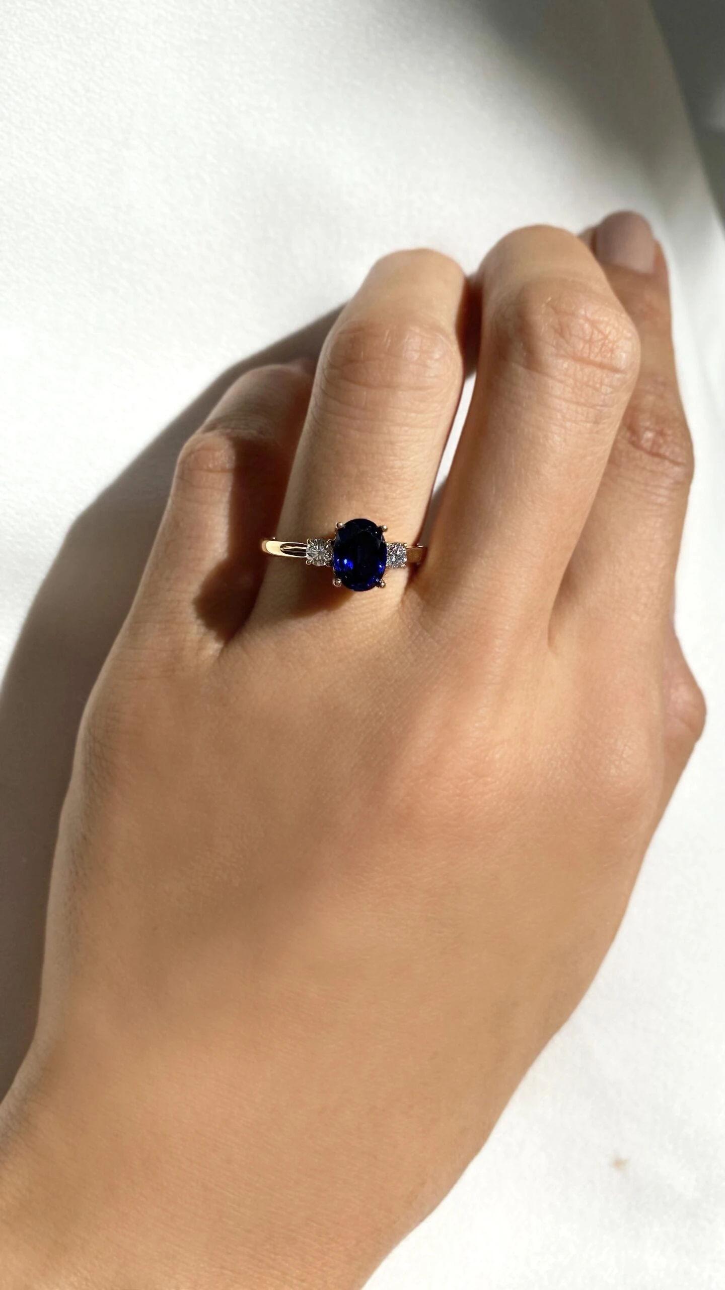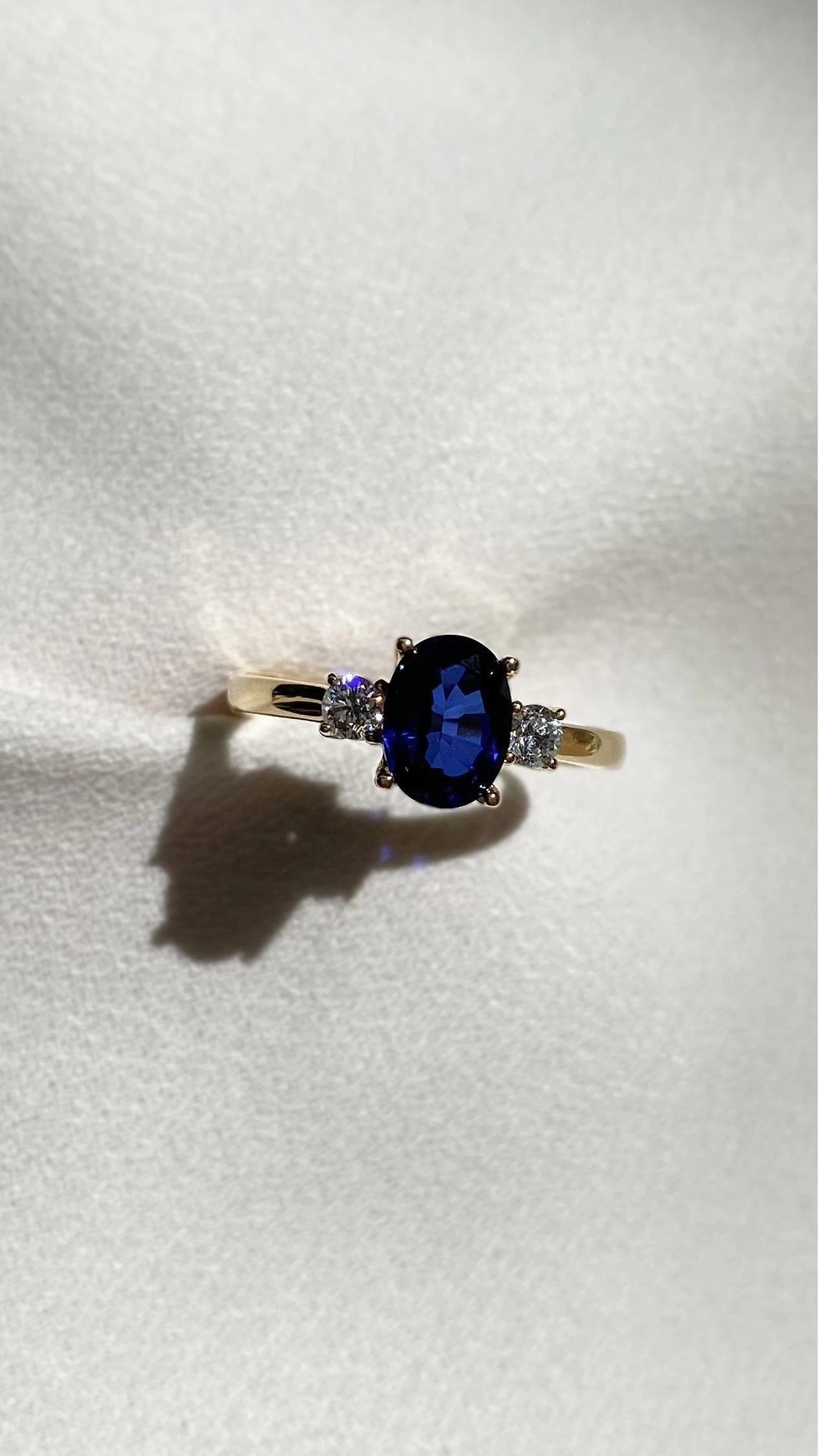 An elegant 3.00ct oval cut gemstone is set between two smaller round brilliant side stones in this beautiful trilogy diamond ring. This elegant trilogy style showcases expertly cut stones mounted in a polished 18K gold. Make the most special moment of your life truly unforgettable with this ring she will cherish for a lifetime ahead.
