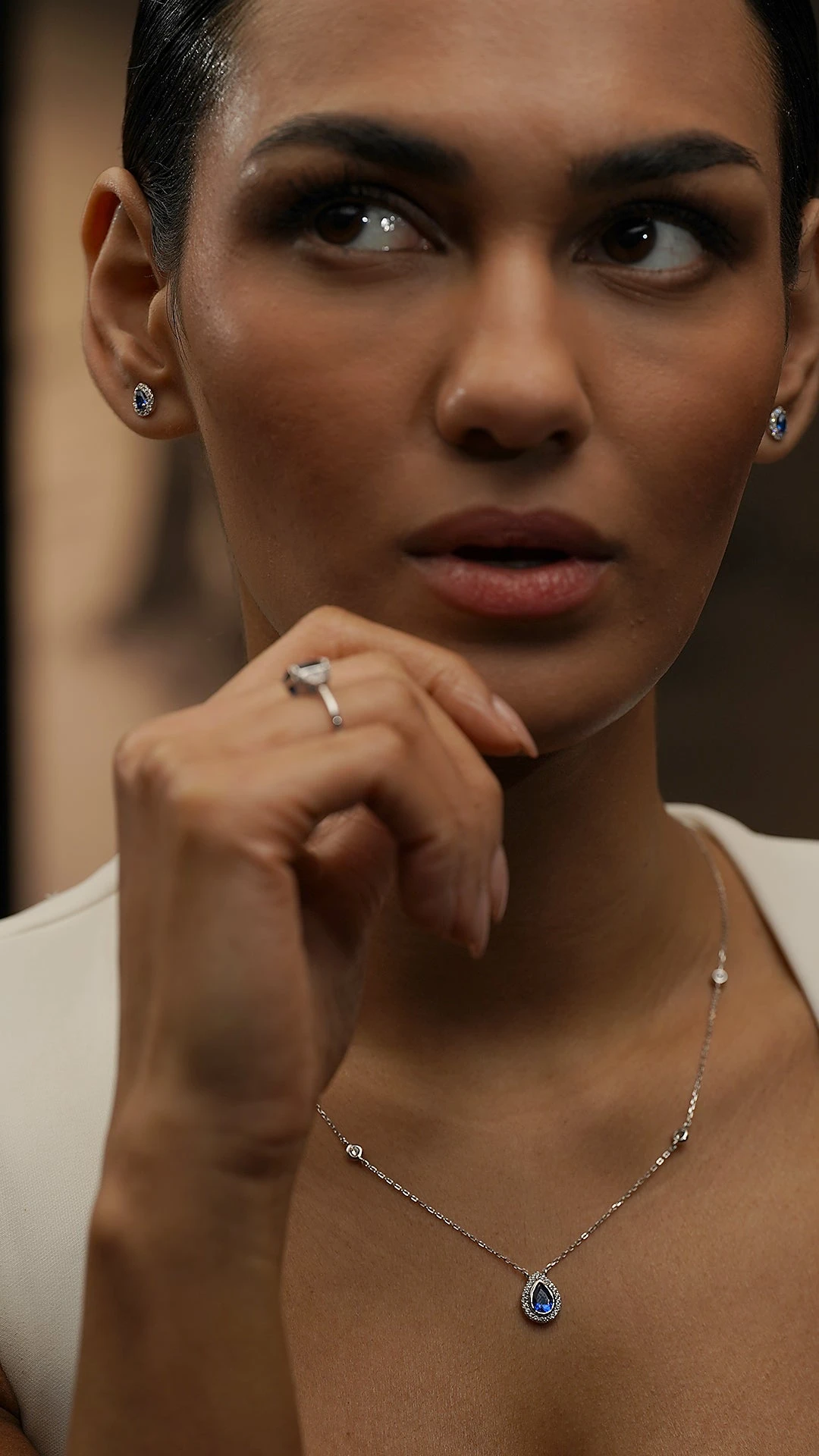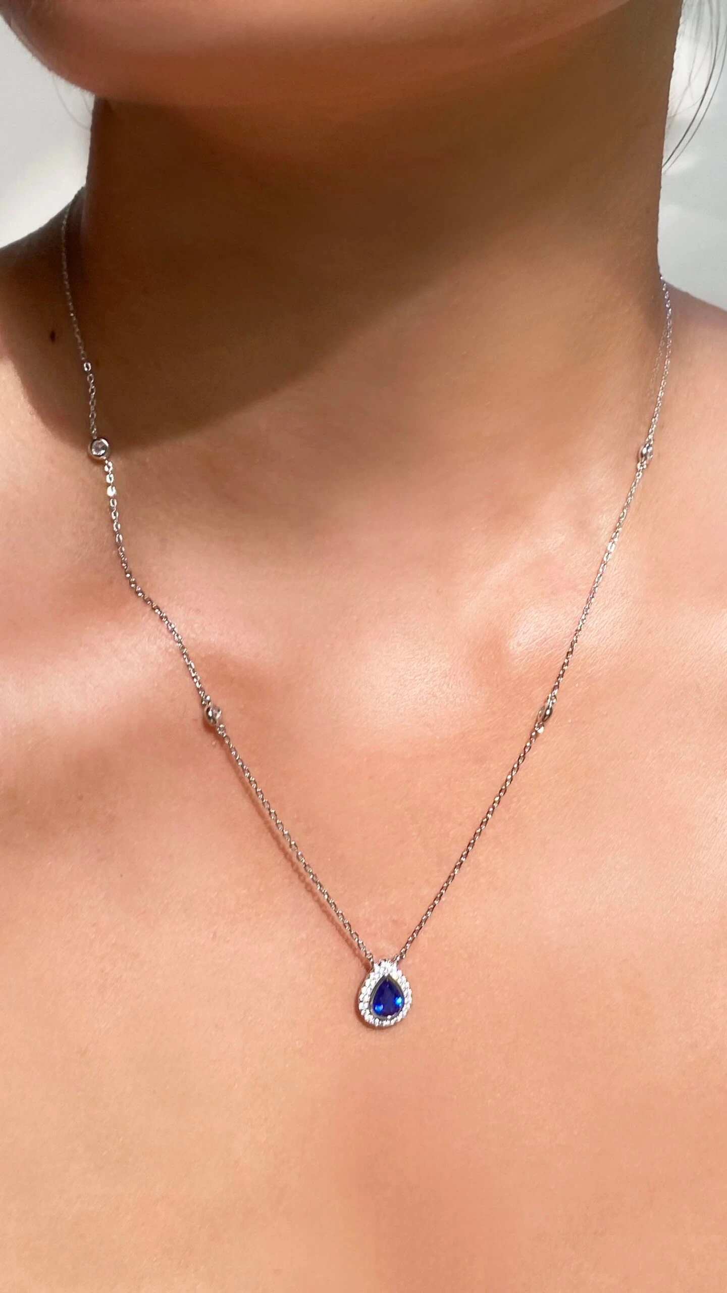 This gorgeous sapphire blue pear necklace is just what you need to add some understated sparkle to any outfit. Wear it with a basic T-shirt to add glamour, or pair it with pear-drop earrings to elevate your evening look.
