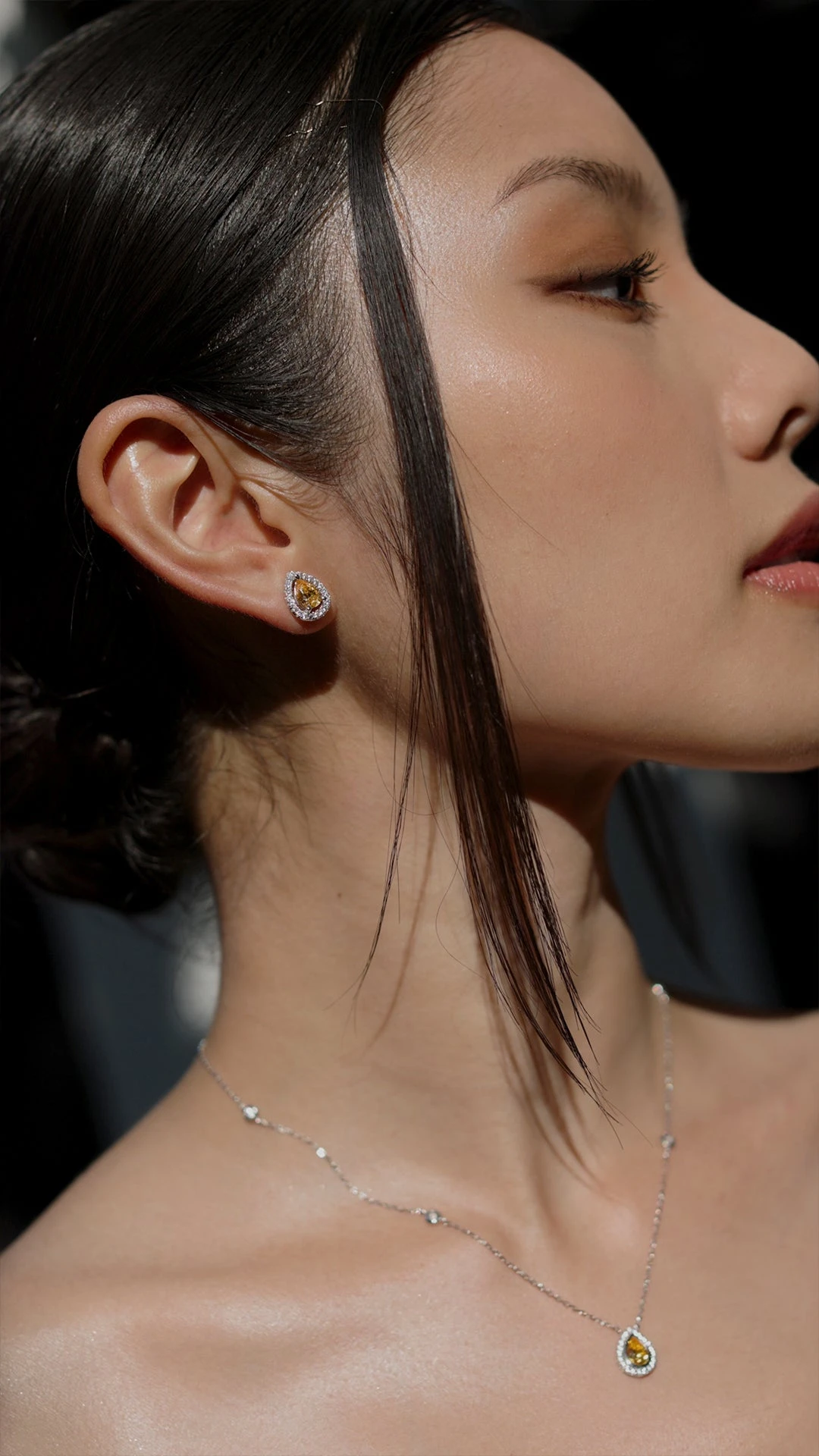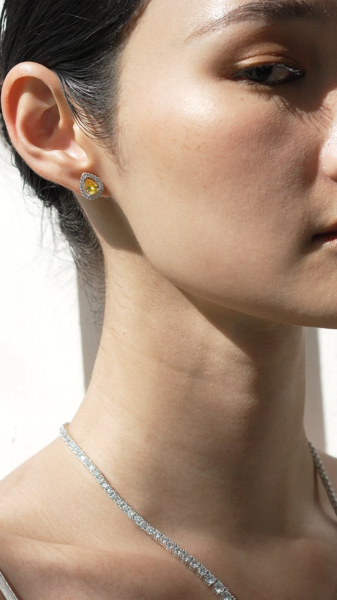 These classic studs feature an exquisite border halo setting with a stunning fancy yellow pear cut centre stone. Wear it as your everyday basic.