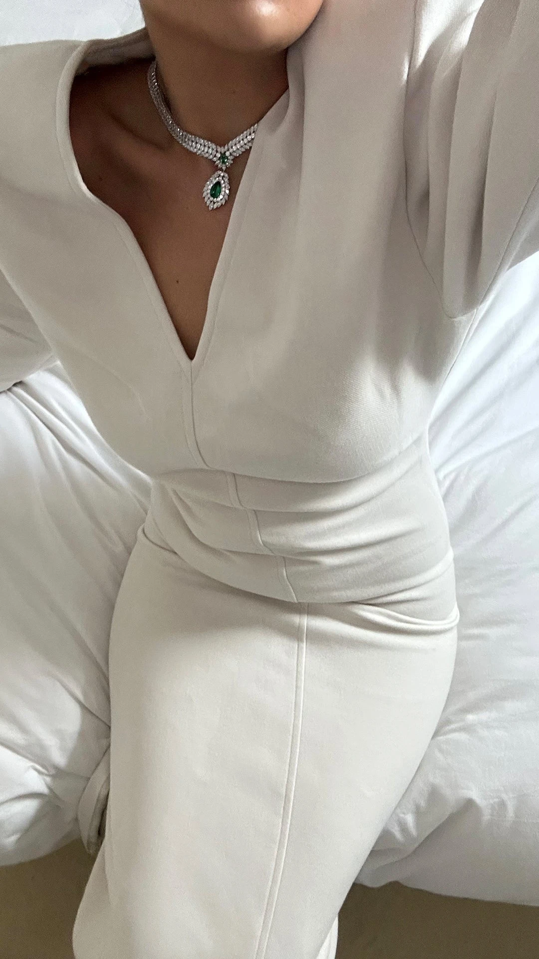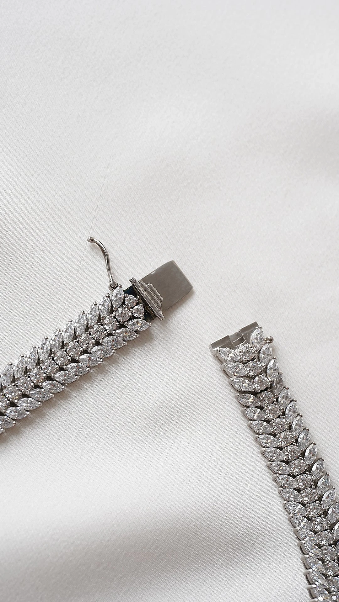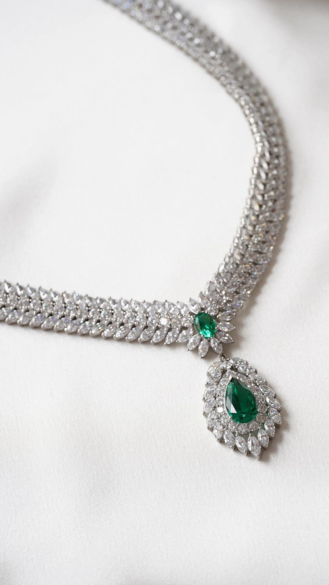 This stunning necklace features a pear center stone in 3.25ct. eq. in Sterling Silver with white gold plating with total drop of 4.7cm. A stunning compliment to our matching Evergreen earrings, bracelet and ring. A perfect evening piece.