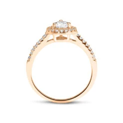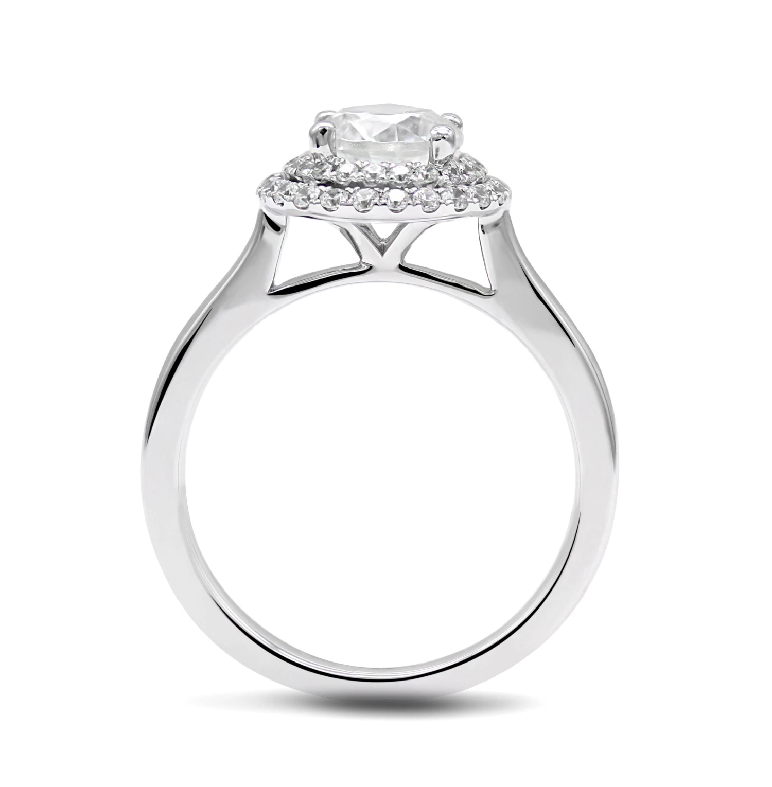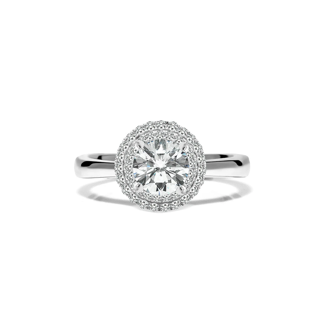 This ring is comprised of a beautiful round brilliant diamond surrounded by a double halo of smaller diamonds for added sparkle. Handcrafted with an elevated setting in 18K white gold. Make this ring the one she will cherish for a lfietime.