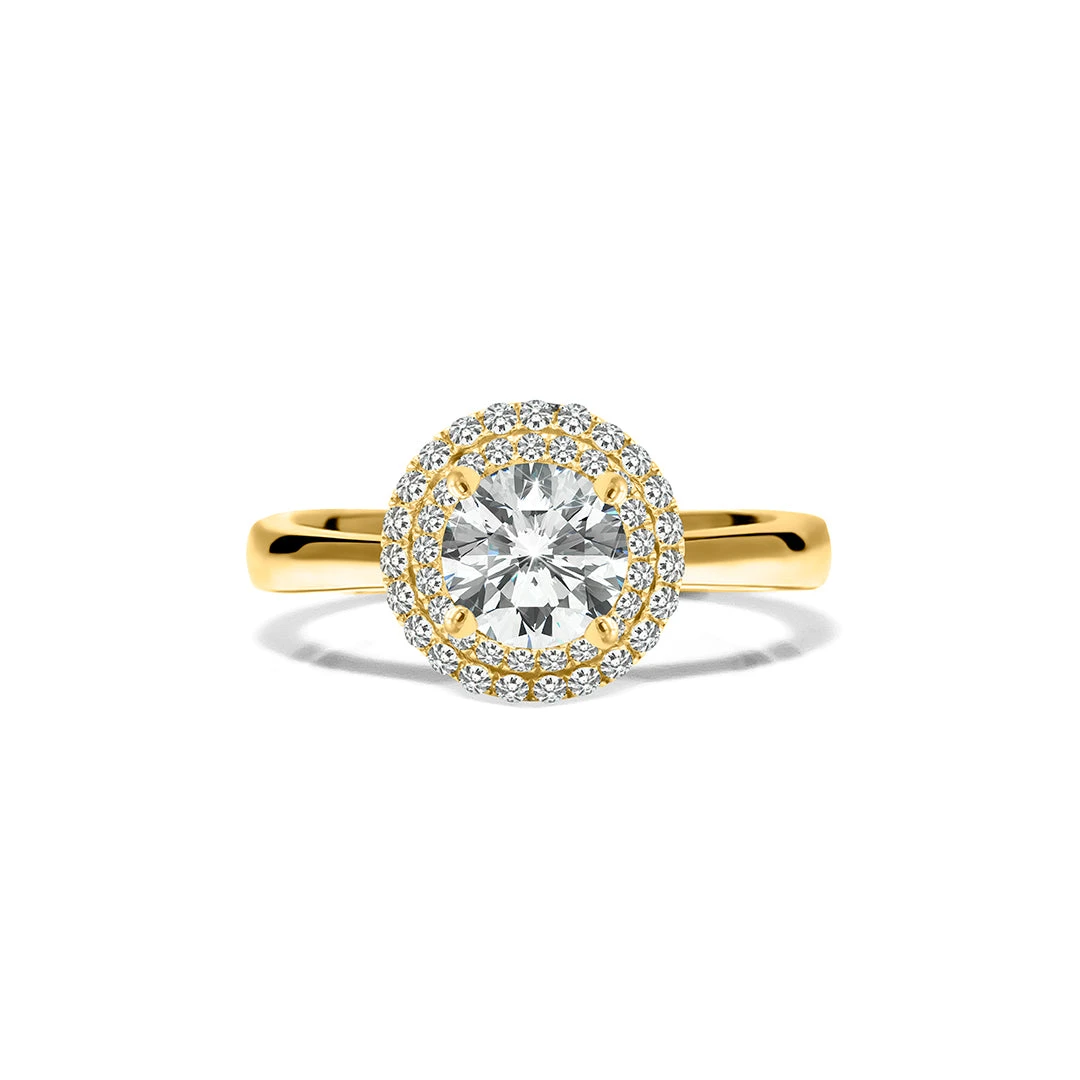 This ring is comprised of a beautiful round brilliant diamond surrounded by a double halo of smaller diamonds for added sparkle. Handcrafted with an elevated setting in 18K yellow gold. Make this ring the one she will cherish for a lifetime.