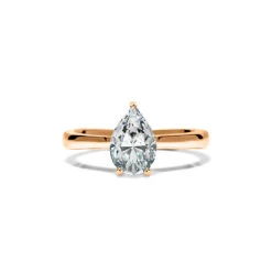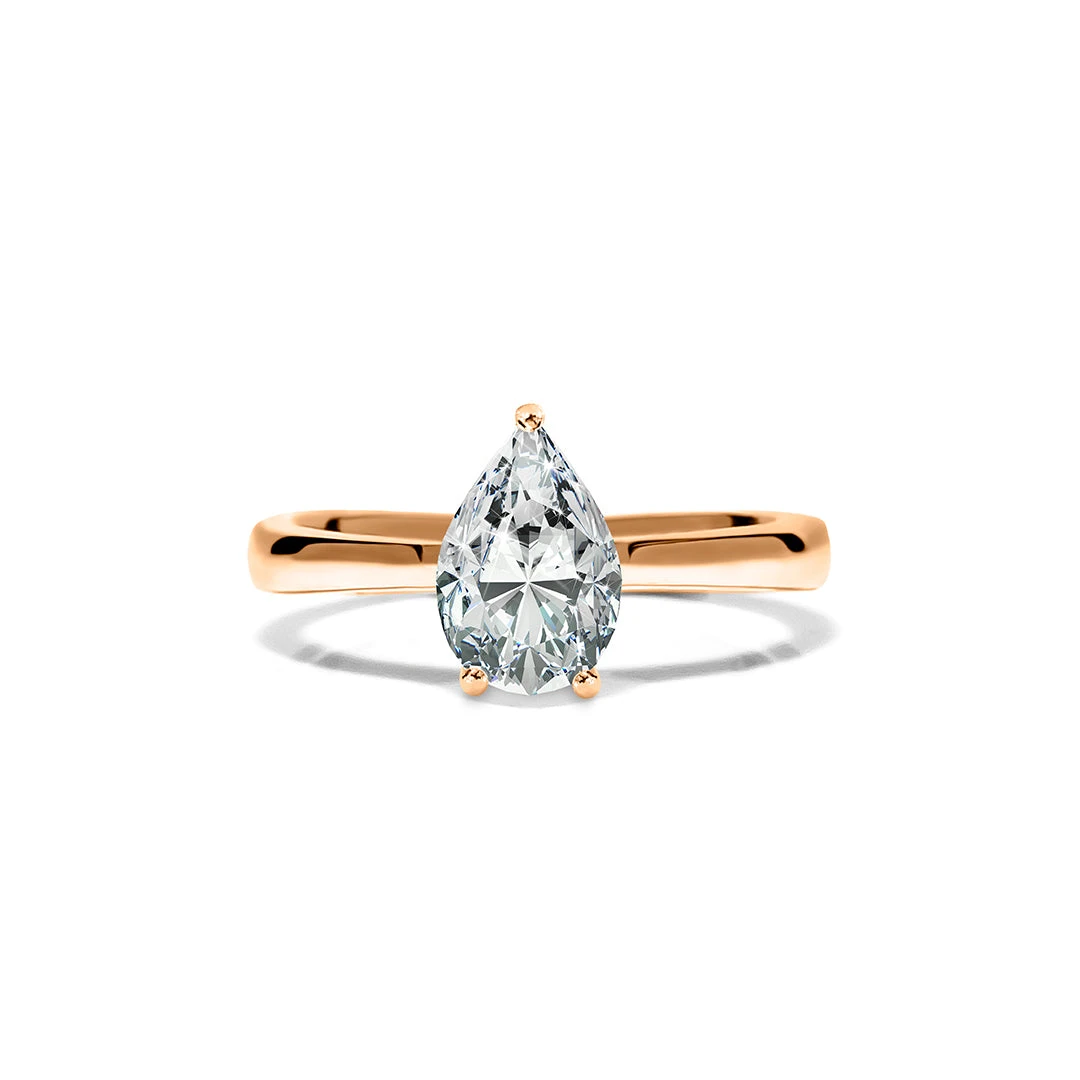 Timeless and elegant, this expertly cut pear shaped diamond ring represents sophistication and glamour. Designed in polished 18K rose gold, the glistening pear shape takes centre stage in a classic design that will never go out of style. Let this engagement ring be her most cherished gift of all.