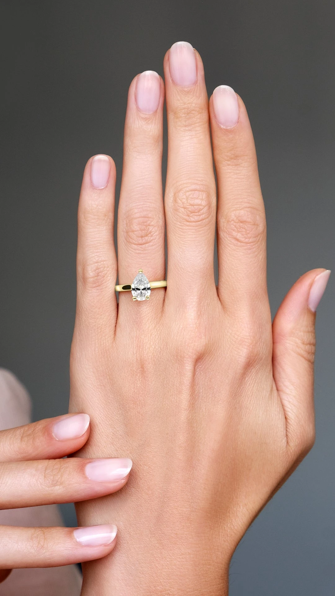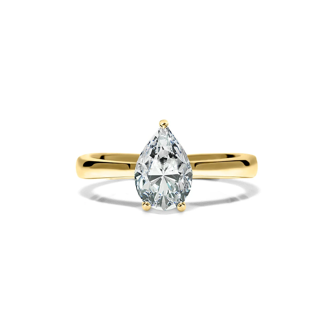 Timeless and elegant, this expertly cut pear shaped diamond ring represents sophistication and glamour. Designed in polished 18K yellow gold, the glistening pear shape takes centre stage in a classic design that will never go out of style. Let this engagement ring be her most cherished gift of all.