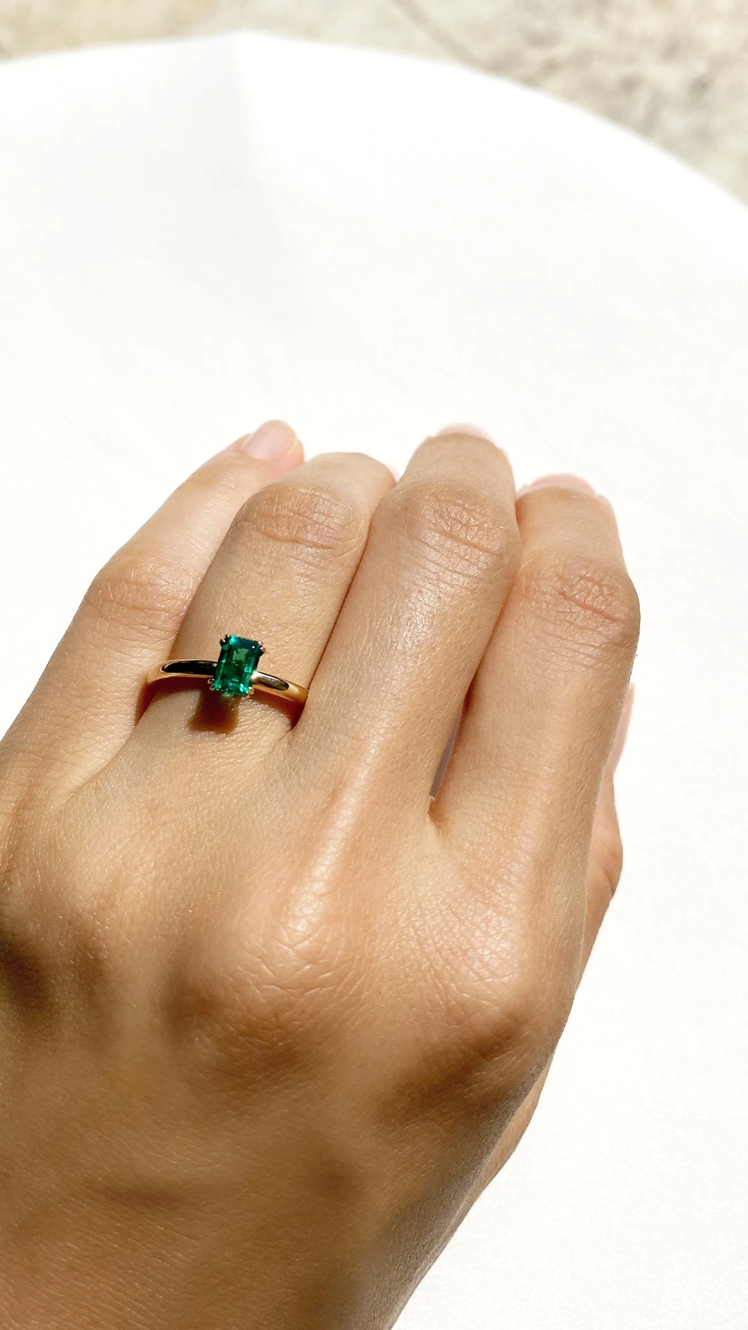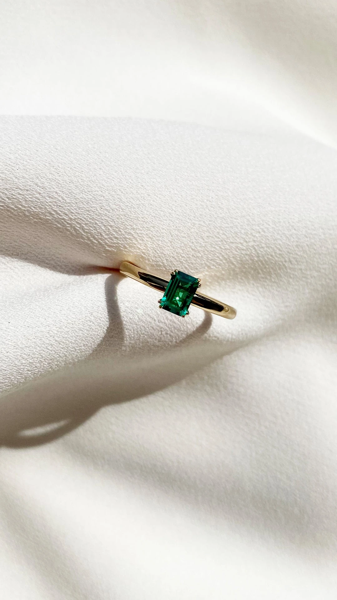 Beautifully crafted in solid 18k yellow gold, the lab-grown emerald stone is held by a subtle double claw setting.