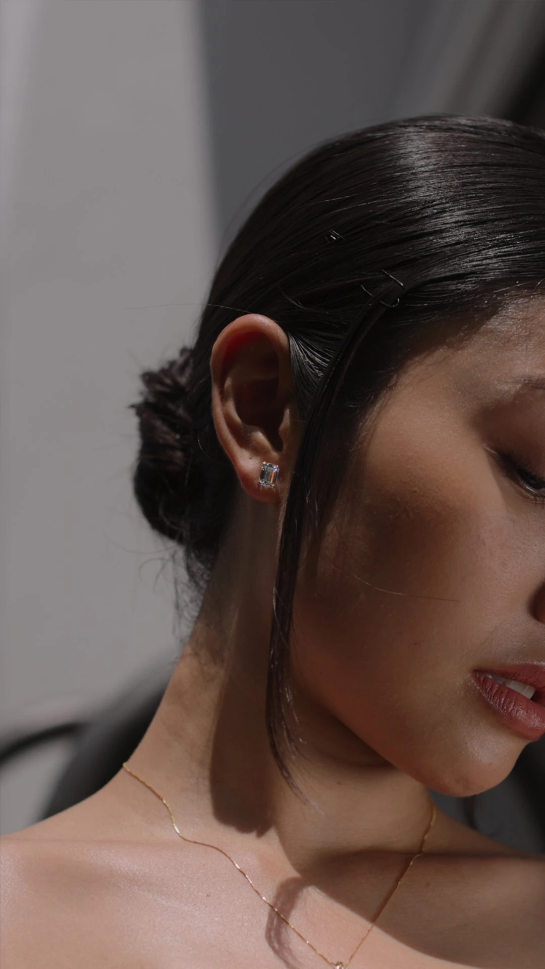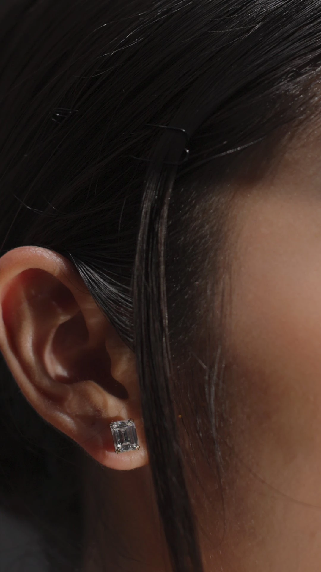 Designed with timeless elegance in mind, these classic studs will remain a staple pair for years to come. Crafted in 9K White Gold and featuring intricately cut and polished emerald-cut stones, these are the perfect pair to add a sophisticated touch to your look from day to night.