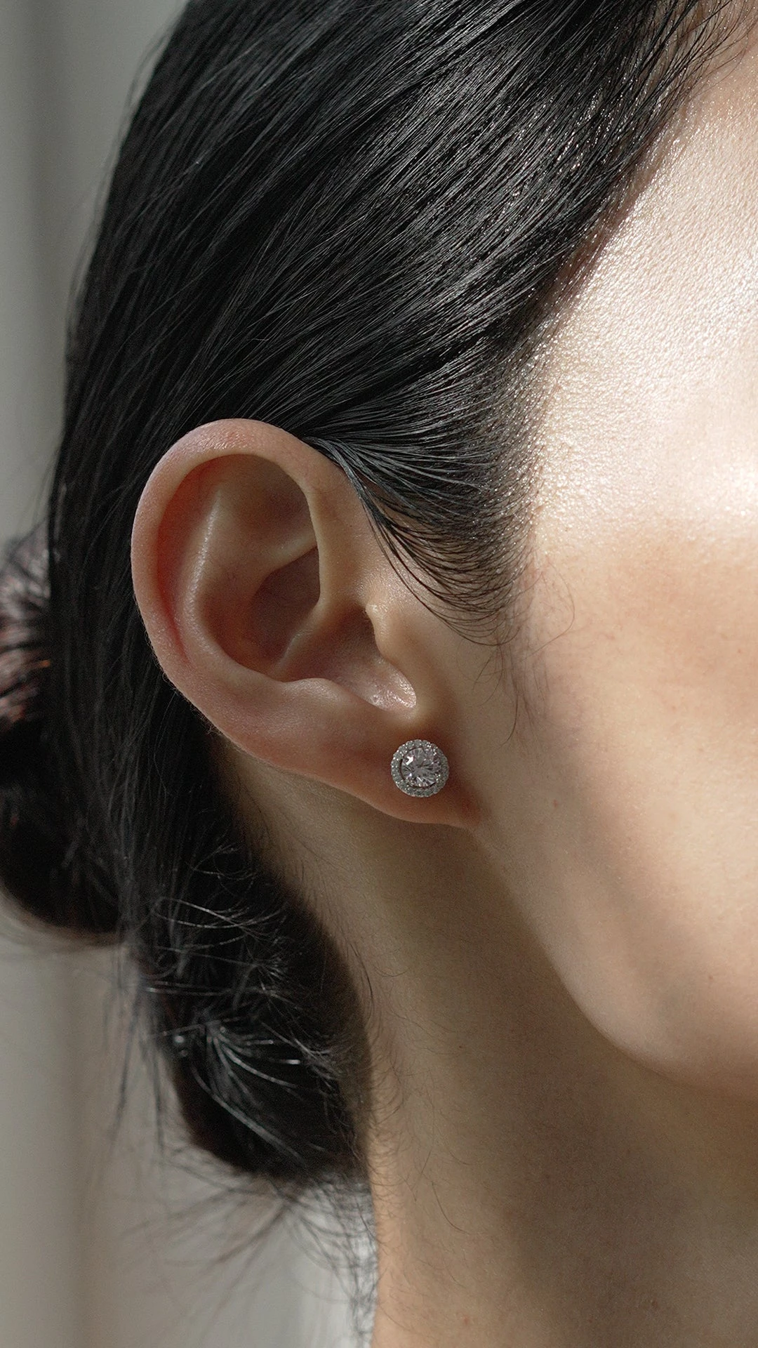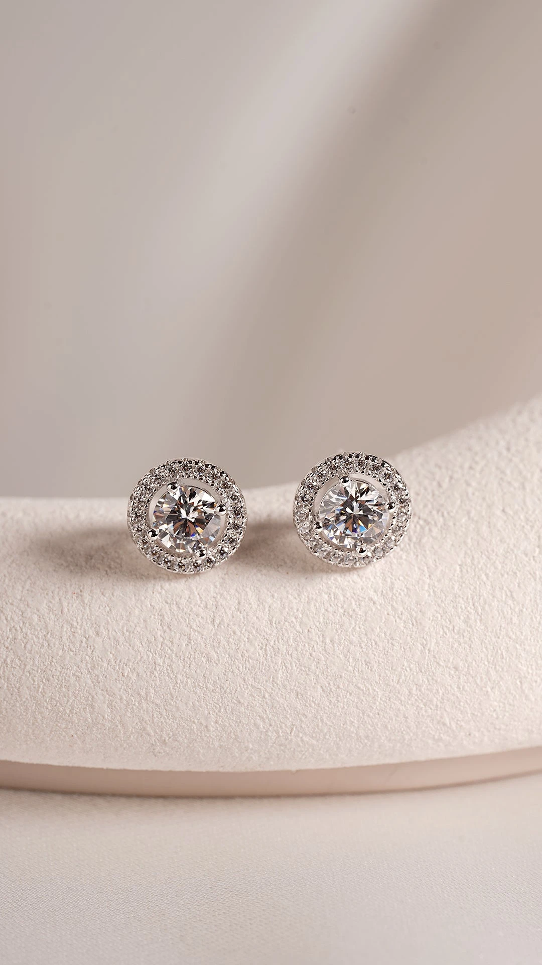 A classic design halo stud. This understated and stunning pair features glittering round brilliant-cut stones accented with a gentle halo. Wear them to add a pop of sparkle to your weekday outfits.