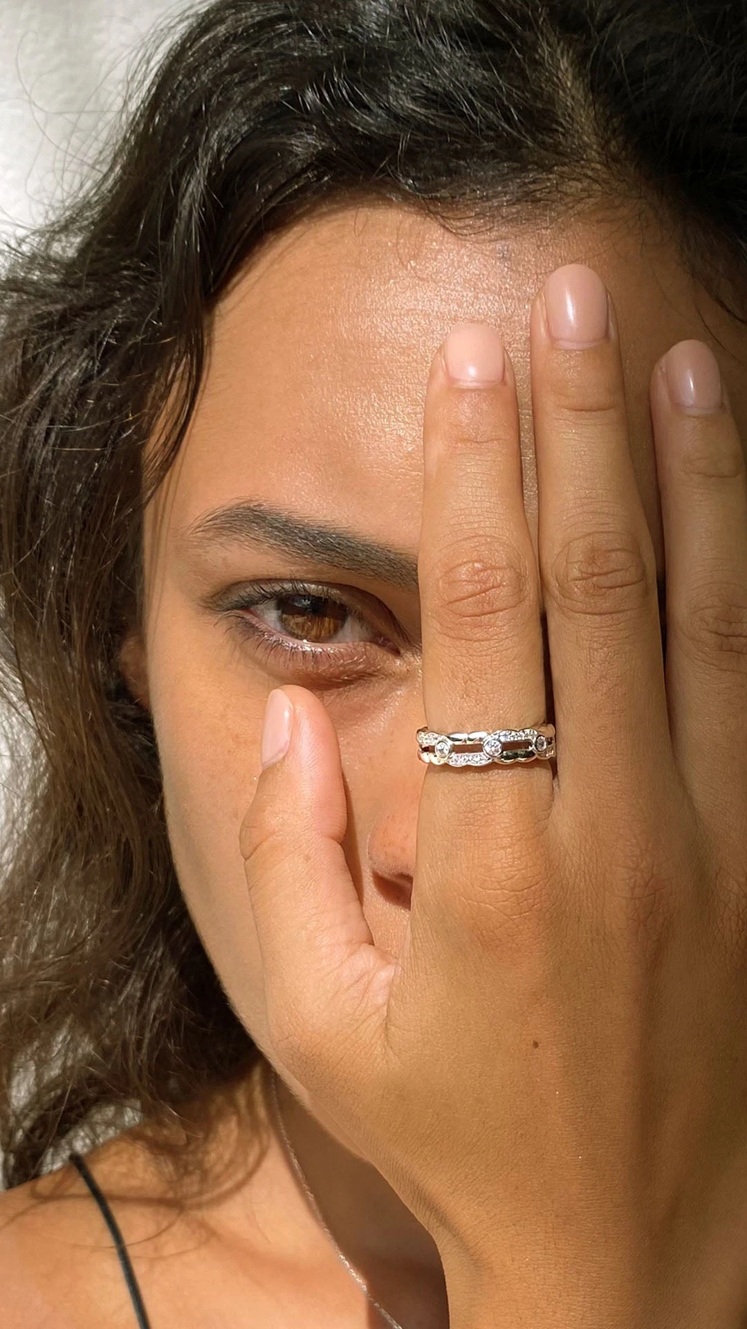 The whimsical Hamsa ring is comprised of a scalloped edge double ring joined by glittering bezel set diamonds set in polished 18K gold. We love it worn as an everyday statement piece. A beautiful ring part of the Gentle Diamonds collaboration with jewellery designer Margaux Durieux.