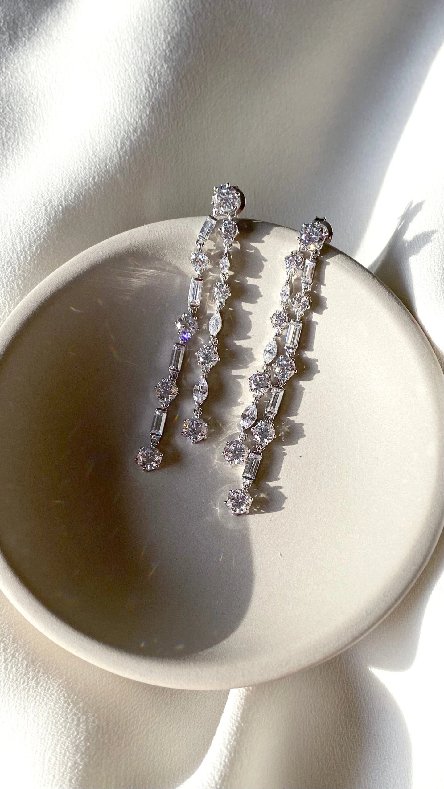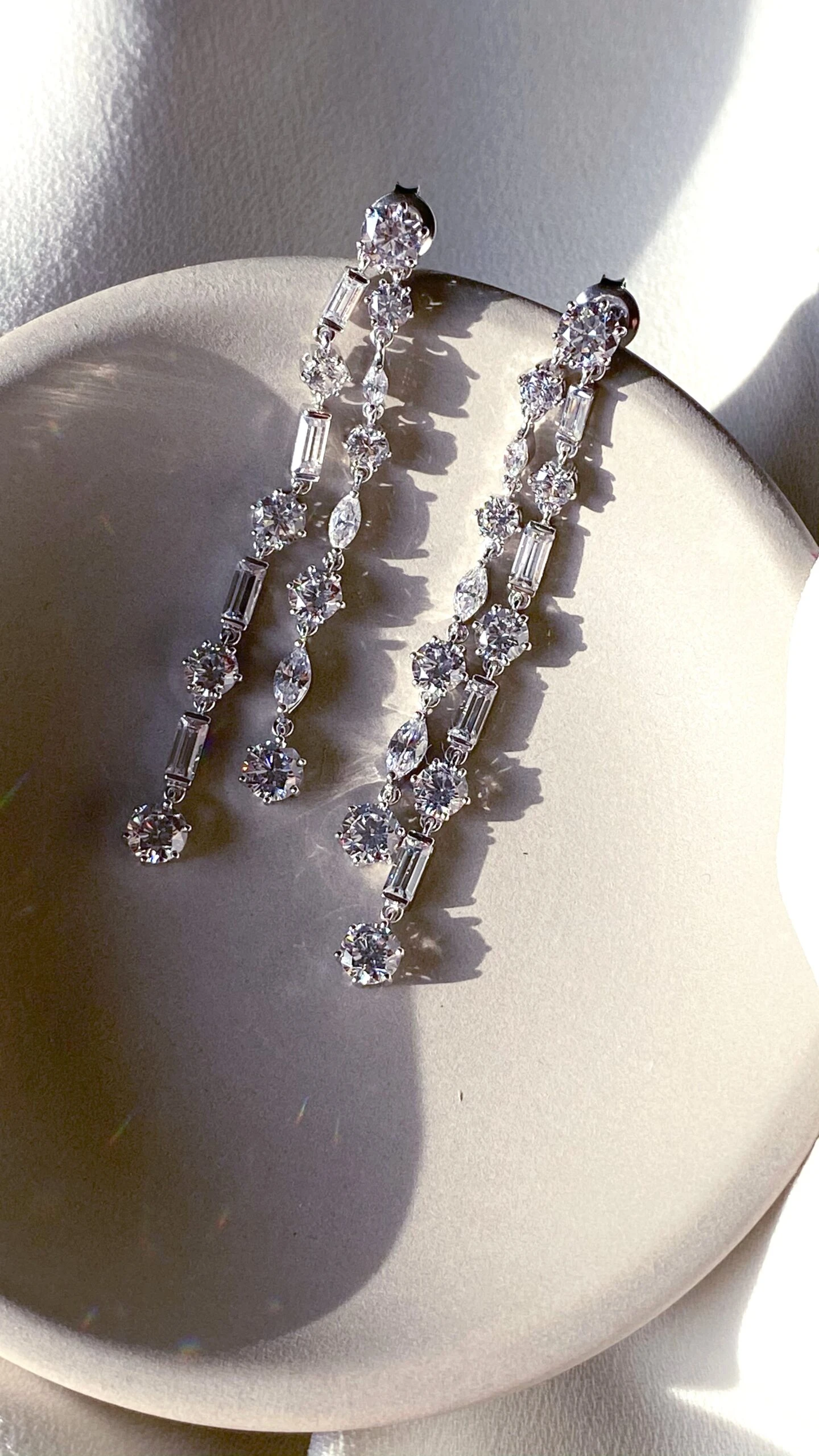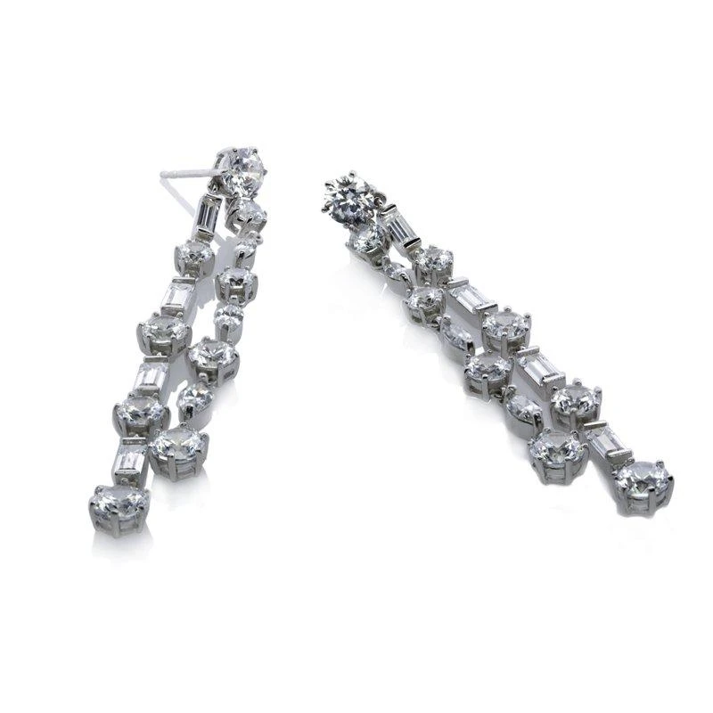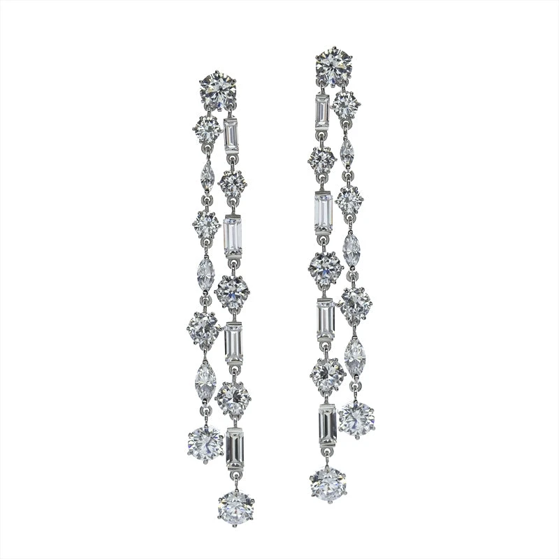 The Harmony drop earrings shine brilliantly with double strands of alternating round, marquise and emerald cut stones. These unique drops are sure be the centre of attention for your next night out.