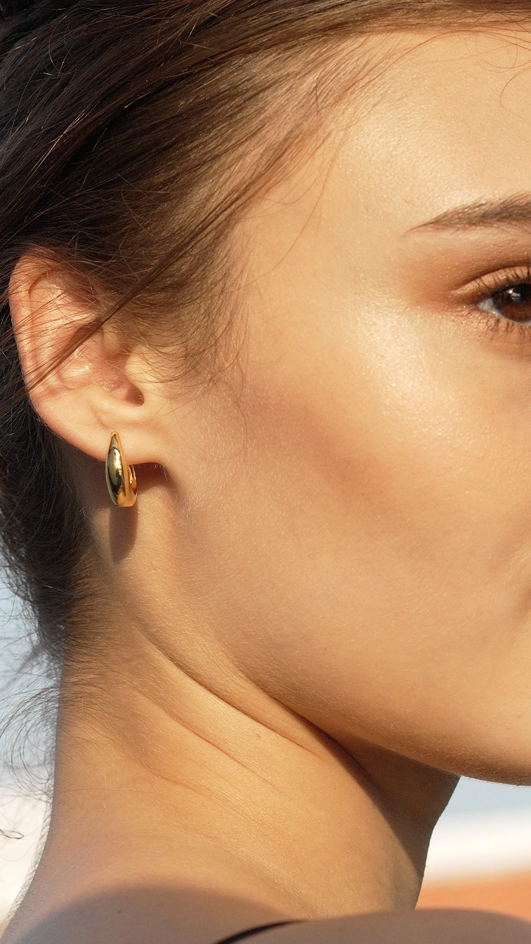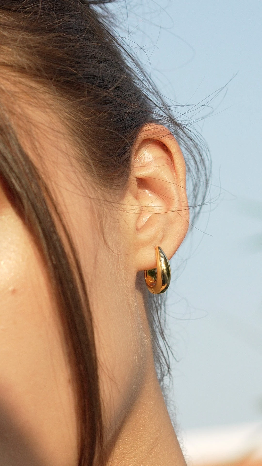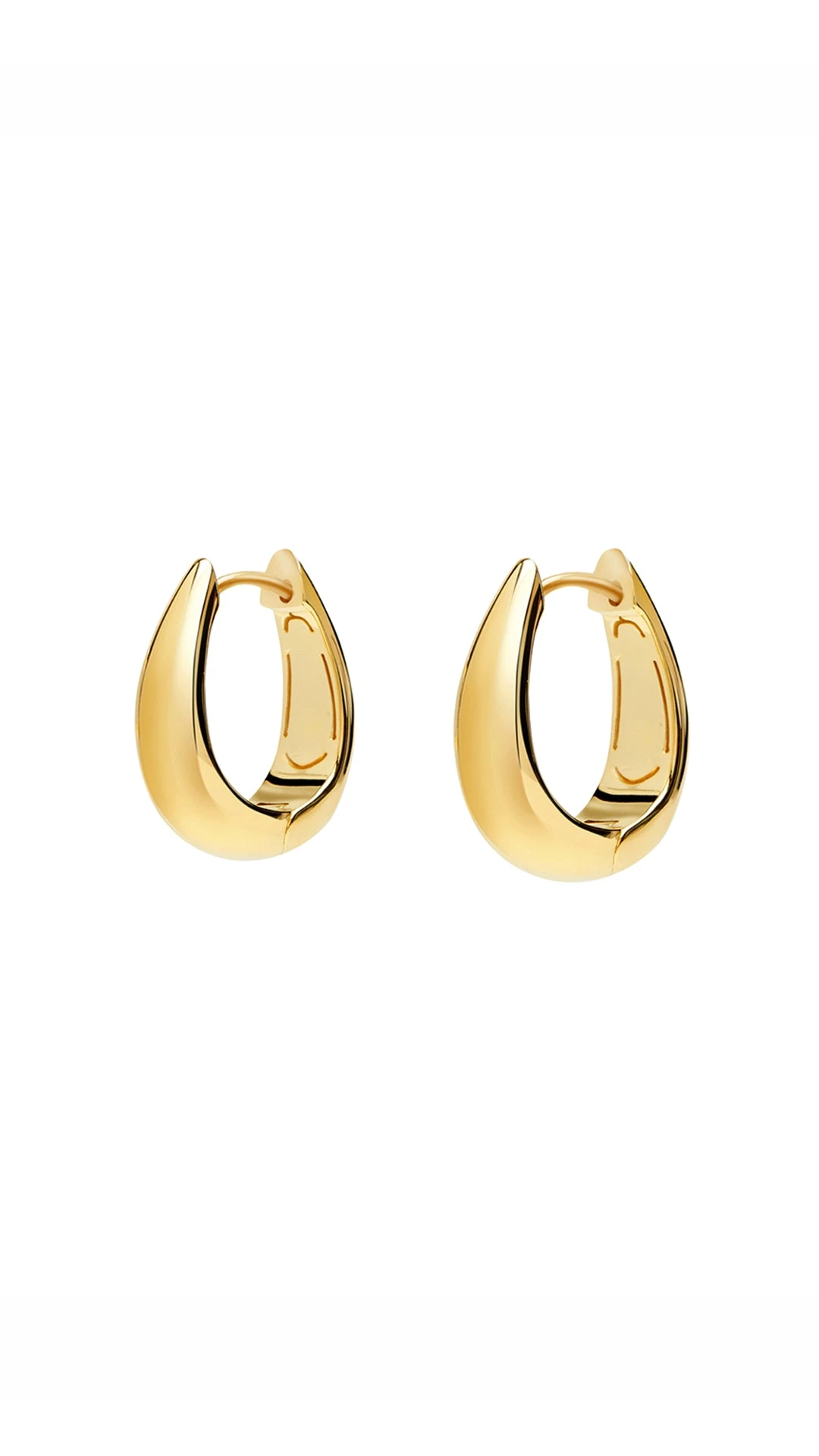 A classic gold hoop earring. The polished horseshoe shape feels elegant and timeless. A filled-in hoop feels slightly more weighted and elevated than other hollowed-out styles. They are finished with a slick, secure closure design. Wear confidently all day, every day.