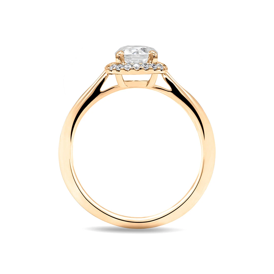 The Izzy ring is a captivating solitaire diamond ring. It features a glittering oval cut diamond accented with a halo, set in 18K gold. She will cherish this enchanting ring for years to come.