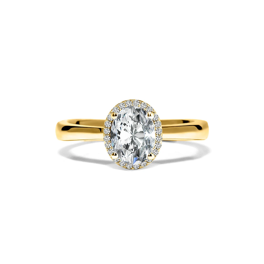 The Izzy ring is a captivating solitaire diamond ring. It features a glittering oval cut diamond accented with a halo, set in 18K gold. She will cherish this enchanting ring for years to come.