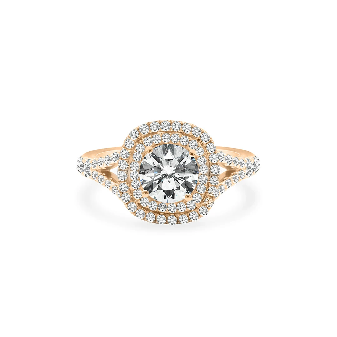 This ring is a stunning piece comprised of a beautiful round brilliant diamond complimented by a double halo of smaller diamonds. The ring is further enhanced by diamond microsettings placed halfway alongside the band. Handcrafted with an elevated setting in 18ct rose gold to catch the light from all angles. Make this exquisite ring the one she will cherish for a lifetime.