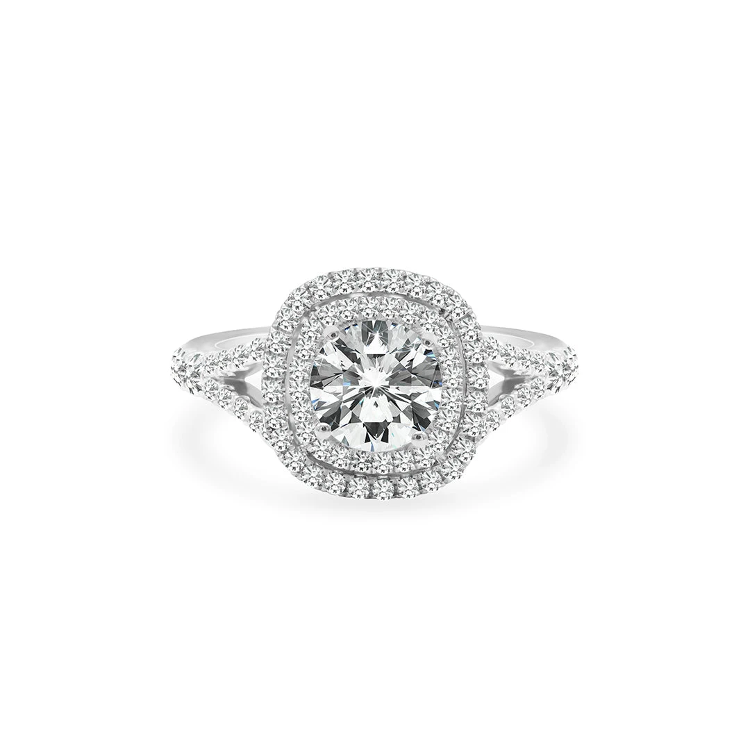 This ring is a stunning piece comprised of a beautiful round brilliant diamond complimented by a double halo of smaller diamonds. The ring is further enhanced by diamond microsettings placed halfway alongside the band. Handcrafted with an elevated setting in 18K white gold to catch the light from all angles. Make this exquisite ring the one she will cherish for a lifetime.