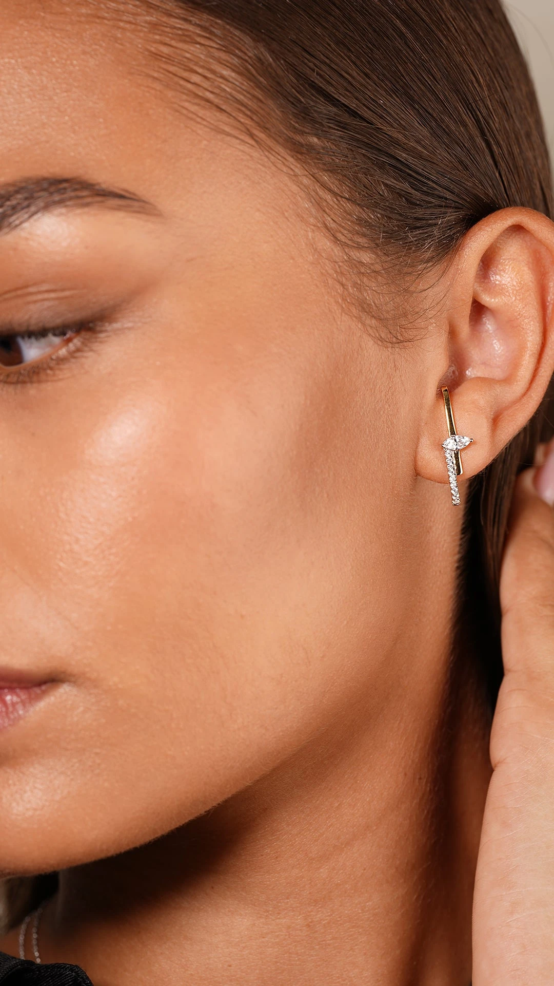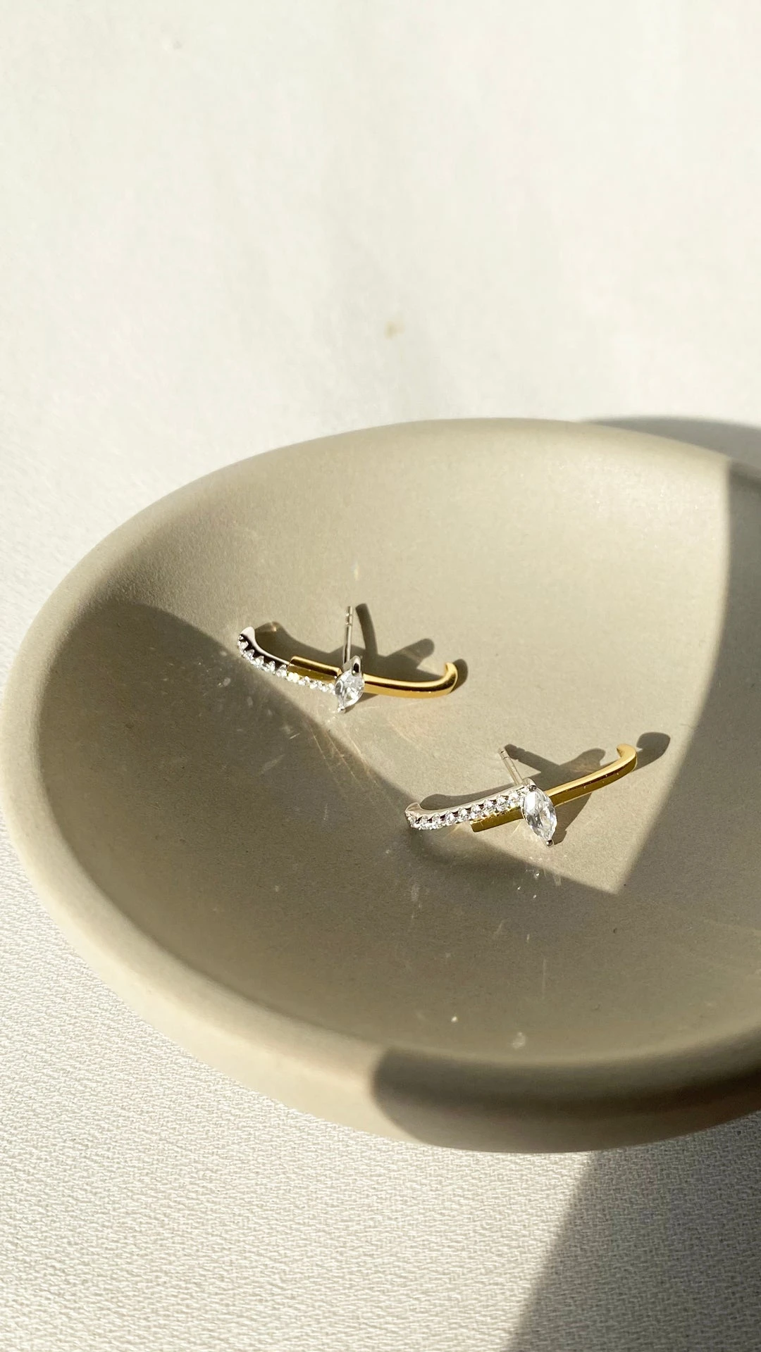 Prepare to receive compliments with the Kina Earrings. They feature a marquise stone, two-tone polished white and yellow gold bar, and a dainty row of micro settings.