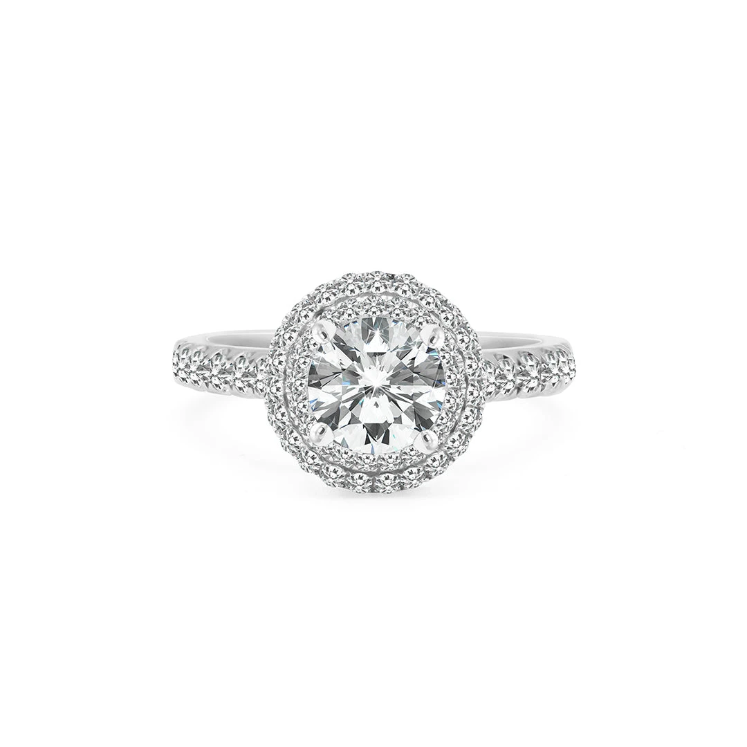 This ring is comprised of a beautiful round brilliant diamond that sparkles from every angle surrounded by a double halo of smaller diamonds. The ring is further enhanced by diamond microsettings placed halfway alongside the band. Handcrafted with an elevated setting in 18K white gold. Make this ring the one she will cherish for a lifetime.