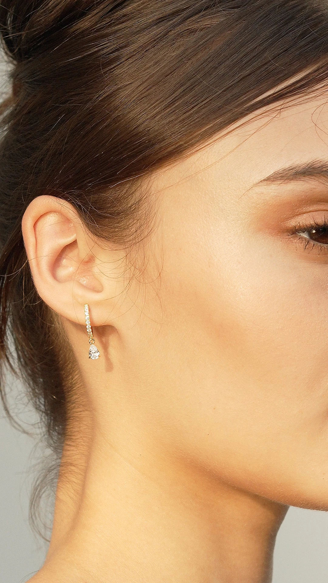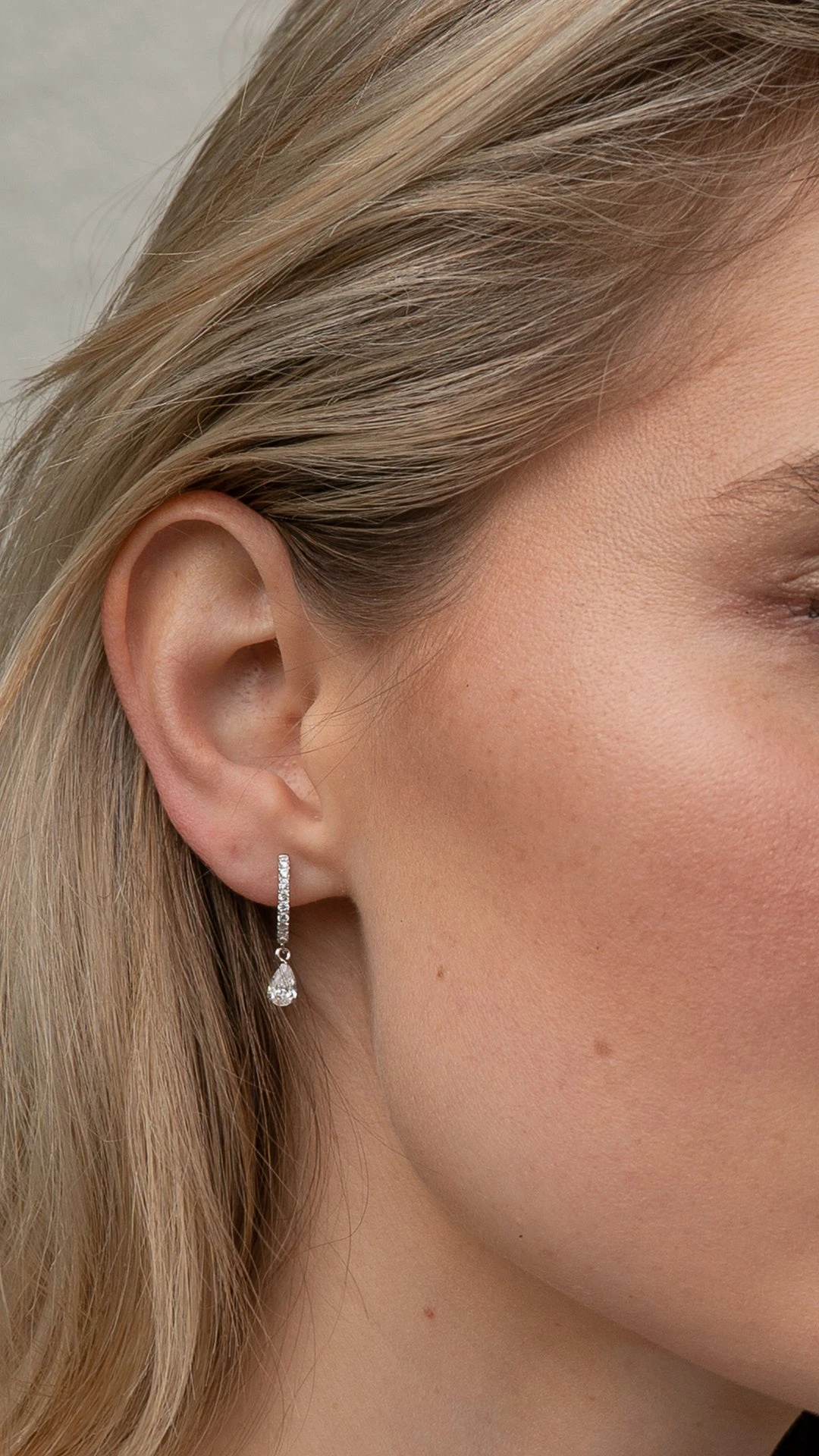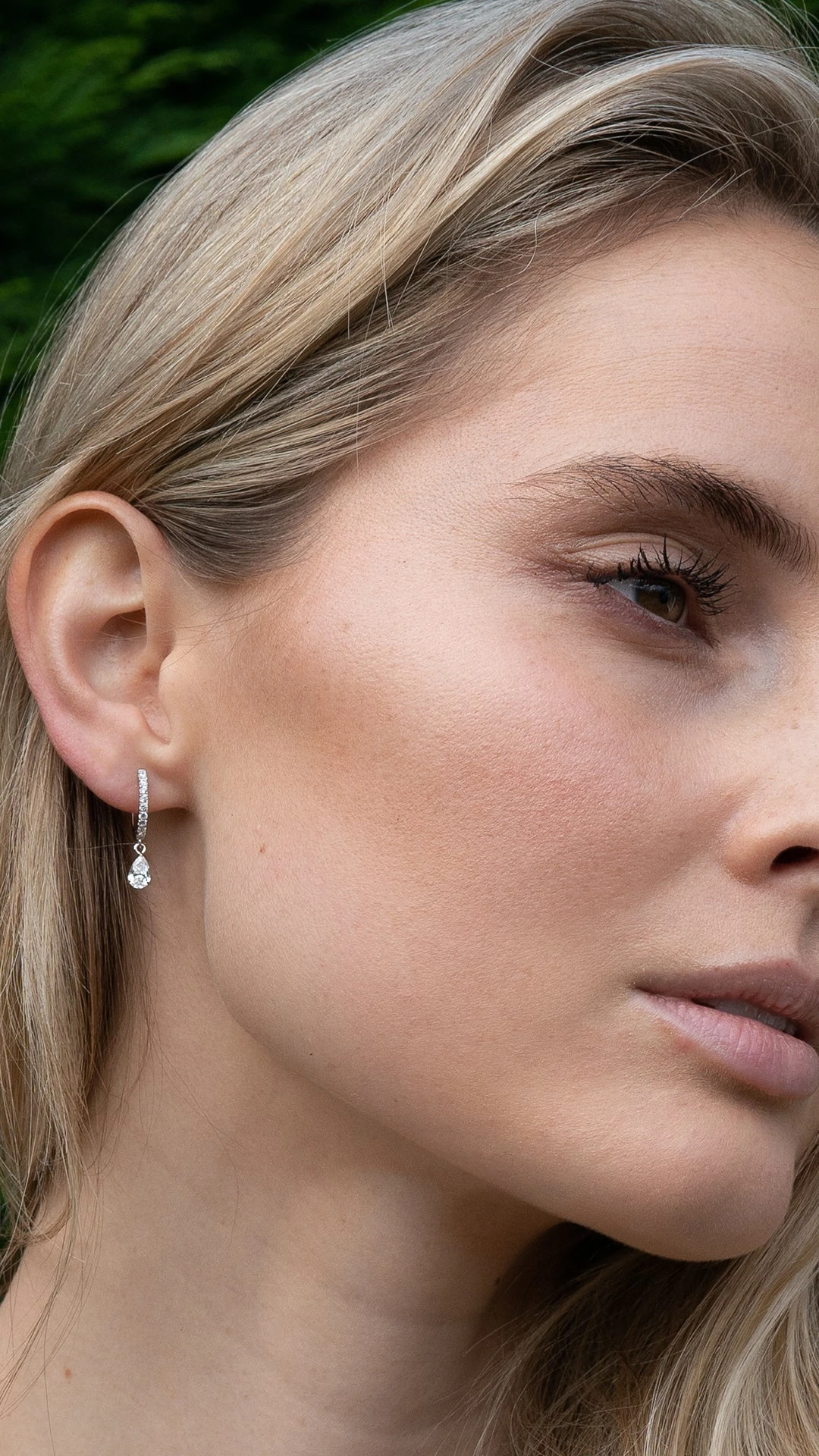 The Leni Hoops are lined with a detailed round micro setting and are finished with a hand-cut pear drop in brilliant white. Easy to wear from day to night.